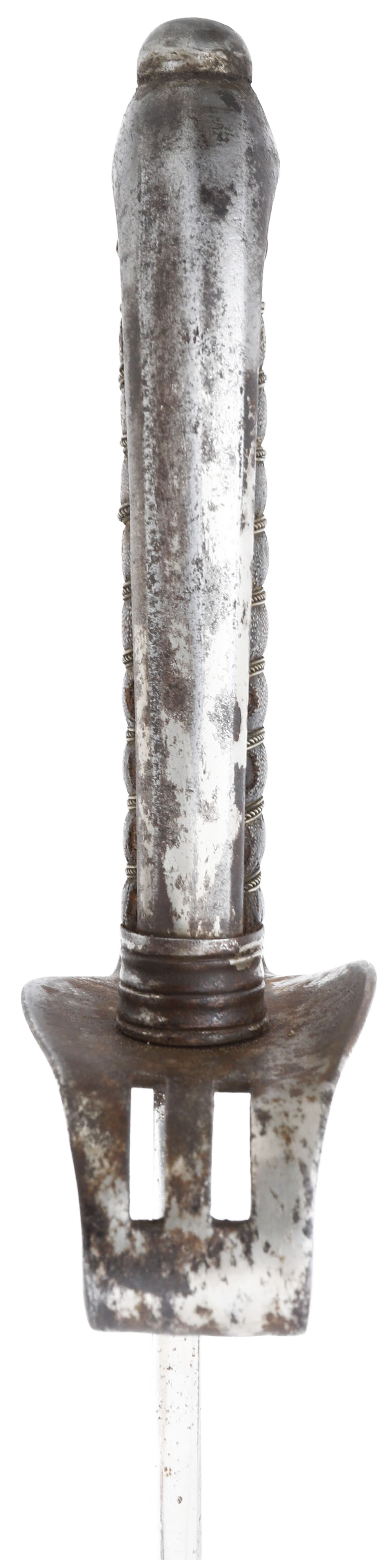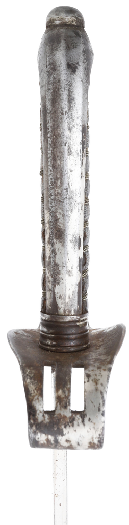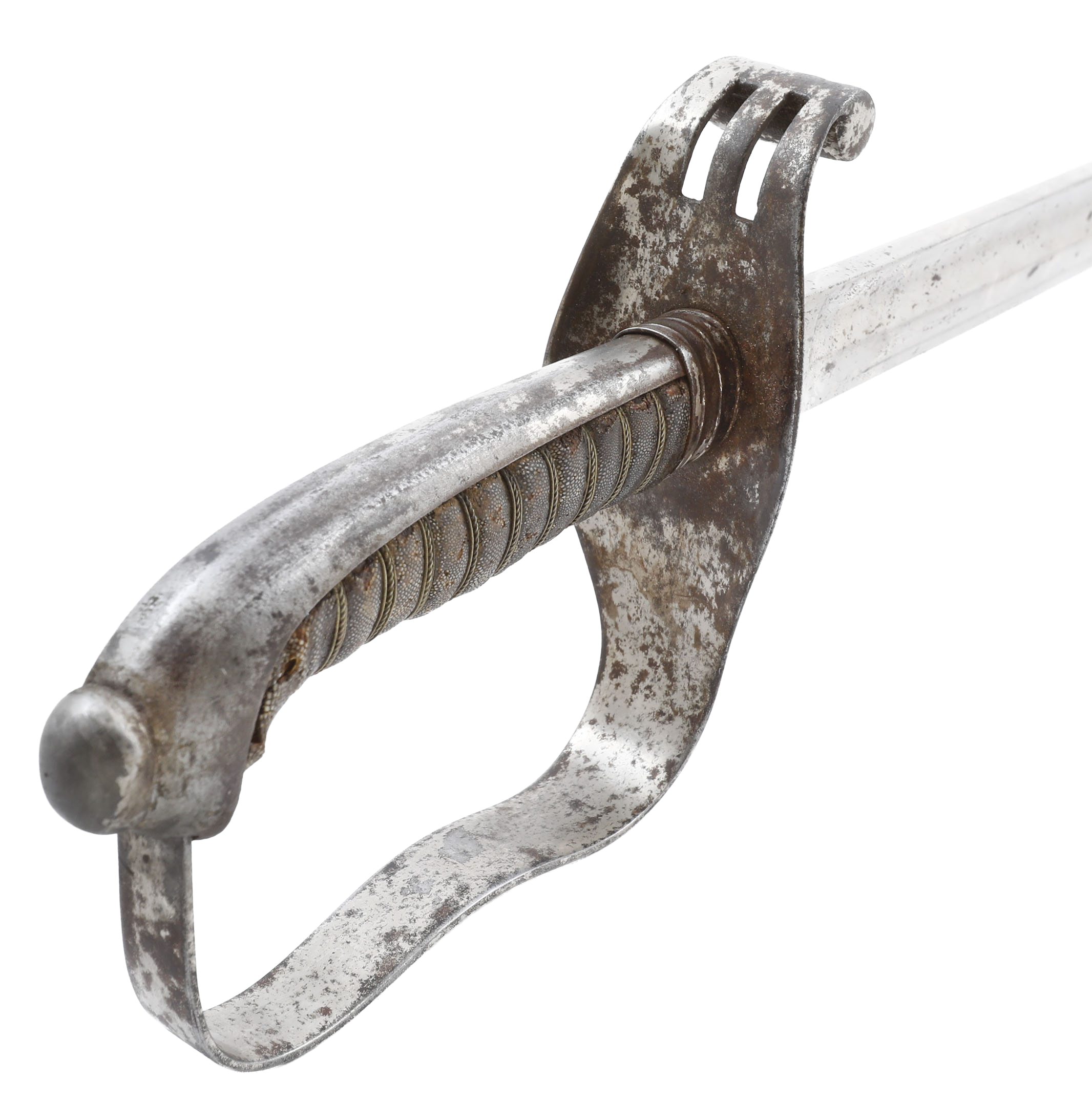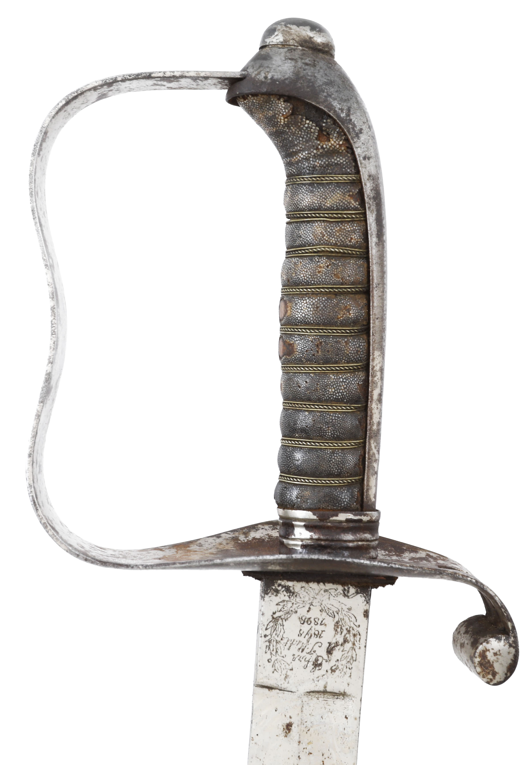 Iron hilt with double slotted guard. Brass wire wrapped ray skin grip (small loss at the heel). 29 3/4” slightly curved broad fullered blade with dedication at the forte: Ehre (honor) W T Flicht 1878-1898, commemorating his service upon retirement. Reverse with E JUNG, Vienna sword maker. Hilt shows most original plating with uniform smooth brown patina to the balance. Iron scabbard complete, with remnants of plating.
