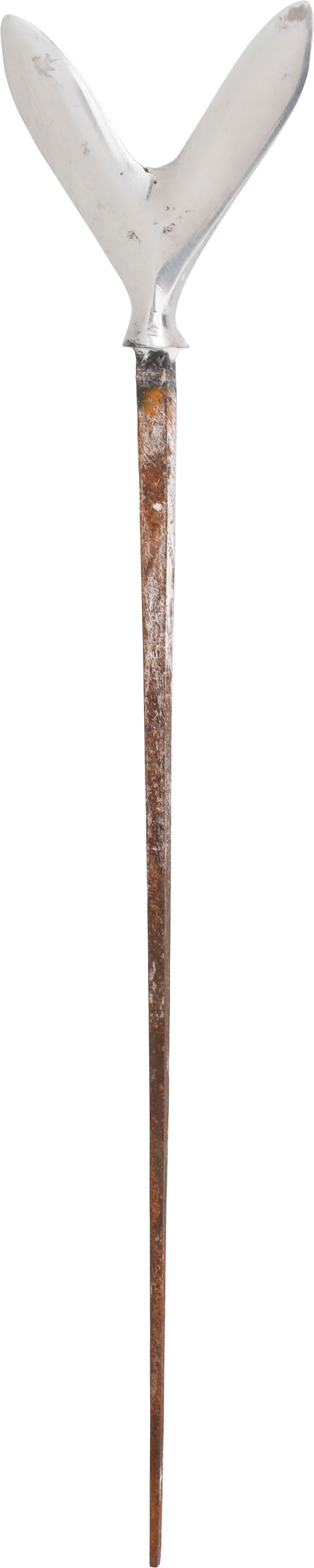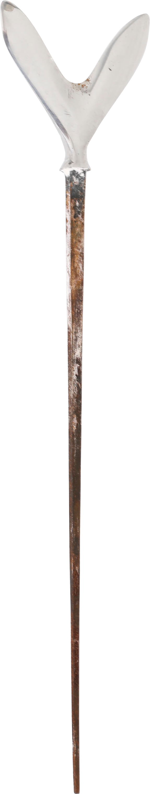 Edo Period. 7” length. Dual points, each medially ridged and converging at the base. See Glossary of the Construction, Decoration and use of Arms and Armor, Stone fig.862 #6. Tapered tang. These were used ceremonially and as votives. These are sometimes encountered in pairs within sets of 18 Samurai arrows. The point crisp with slight gray patina.