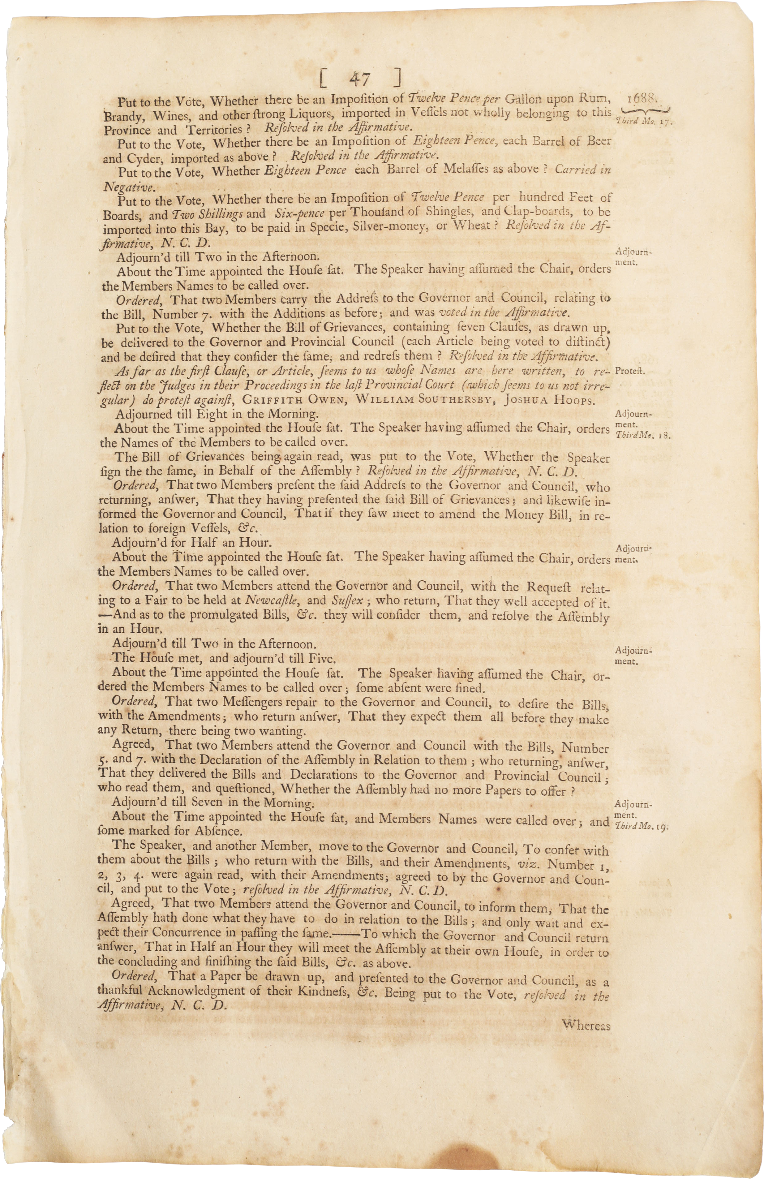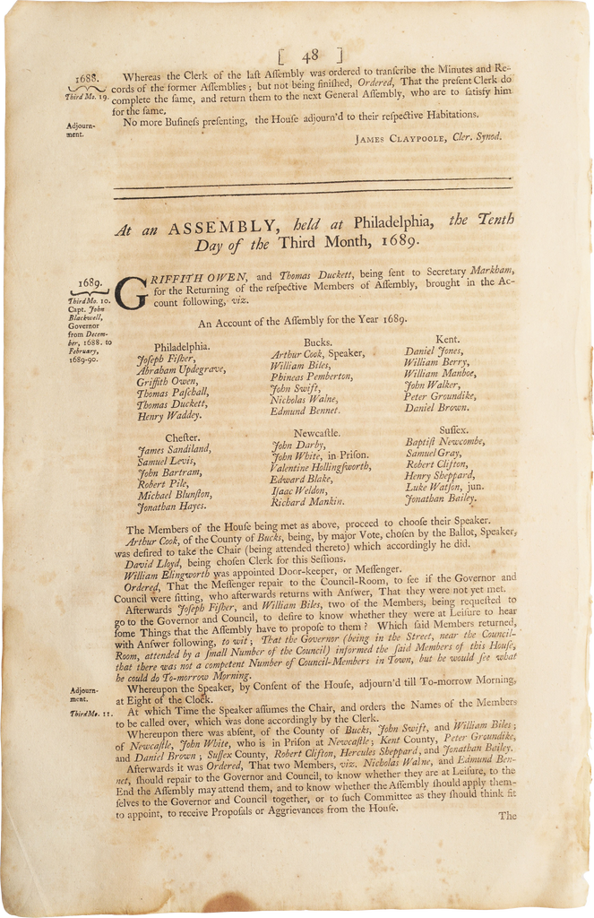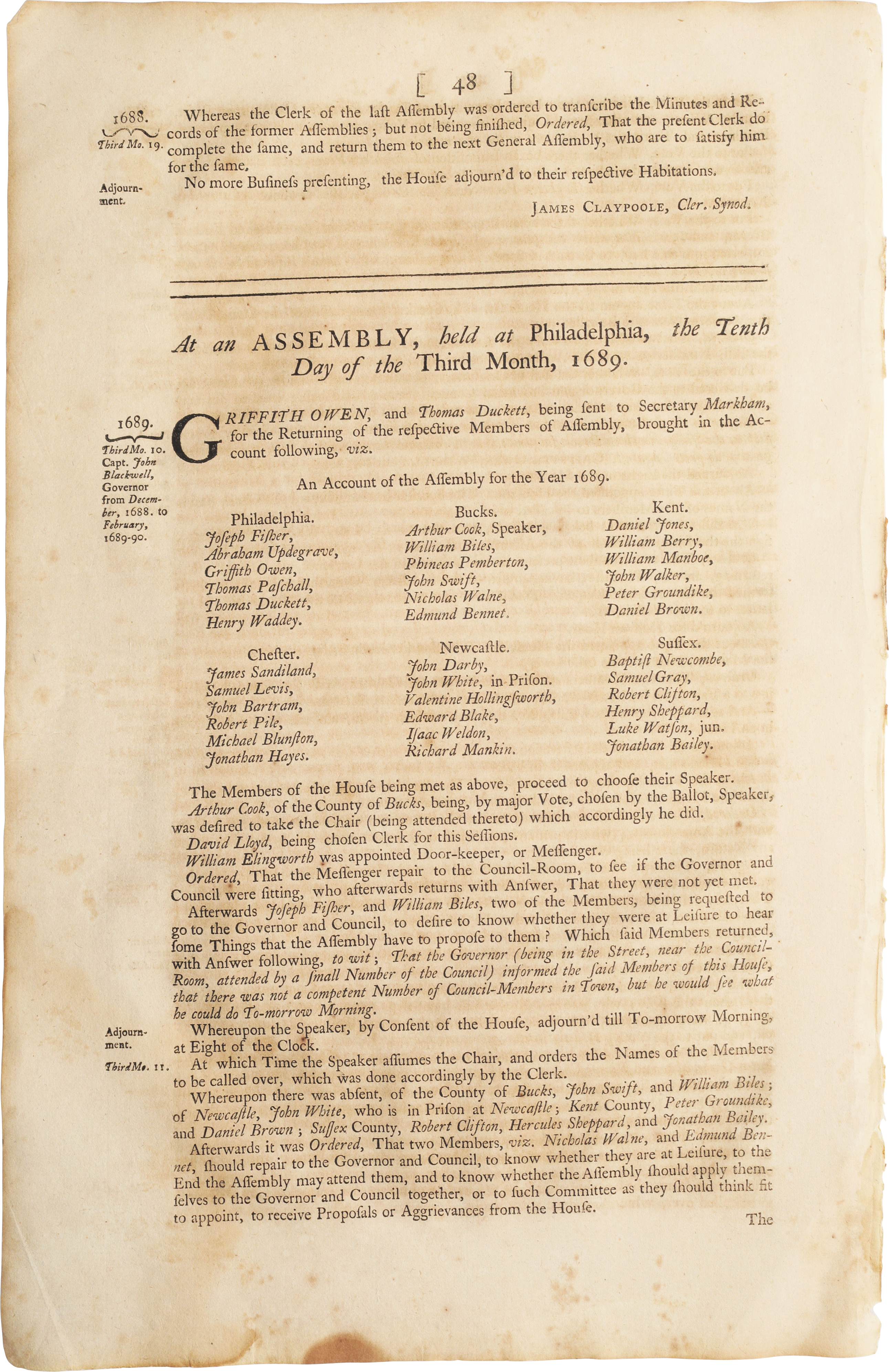 Votes and Proceedings of the House of Representatives of the Province of Pennsylvania. Beginning the Fourth Day of December 1682. First edition of the first volume of three published by Franklin in 1752 covers the political history of Pennsylvania from 1682 up to 1744, including several of the acts that brought Pennsylvania into existence. Large size, 9 5/8” x 14”. Frameable and a wonderful office display for a lawyer, politician, public servant, or of course, printer.
