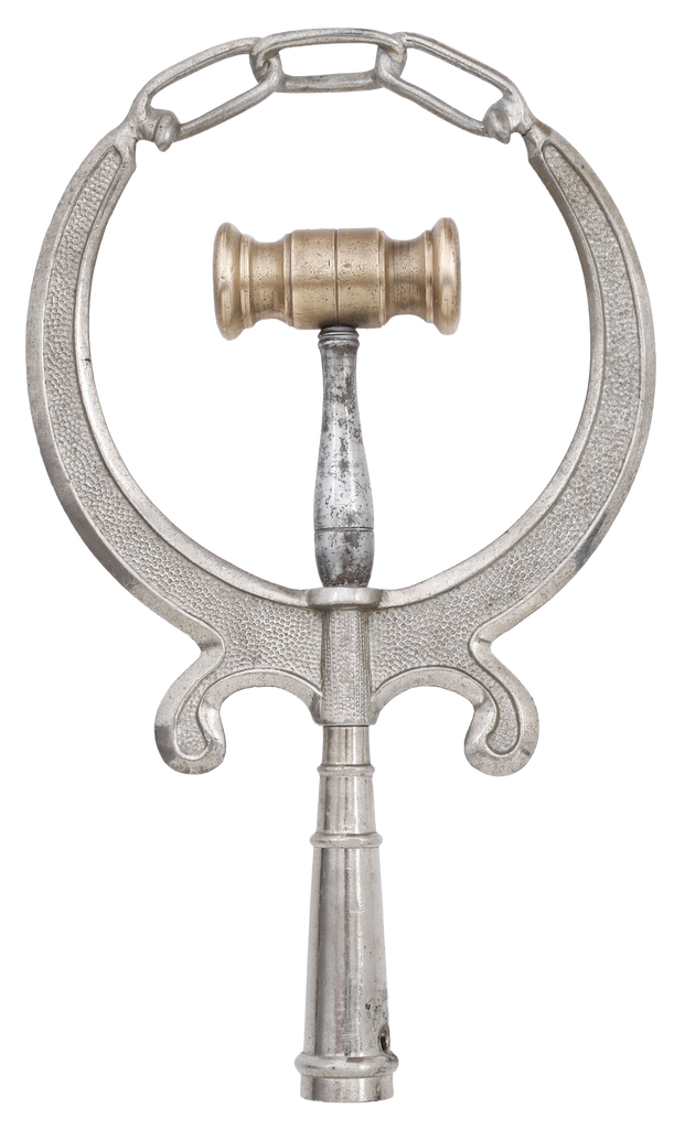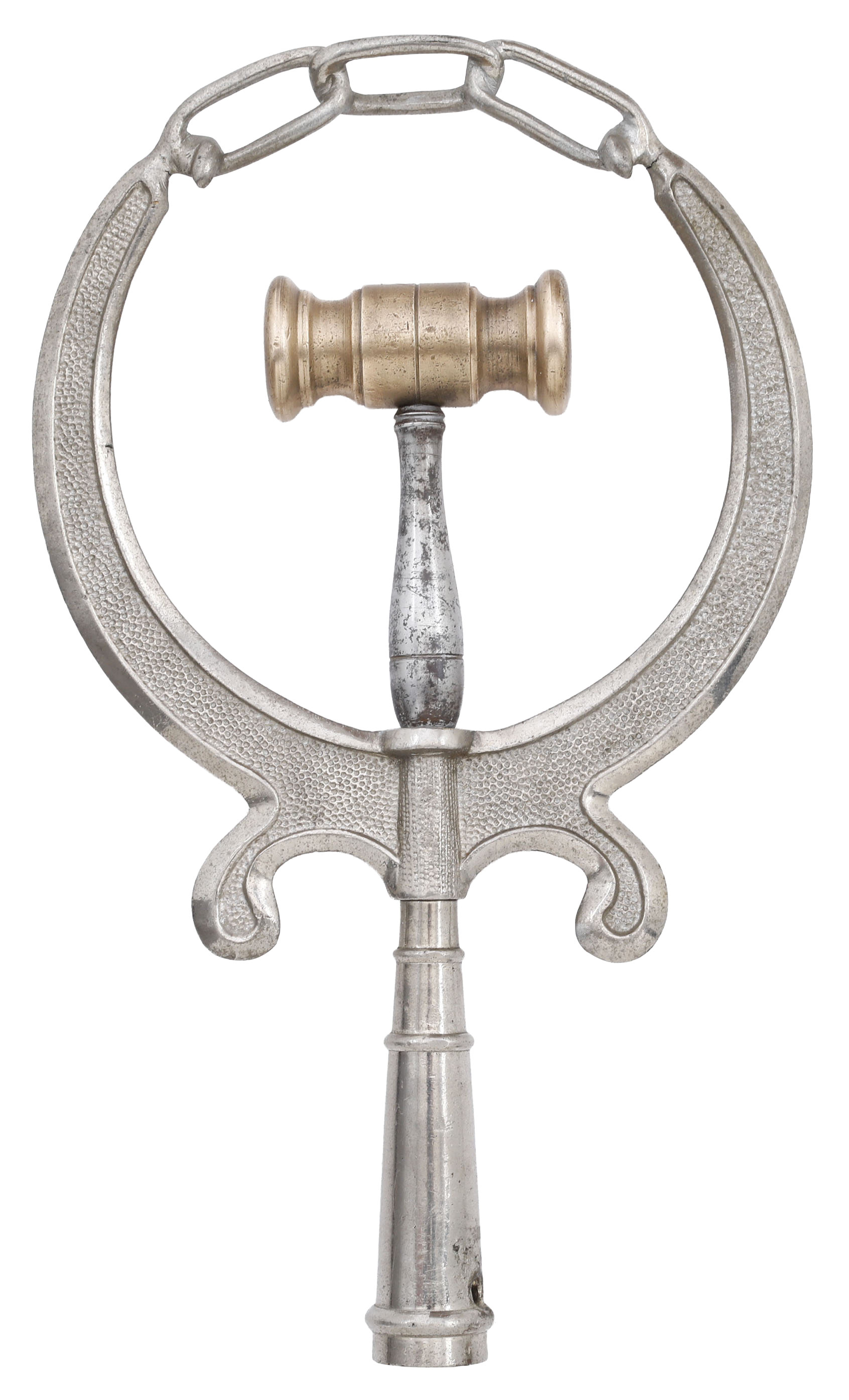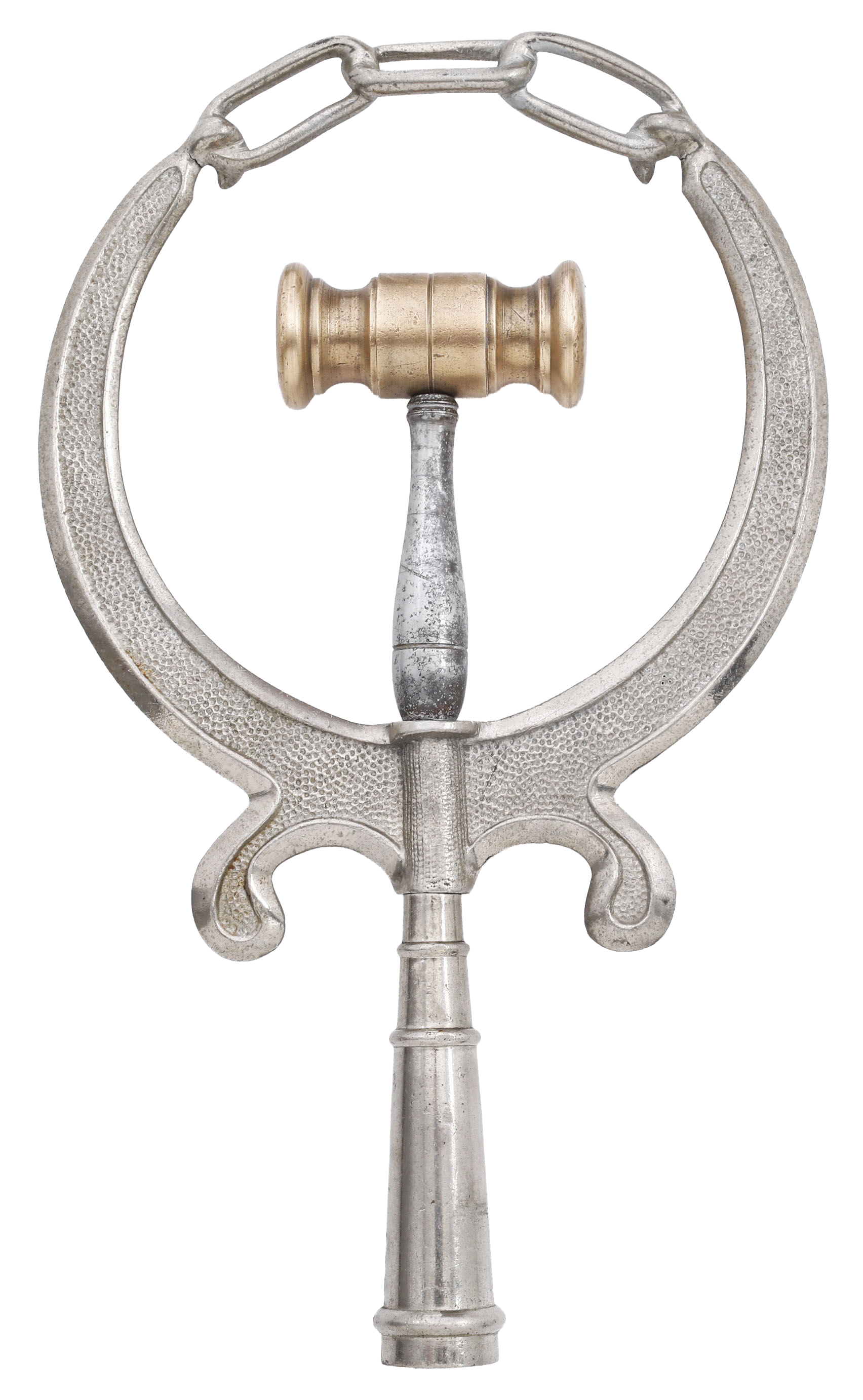 Nickel plated brass formed as a hammer signifying justice on elaborate curvilinear support. Originally on a six foot staff. ¾” replacement available at Lowes. These staffs were carried by members of secret societies as well as political supporters for rallies which took place throughout America.