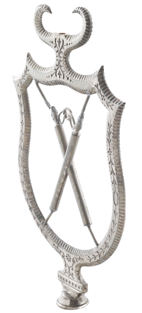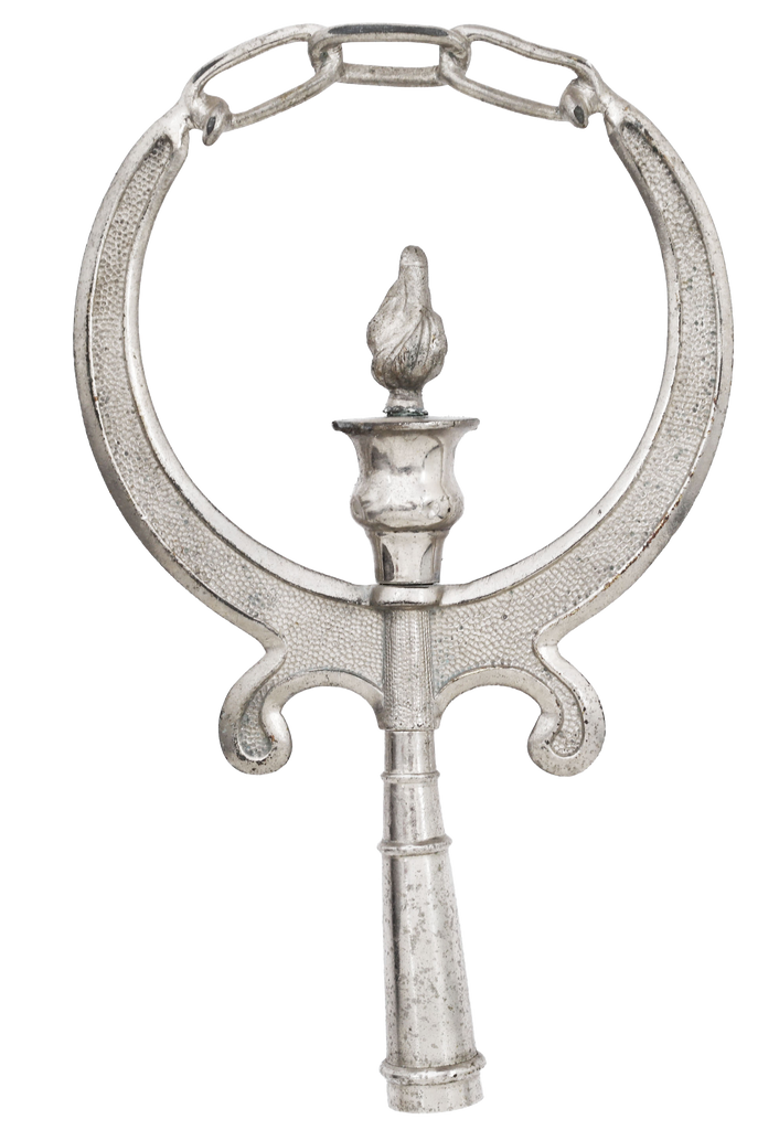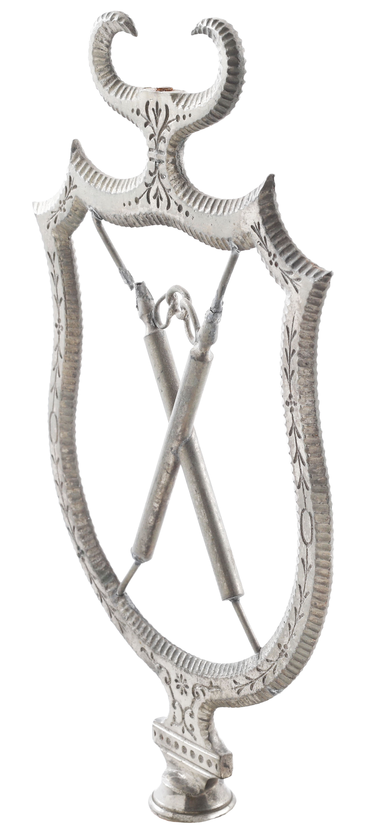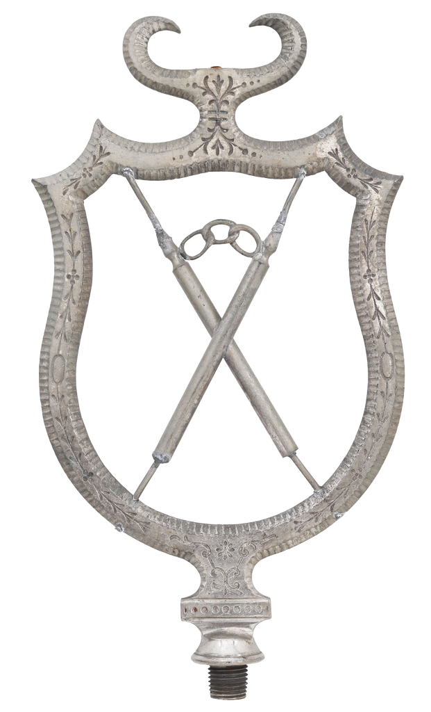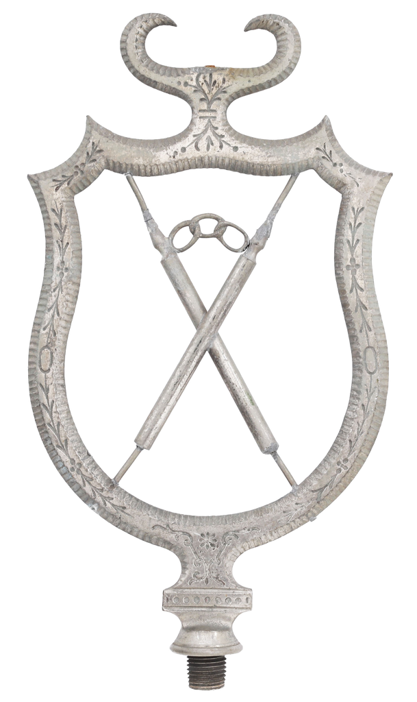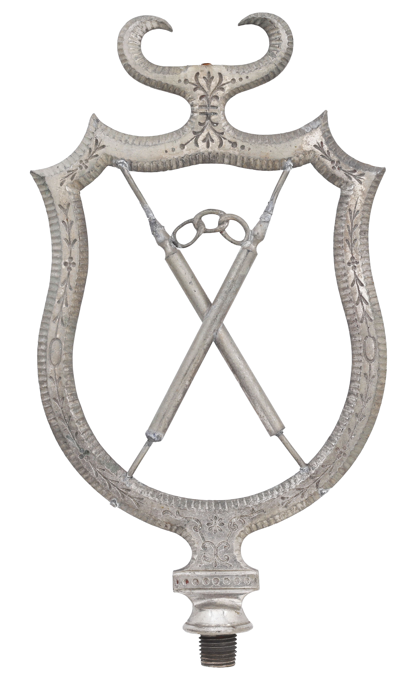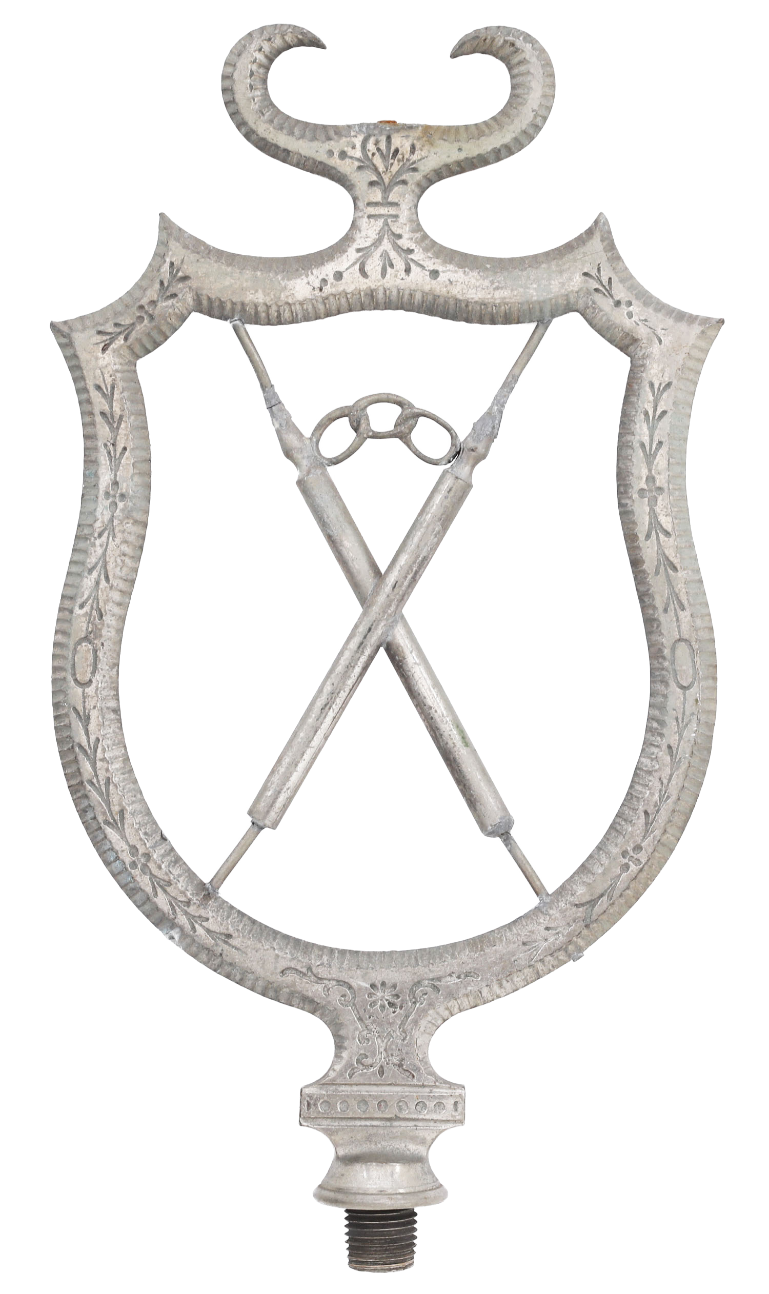 Two items. 10 ¼” with Liberty torch, plated. And 8 ¾” with crossed spears (?), soldered cracks. Originally on staffs (simply replaced) and carried in the rituals and public parades of the 19th century American Secret Societies.