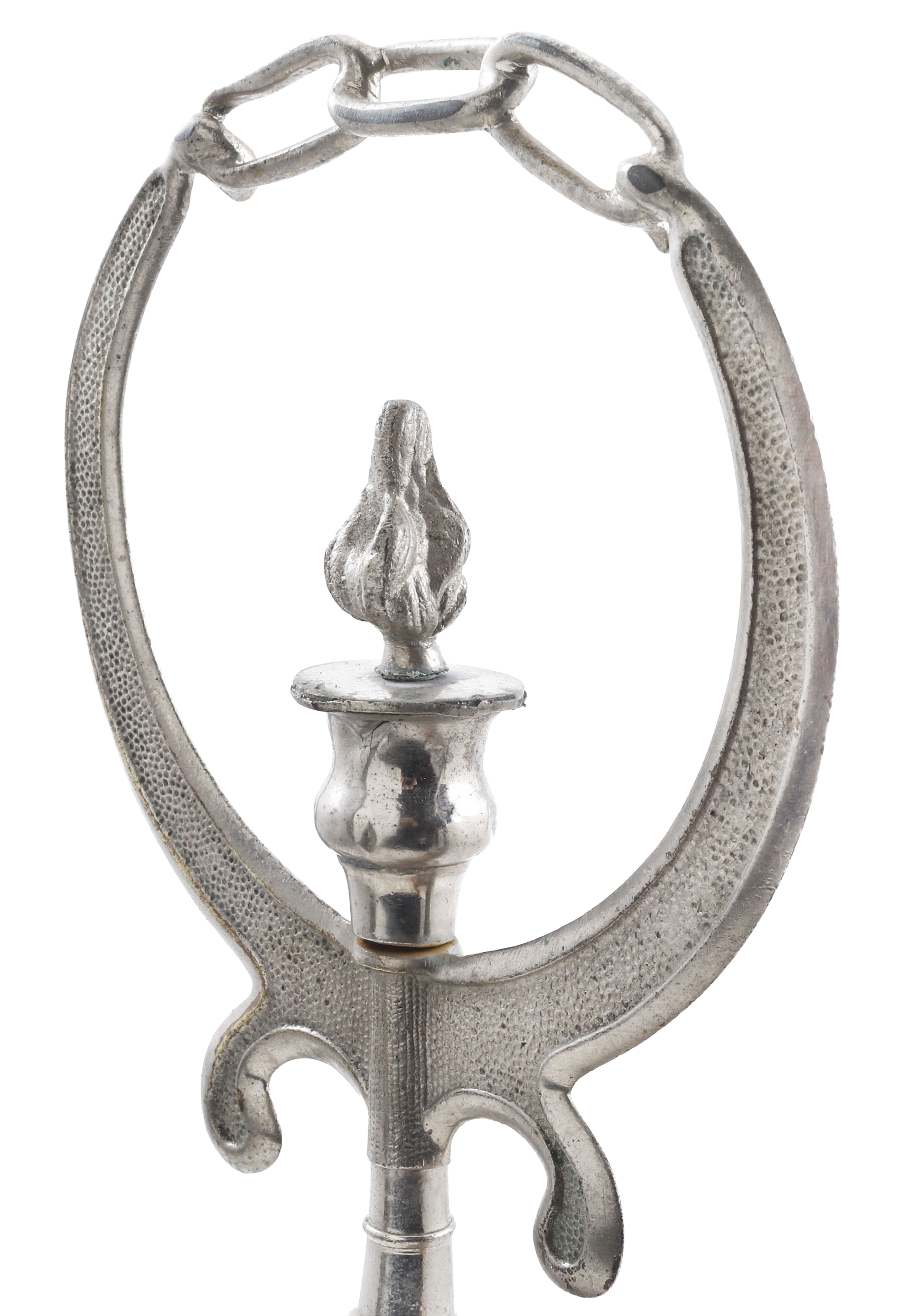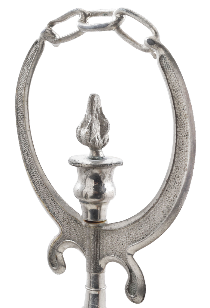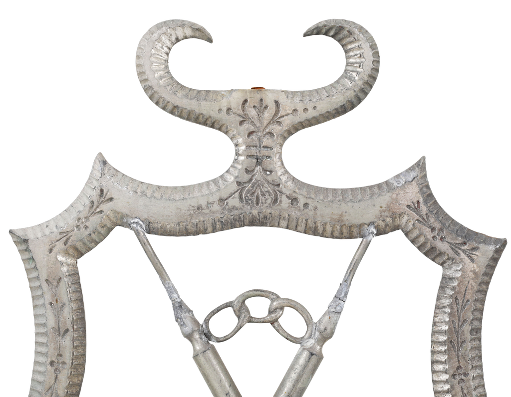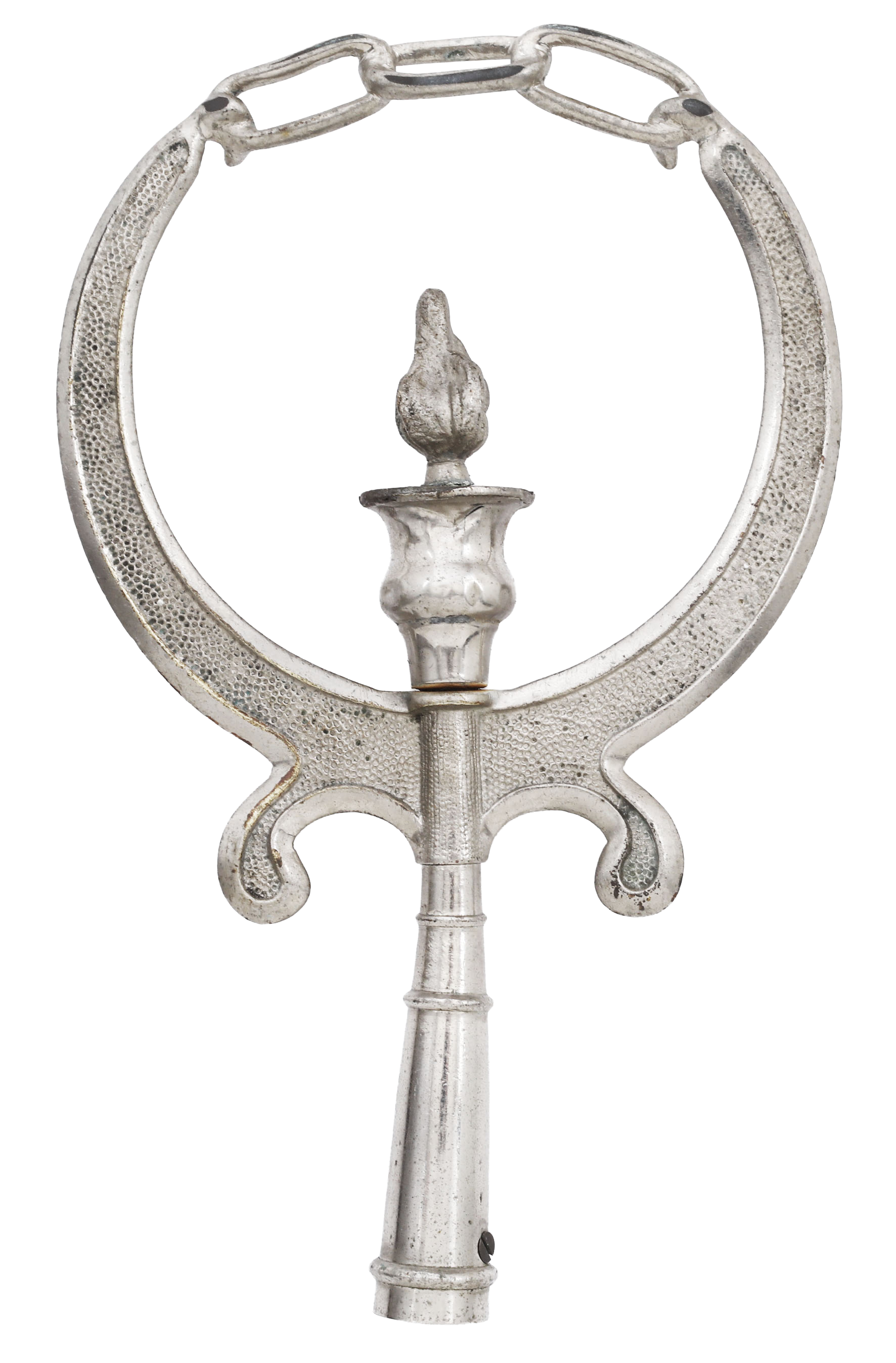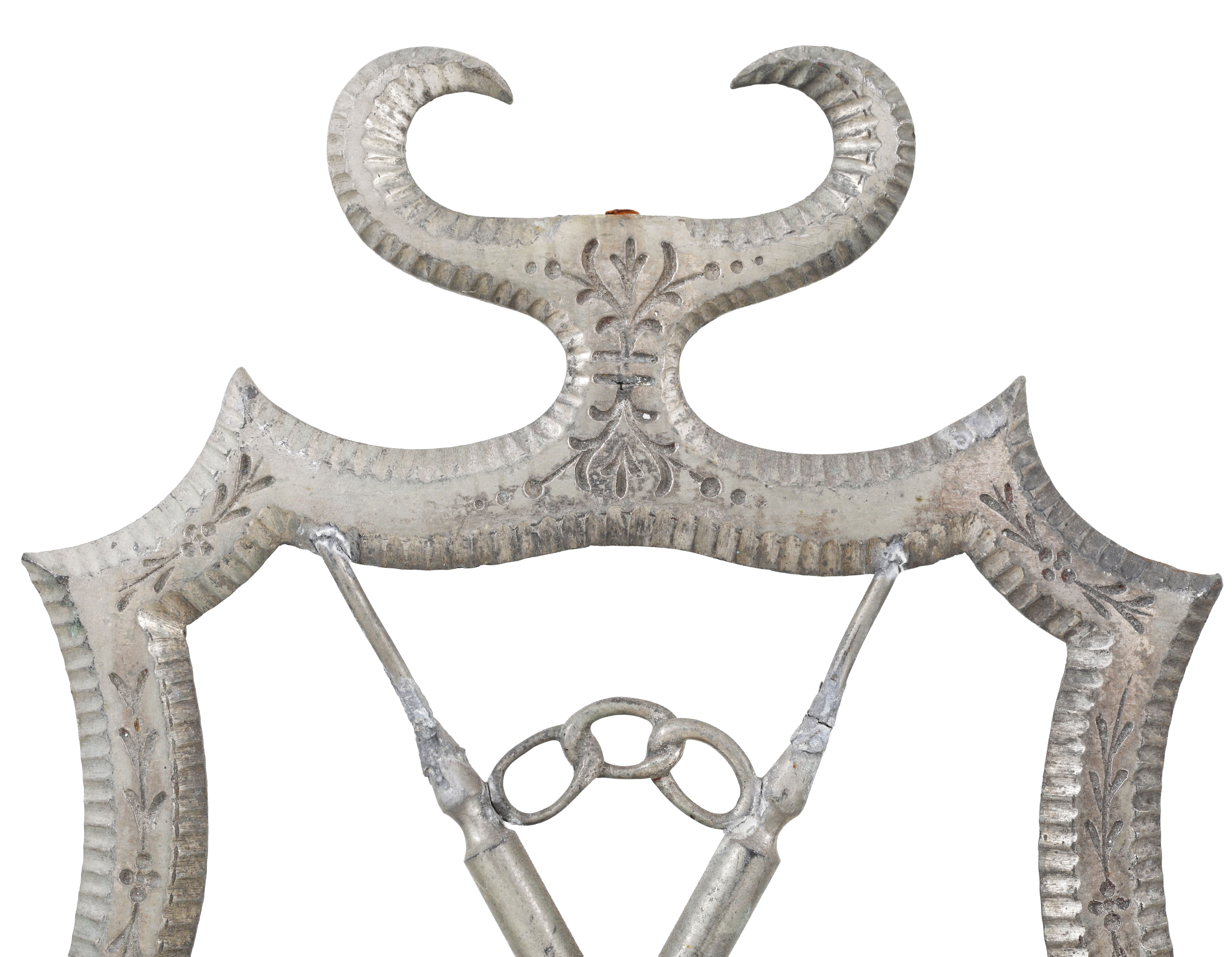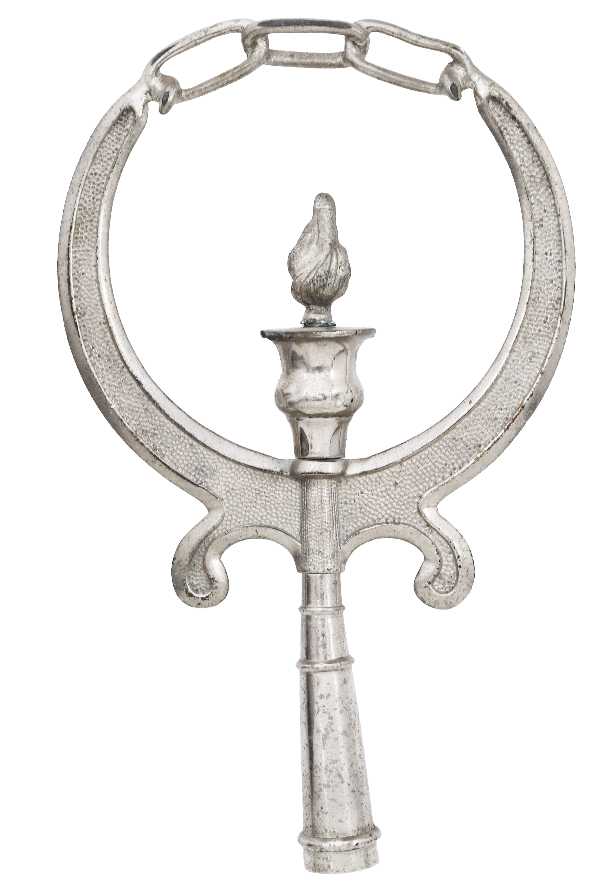 Two items. 10 ¼” with Liberty torch, plated. And 8 ¾” with crossed spears (?), soldered cracks. Originally on staffs (simply replaced) and carried in the rituals and public parades of the 19th century American Secret Societies.