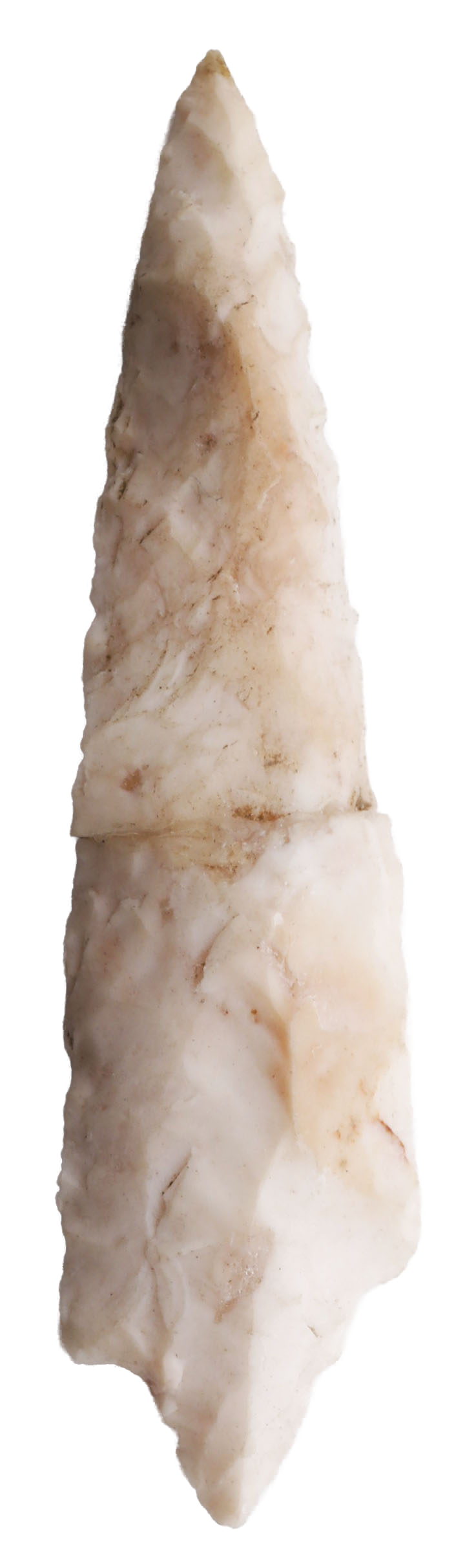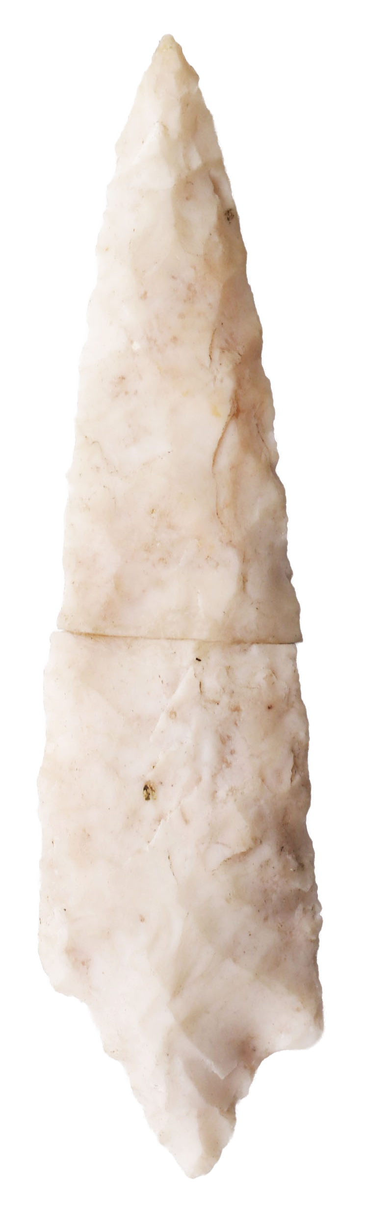 Flaked flint, with both faces shaped (bi-face) as opposed to the earlier mono-face type and thick section. Elongated triangular shape with triangular tang and delicate barbs. Central glued crack. The stone with nice pale pink color. About 1 ¼” (1.23”)” length.