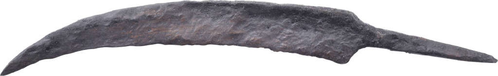 Forged iron over 5 1/4” (5.34”) length. The curved wedge section blade with squared base showing Roman influence. As with Vikings later, Celts preferred a small slashing knife. Increased size translates to a slower attack and with a moving target, decreased accuracy. This blade form derives from the overhand back slash capable of tearing a man’s throat to the spine but at the price of the loss of primary frontal protection. You had to get it right or do it clandestinely. Excavated and professionally conserved with Plexiglas display easel and certificate of authenticity.
