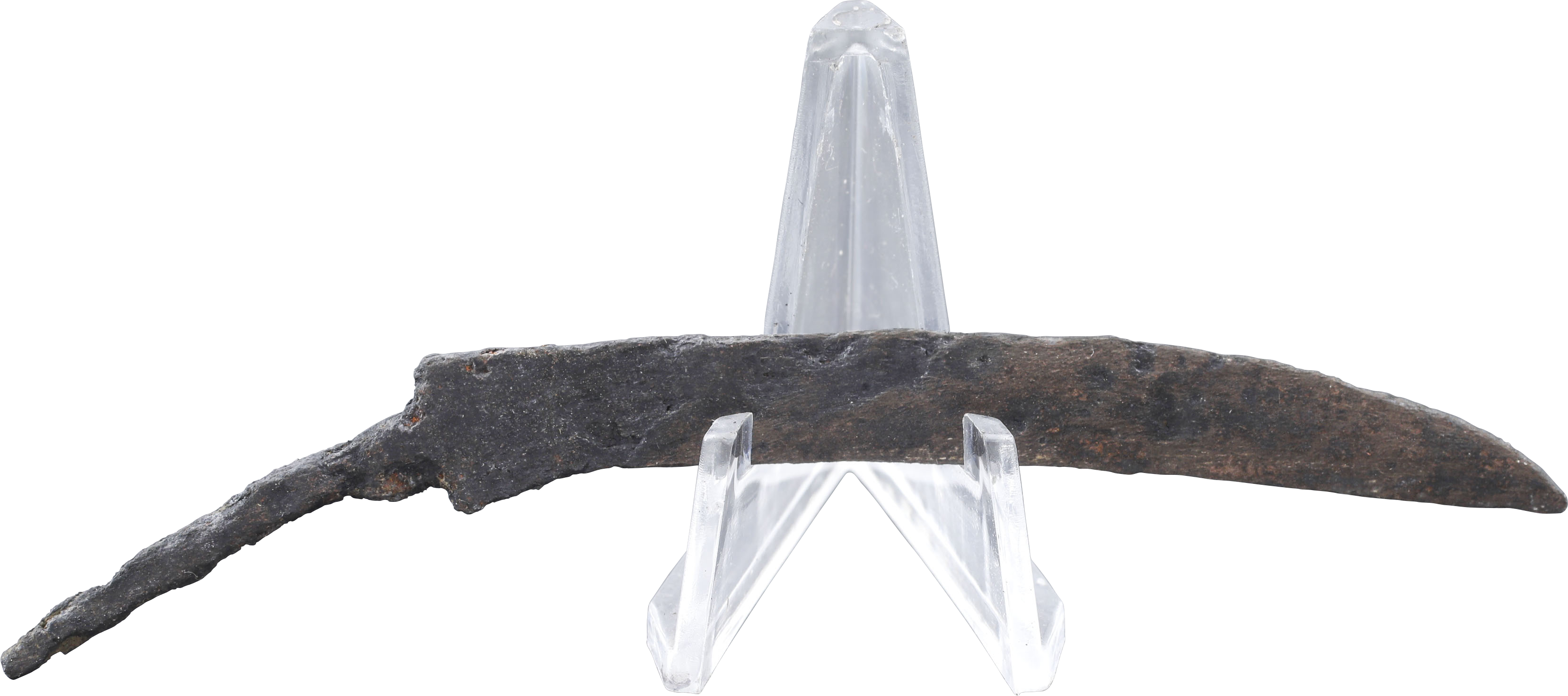 Forged iron over 3 3/4” (3.83”) length. The curved wedge section blade with angled base shows Roman influence. As with Vikings later, Celts preferred a small slashing knife. Increased size translates to a slower attack and with a moving target, decreased accuracy. This blade form derives from the overhand back slash capable of tearing a man’s throat to the spine but at the price of the loss of primary frontal protection. You had to get it right or do it clandestinely. Excavated and professionally conserved with Plexiglas display easel and certificate of authenticity.