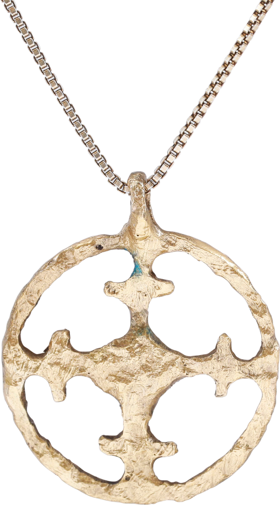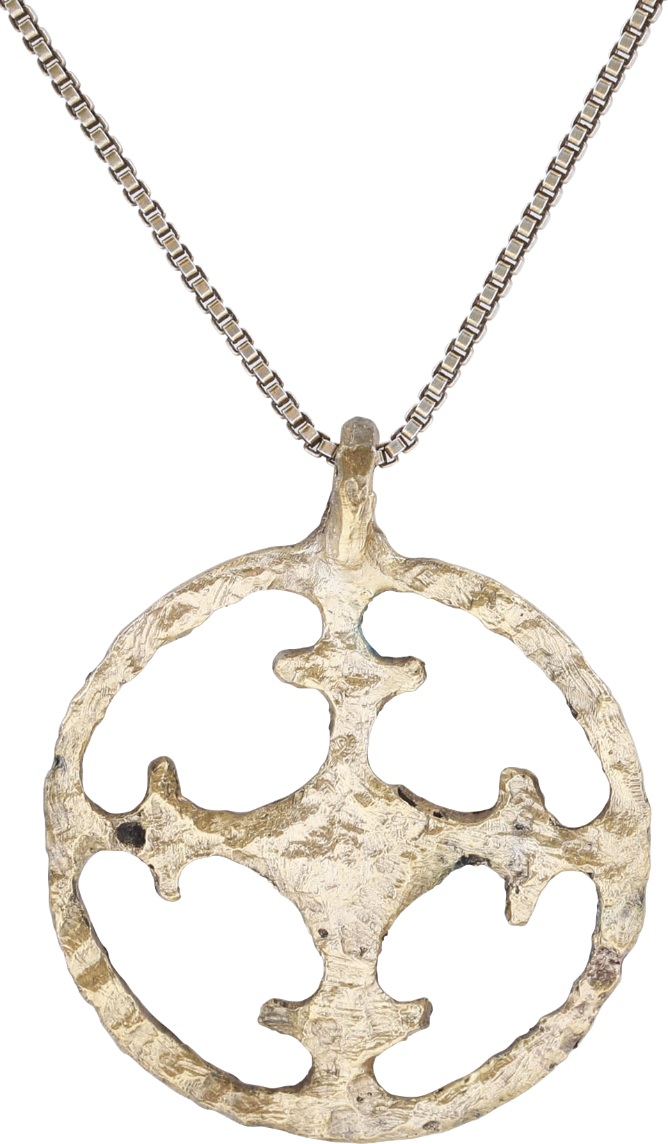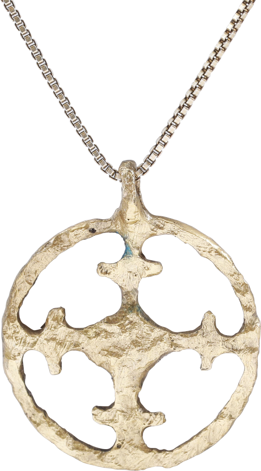 1096-1291. Circular, pierced with a cross potent, i.e. with "crutches" at the beam ends. That form is also known as the Crusader's cross, having been an element in the arms of Godfrey Bouillon which he wore during the First Crusade. Godfrey of Bouillon was a Frankish Knight of the First Crusade, known as Baron of the Holy Sepulcher and the Crusader King, ruler of the Kingdom of Jerusalem following its victorious siege in the First Crusade. For that reason, it is also known as the Jerusalem Cross. This example is profusely detailed with the outer ring crenulated and the beam "crutches" formed by scroll ends and forming a diamond at the beam intersection. It is just over 7/8" in diameter (0.89”) plus the intact suspension loop. The surface is heavily degraded from burial. Professionally refurbished with the 24 karat overlay restored, on a modern gilt Sterling silver neck chain. An actual pendant as worn by a crusader nearly 1000 years ago!