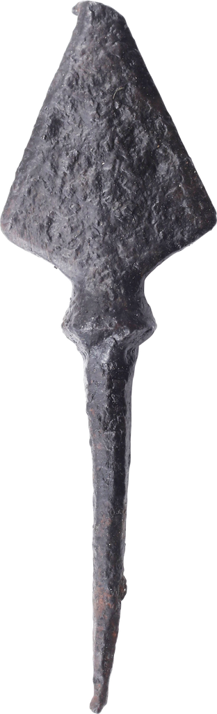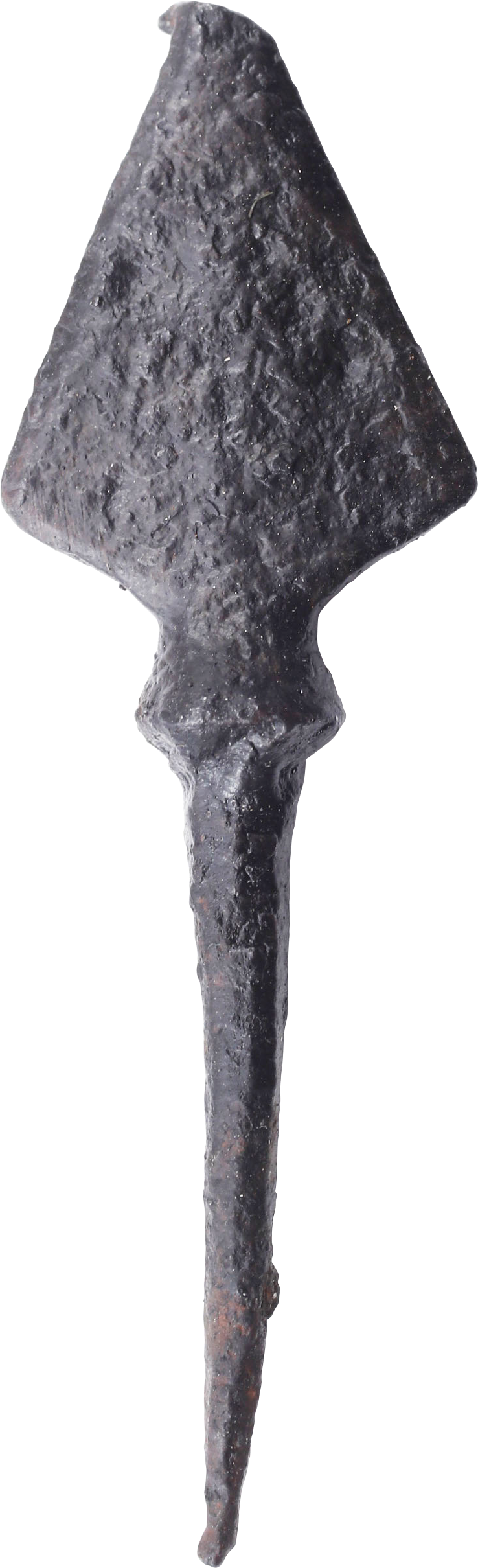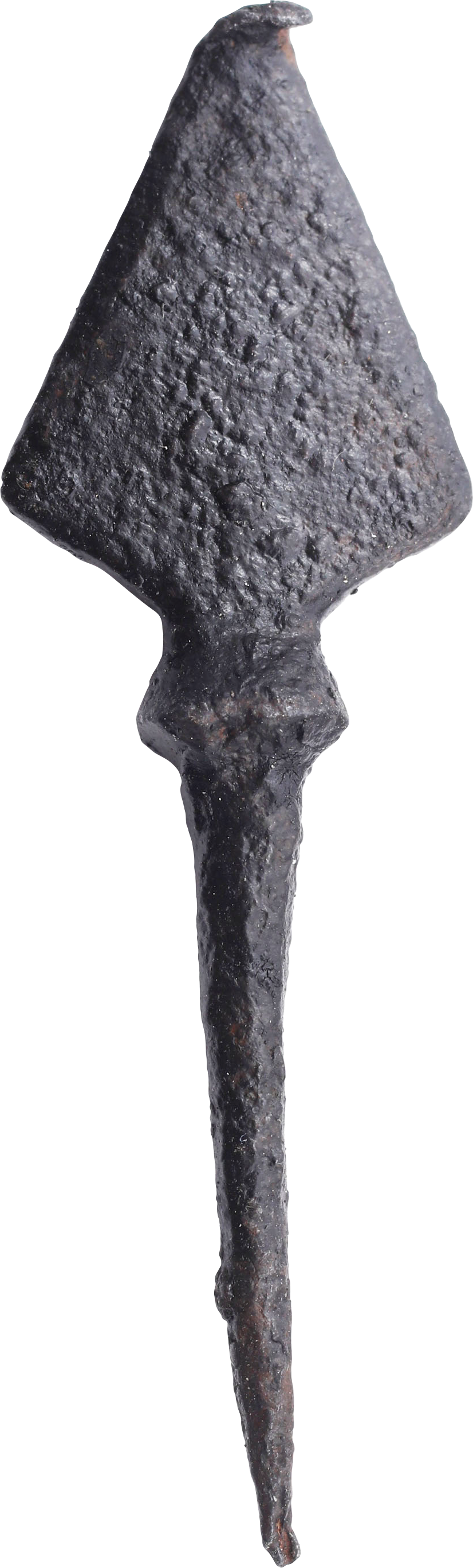 Used by the Saracens defending the Holy Land against the Crusaders. See Nicolle # 691. Forged iron of classic form with thick flat kite shaped point with flared shoulder on tapered tang. A flesh cutting arrow capable of penetrating the leather and textile armor of the Crusaders. 2 1/8” (2.13”) total length. Recovered from the Levant Battlefields with distinct impact to the point. Professionally conserved excavated condition.