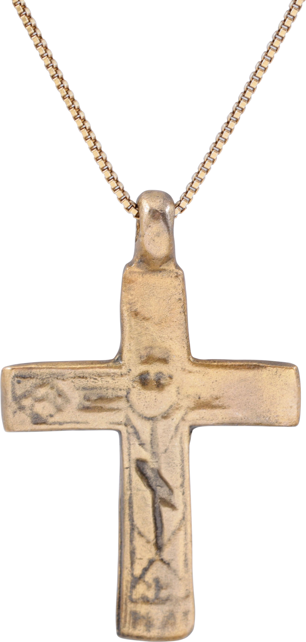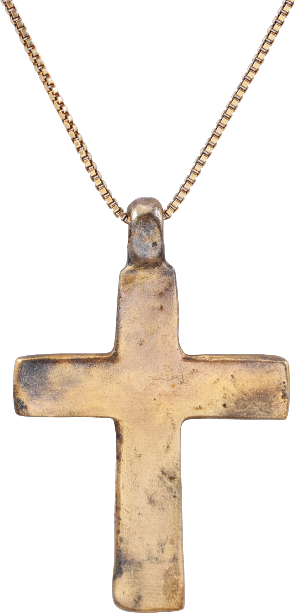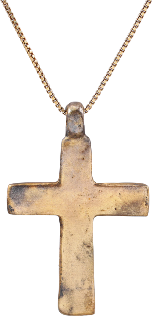 Russia/Ukraine. Gilt bronze, well over 1 1/2" (1.52”) in height. Unusual variation with the cross and other details recessed into the flat face cross. The reverse with remnants of decoration, perhaps calligraphy. Well worn from its period of use and now, professionally refurbished with the 24karat gold surface restored and on a gilt Sterling silver neck chain for contemporary wear.