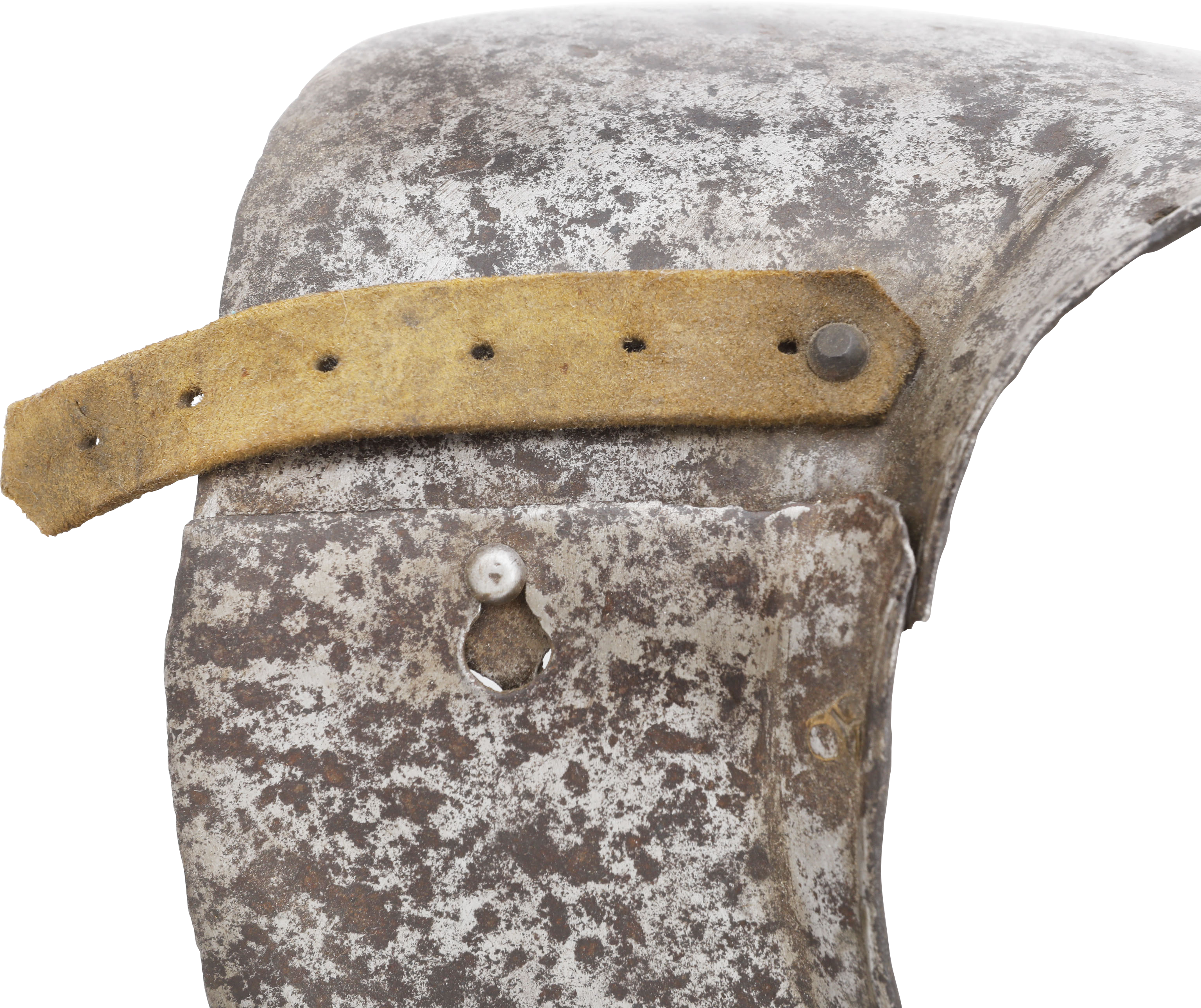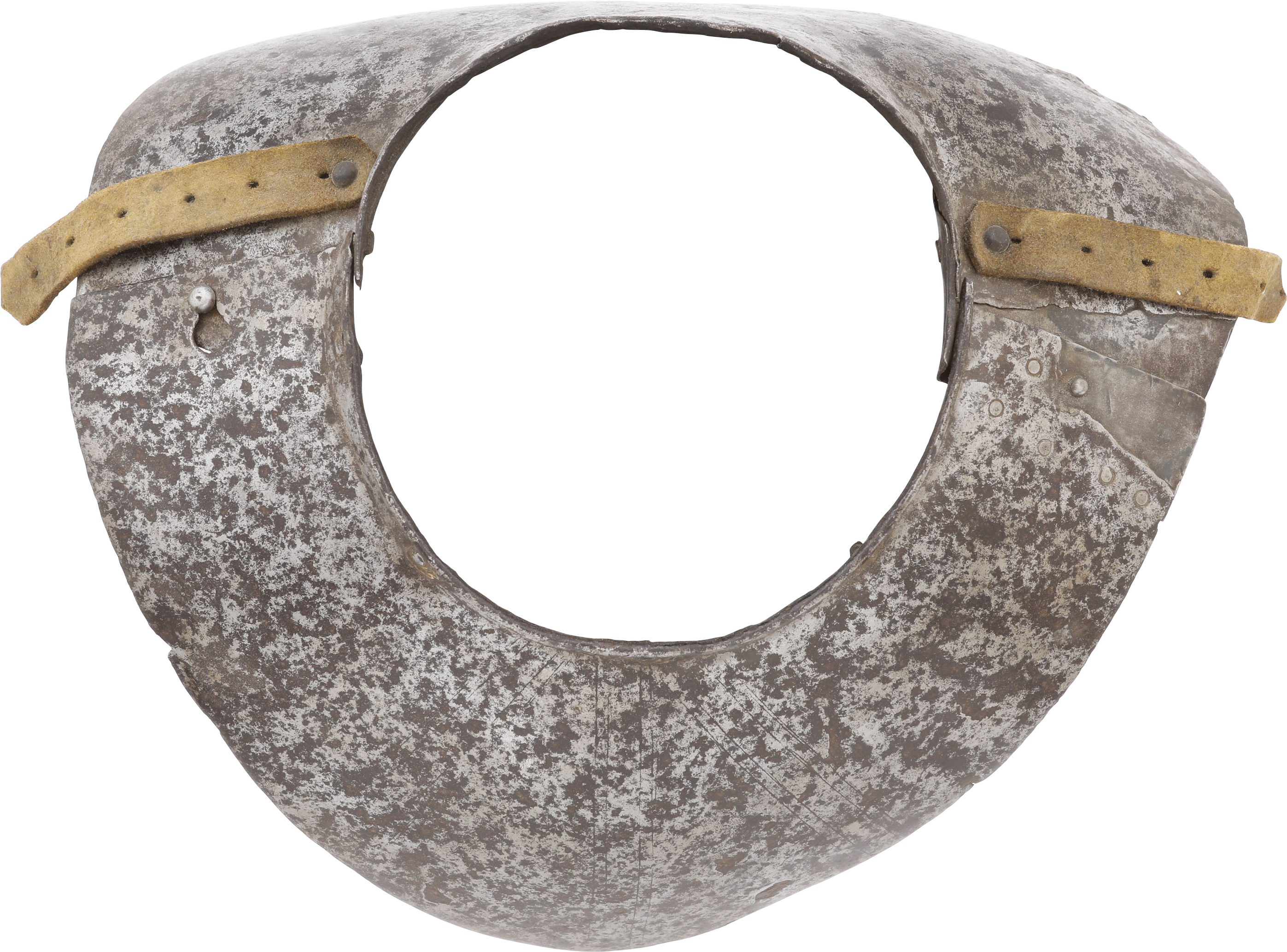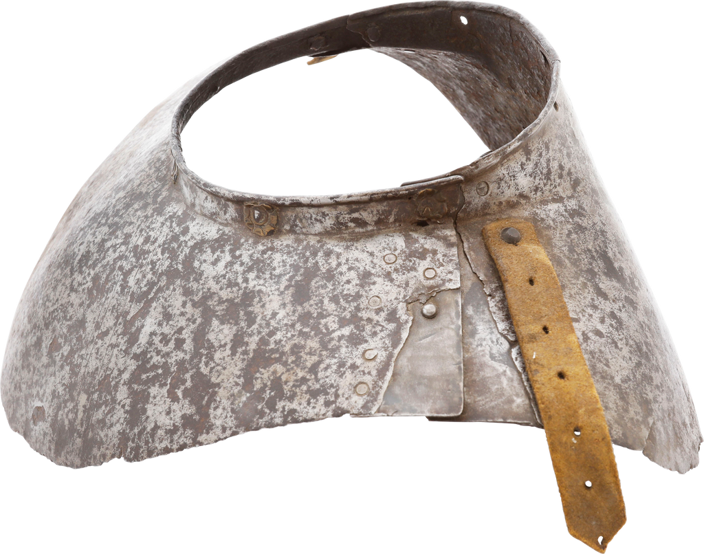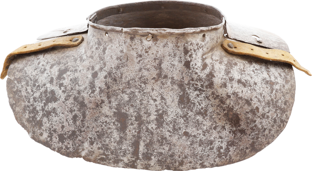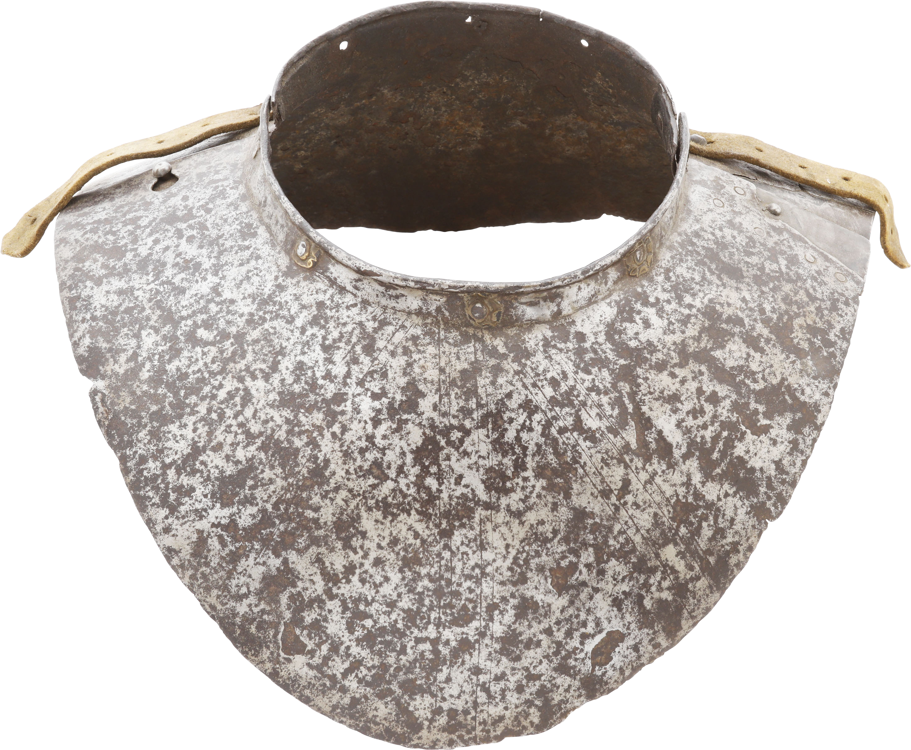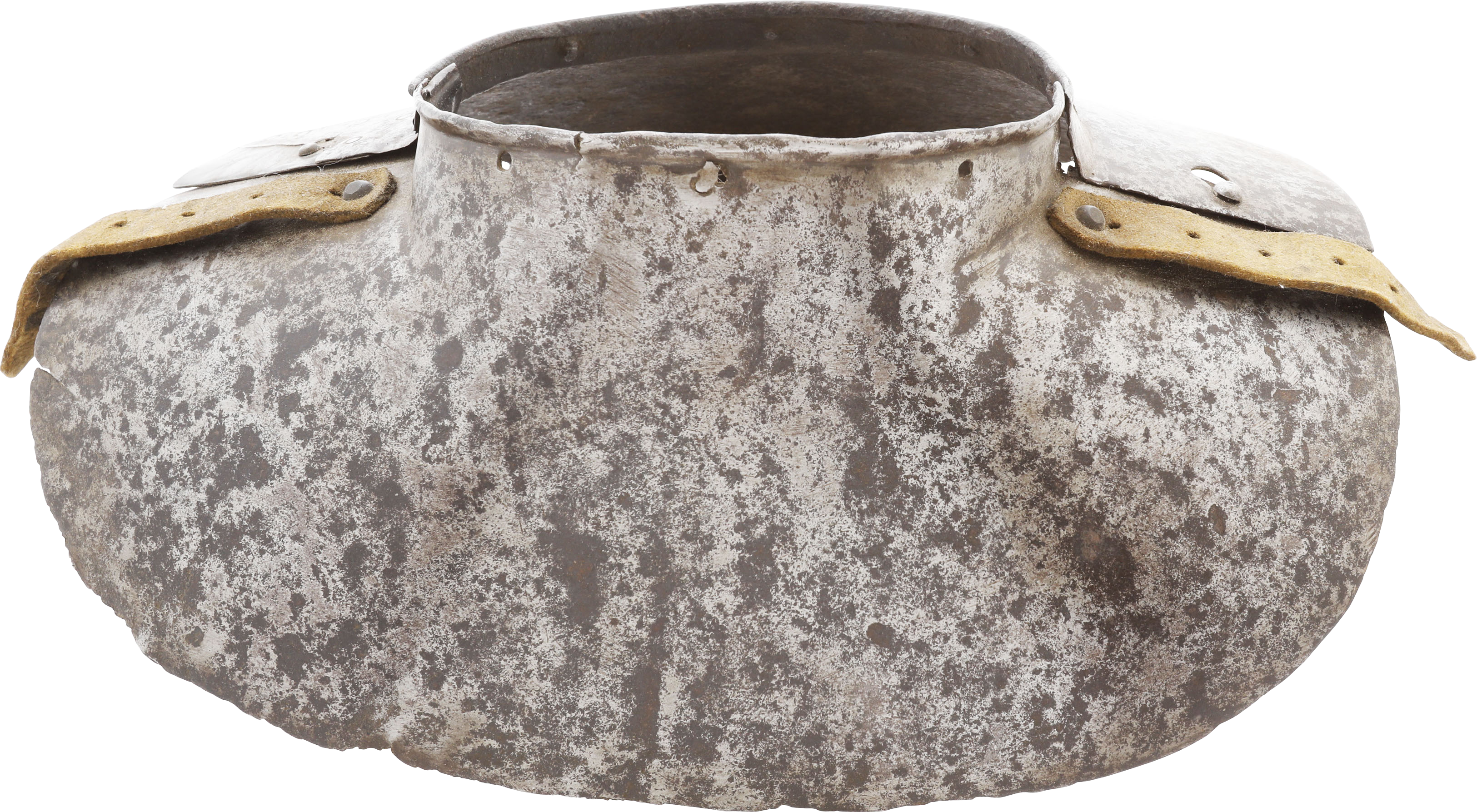 Thirty years War and English Civil Wars period. Made in two pieces, hinged with a key slot fastener opposite. Each with a rolled edge raised neck segment. The front is decorated with brass rosettes and rivets (well worn), and engraved in pairs of radial bands. The left side with repair to each plate. Quite smooth overall with mottled patina. Fine display for a helmet of the period. Much of the armor used in the Thirty Years War (1618-48) was reused in the English Civil Wars of 1642-51.