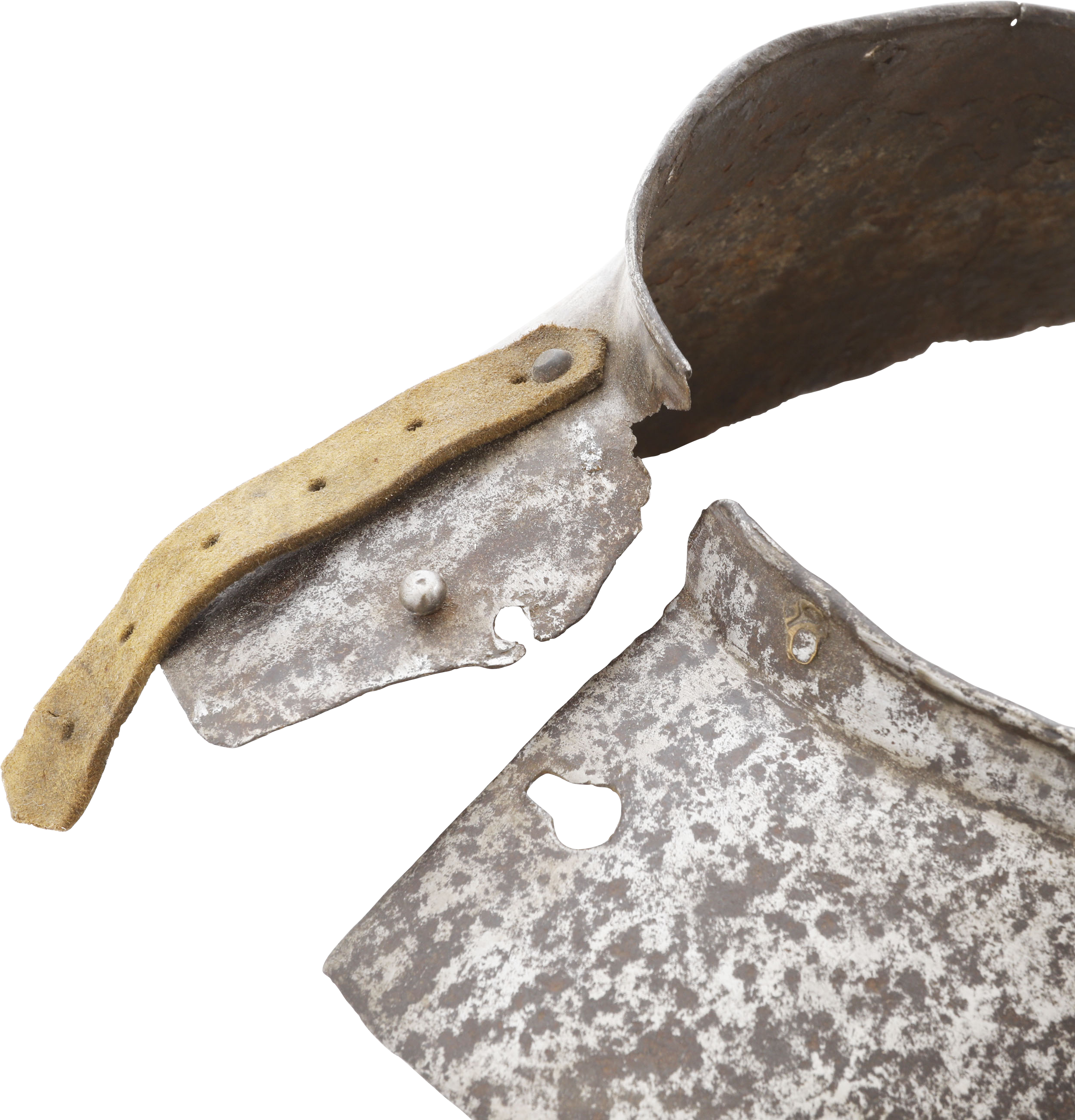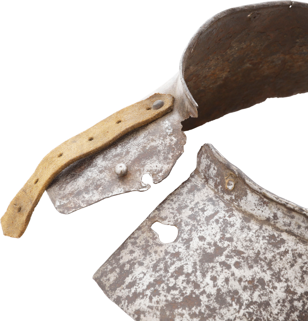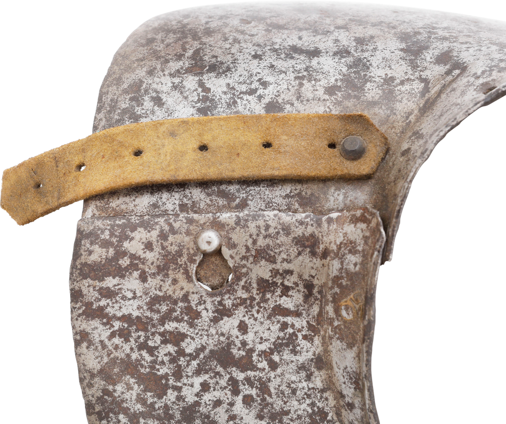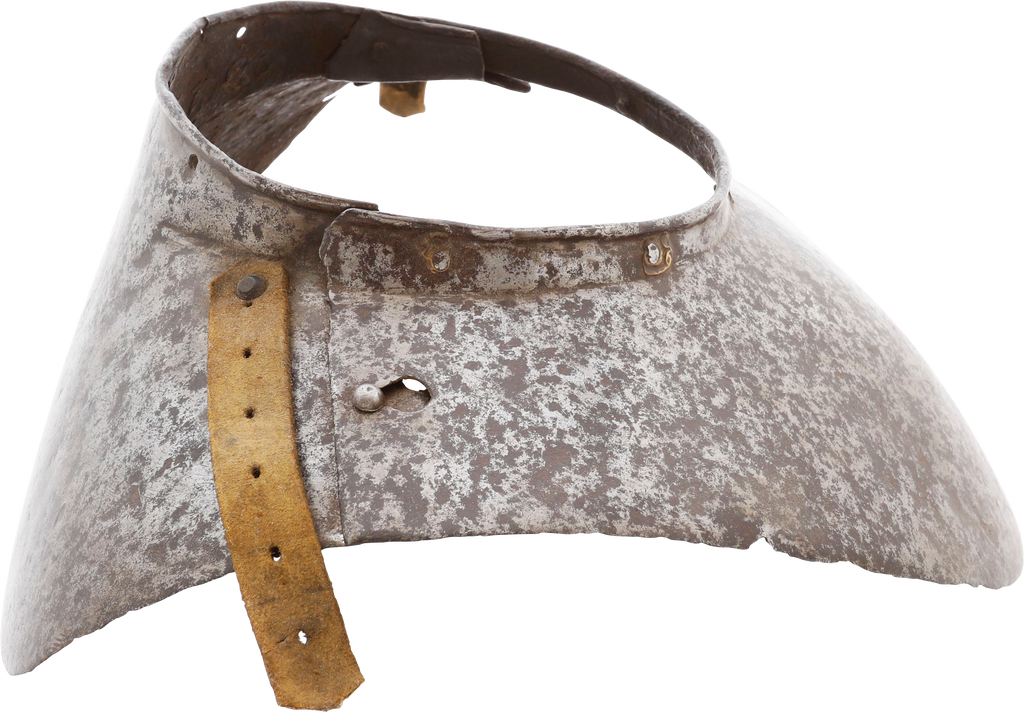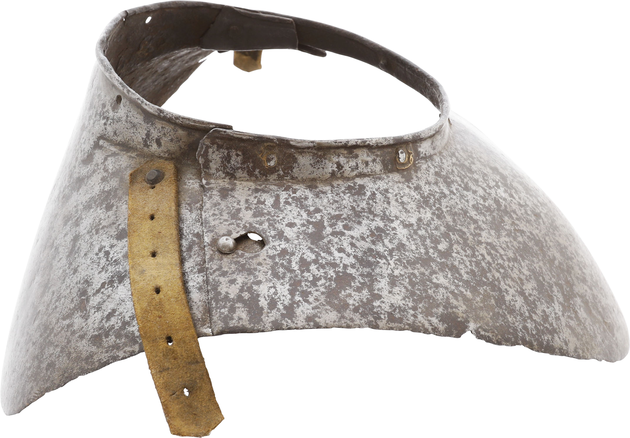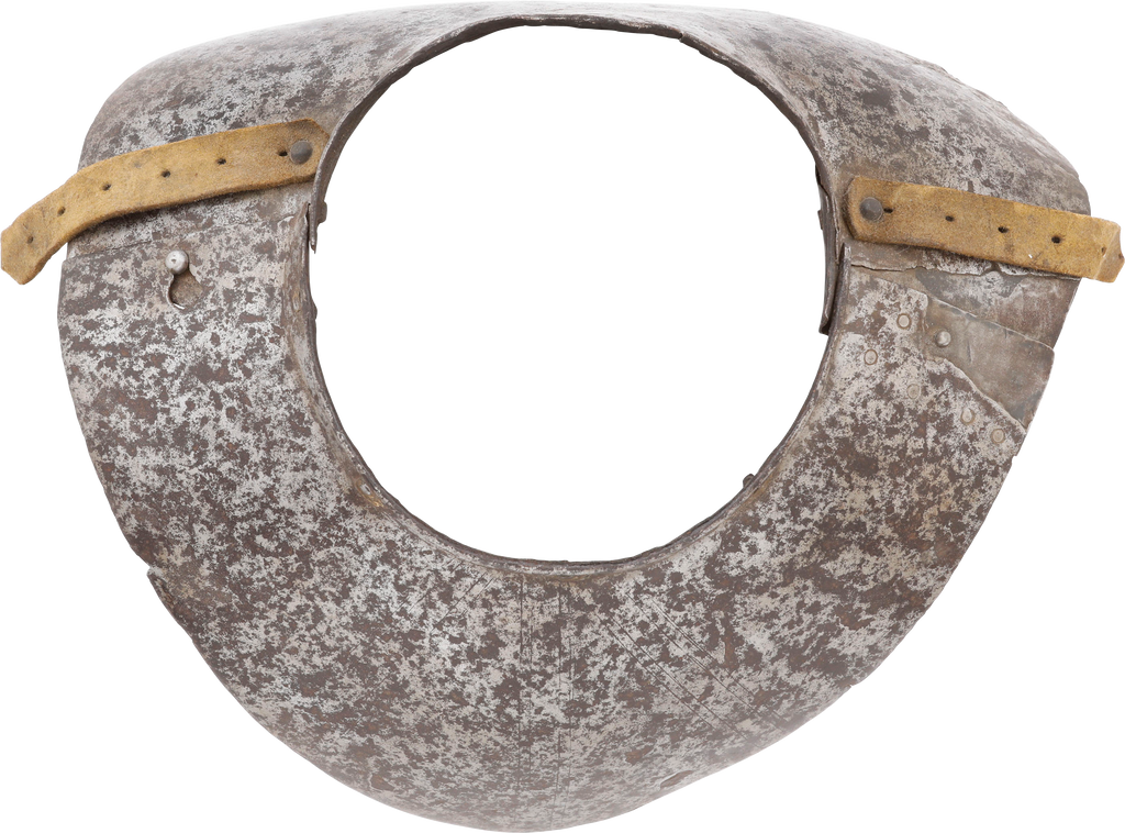 Thirty years War and English Civil Wars period. Made in two pieces, hinged with a key slot fastener opposite. Each with a rolled edge raised neck segment. The front is decorated with brass rosettes and rivets (well worn), and engraved in pairs of radial bands. The left side with repair to each plate. Quite smooth overall with mottled patina. Fine display for a helmet of the period. Much of the armor used in the Thirty Years War (1618-48) was reused in the English Civil Wars of 1642-51.