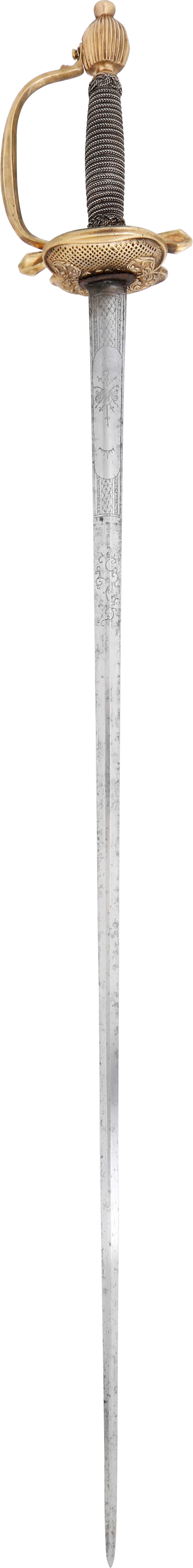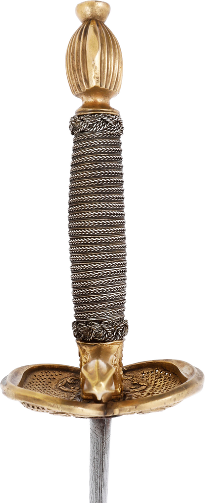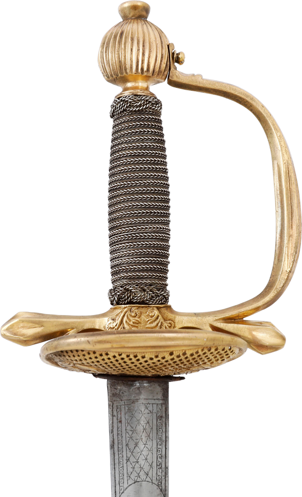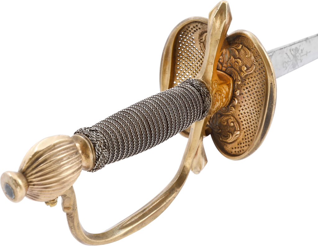 This fine sword represents the link between the swept hilt rapier and the smallsword. Its most distinguishing feature is the fully developed cross guard which later, evolved into a single forward quillon. As well, the thickened edge shell guards with very fine lattice pierced plates, are of equal size whereas in smallswords, they are always asymmetrical with the right larger. The 32 3/8” blade is oval at the forte, decorated with military motif, indicating that this was the sword of a military officer. The balance of the blade is of flattened diamond section with scrolling foliage at the transition. A historic sword in exceptional condition for the period.