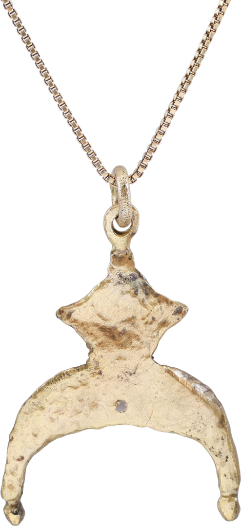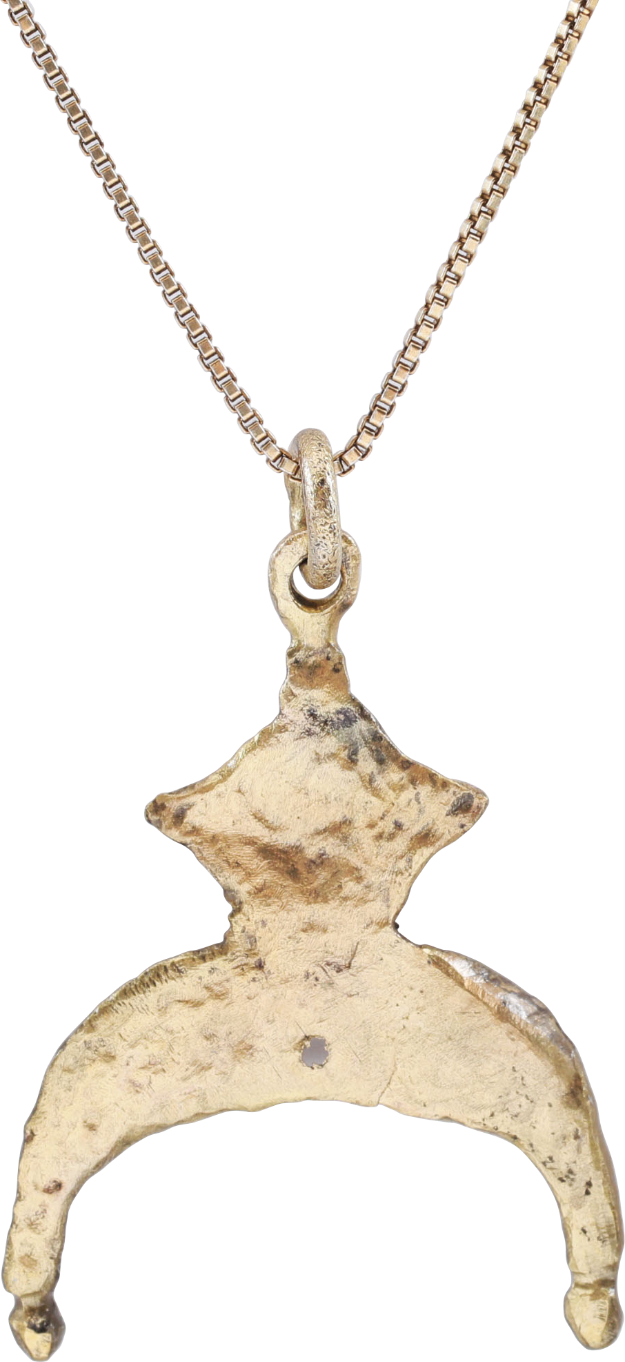 Slightly over 1 1/4 “(1.27”) height including the suspension loop. Bronze, cast, and chased in minute detail as the raised edge crescent moon with baluster tips representing Sol the sun and Mani the moon. The crescent form body with lattice or hound’s tooth raised motif. The combination undoubtedly represents an astronomical event with supernatural significance. Above, a nubbed four spoke wheel. Undoubtedly of astrological significance, now lost. Viking worship involved the heavenly bodies on which they relied for guidance when sailing. Fine quality. Excellent condition with the 24karat gold overlay restored and mounted on an 18” modern gilt silver neck chain for contemporary wear. Jewelry gift boxed with a certificate of authenticity.