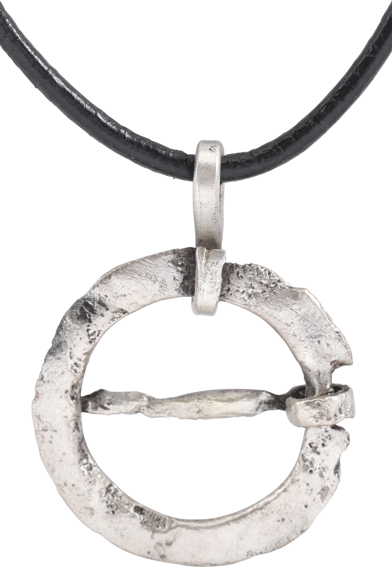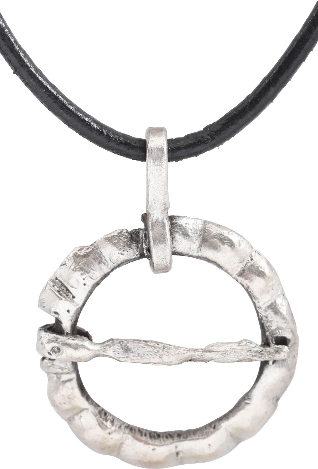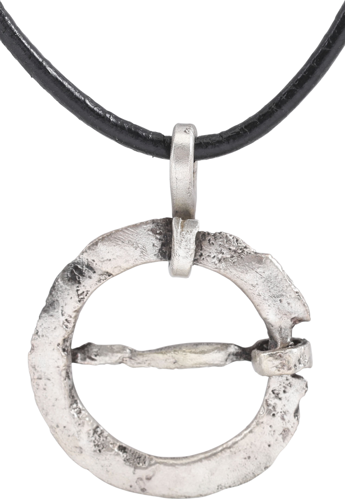 Silvered bronze. Just under 1” (097”) diameter. Circular with crenulated surface. The edge is inset for the cross pin. The form is drawn from the pagan Wheel of Fortune descended from the Roman and in use even today. When fastened to the jerkin, these small metal brooches provided a measure of protection against sword cuts and, in fact, were a form of armor. See current Public Television programming for documentation of these in action. As protectors, they also held spiritual significance for the warrior. Professionally refurbished with the pure   silver overlay restored and suspended from an 18” Sterling silver neck chain. Jewelry gift boxed with certificate of authenticity.