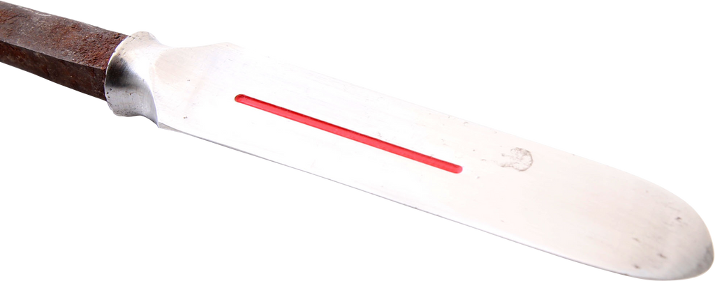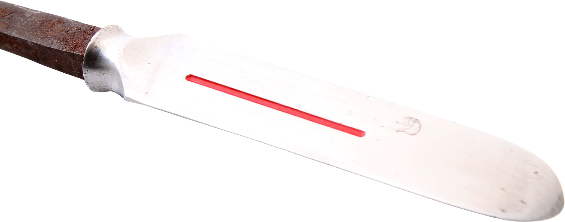 Edo period, before 1867, probably about 1800. 19 7/8" length with 4 1/8" triangular section point. The broadest face with a narrow fuller with red lacquer fill. Flared base and upturned tip, all in bright polish. Tapered tang with two holes for securing peg.
