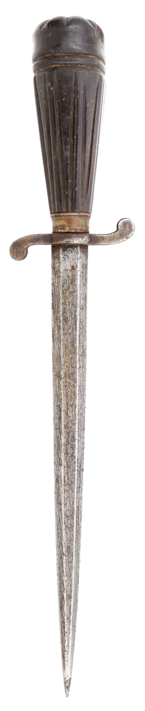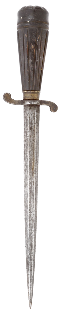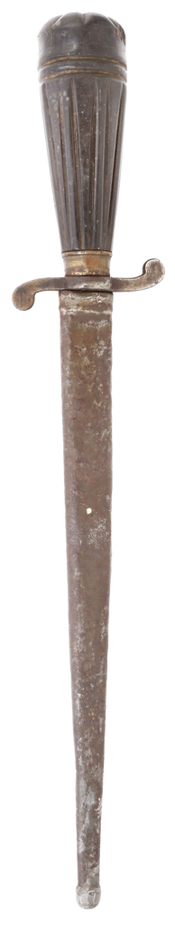 Dating to the second half of the 18th century with 7 ½” flattened diamond section blade, characteristically thick and sharply tapered for thrusting. Recurved guard and fluted ebony grip. Lapped seam metal scabbard, contemporary, but of lesser quality. Made for use with it but not of the same quality. Hilt and scabbard show white “manor house” paint spatter from having been displayed wall mounted.