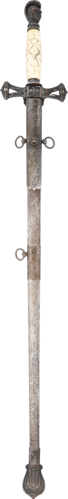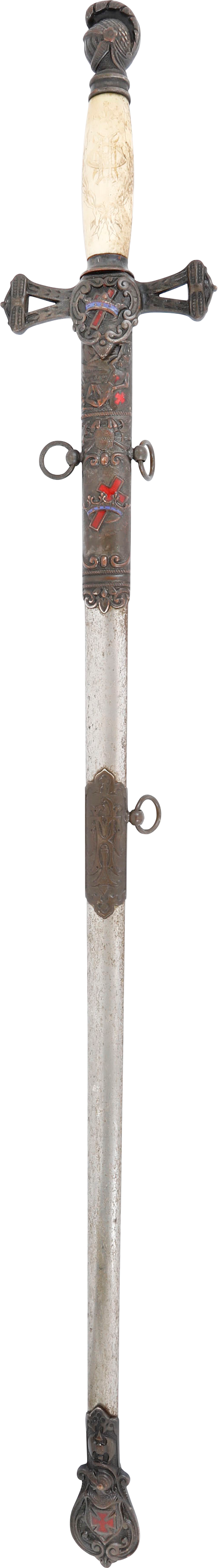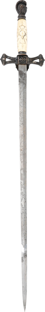 Bronze hilt and scabbard mounts. Ivory grip hand engraved with monogram and cross. Enamel crown and cross to the guard.  27” blade decorated over 2/3 its length with crusades scenes, Masonic symbols, foliage, owner’s name, and Knight on gold ground. The gold faded in the field and strong around the figures. The forte with HORSTMANN PHILADELPHIA. That maker worked from 1843 on providing swords for the Civil War and after. Scabbard excellent with the enamel mounts undamaged, no dents and plating complete. Quality and construction including the decoration consistent with its early manufacture.