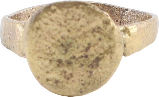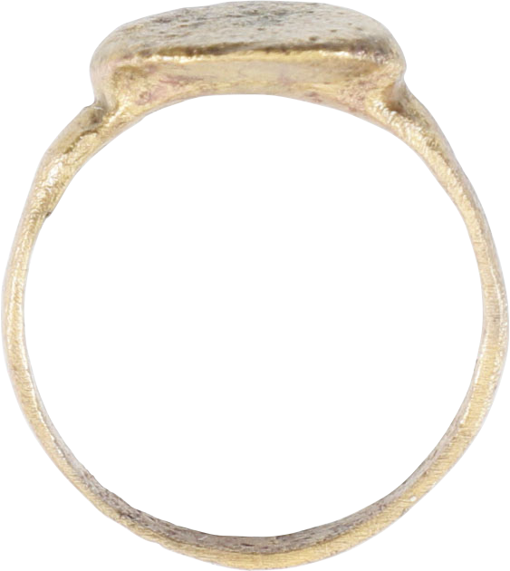 Gilt bronze, size 7 with 2.9mm rounded face band flaring to the shoulders. Oval bezel flat with rounded edges showing remnants of relief decoration, now obscured by wear and degradation from burial. Professionally refurbished with the 24karat gold surface restored. Gift boxed with certificate of authenticity.