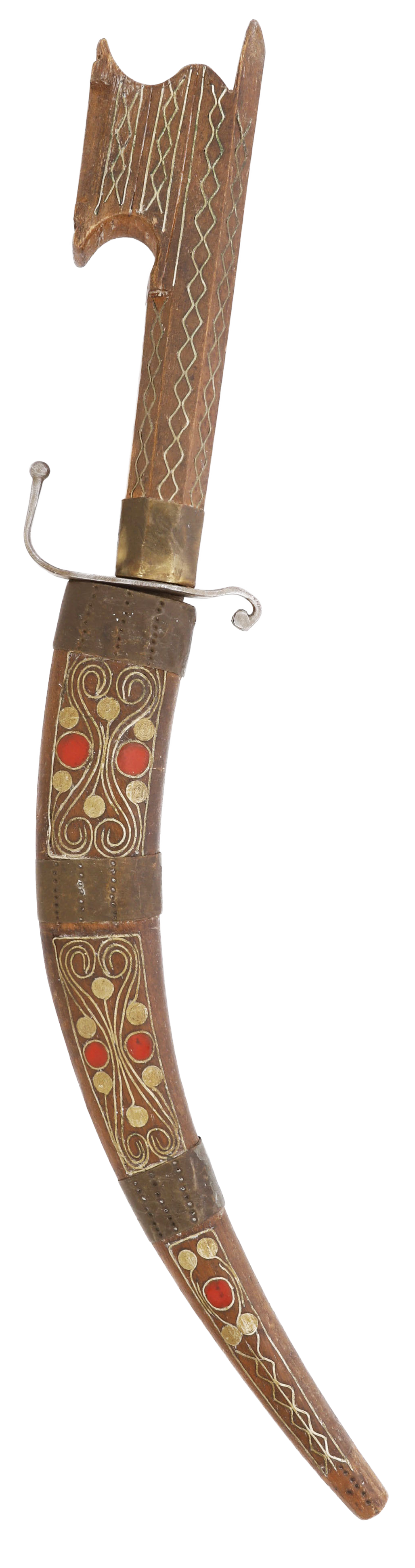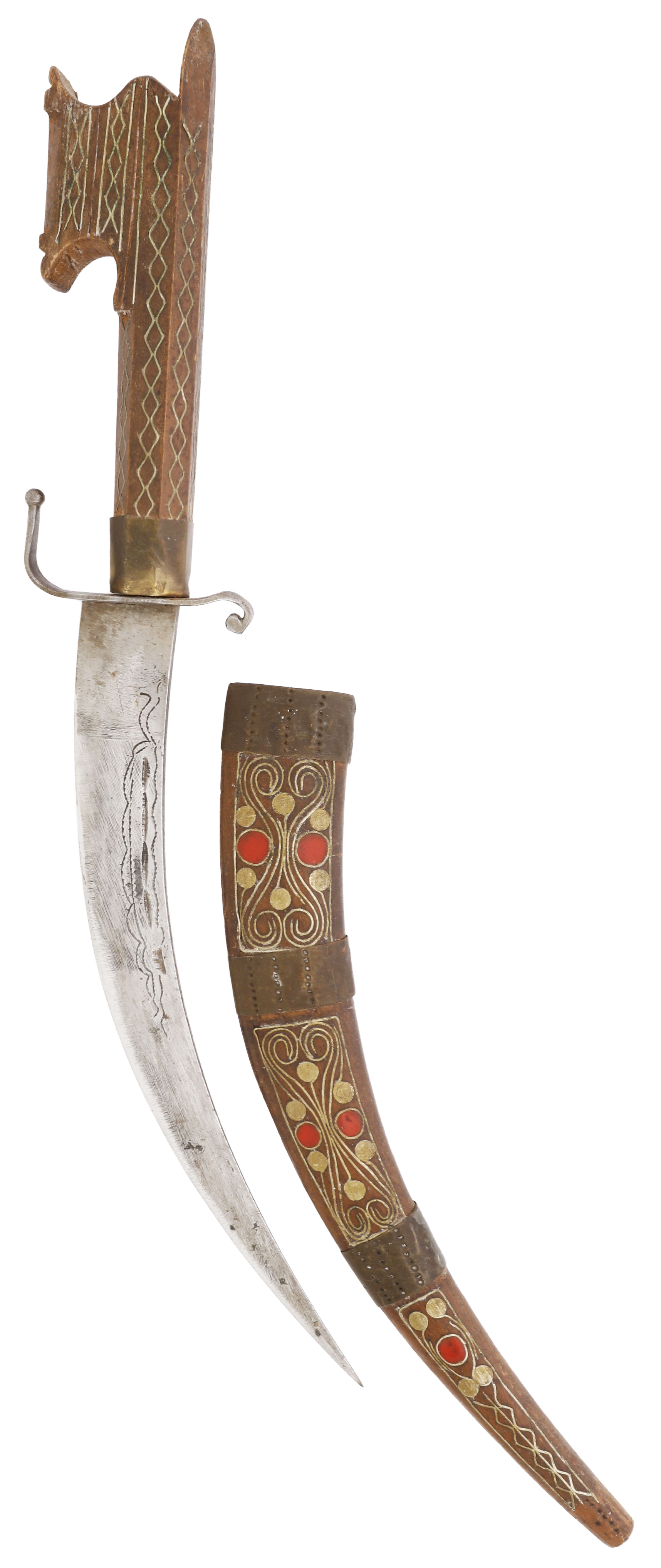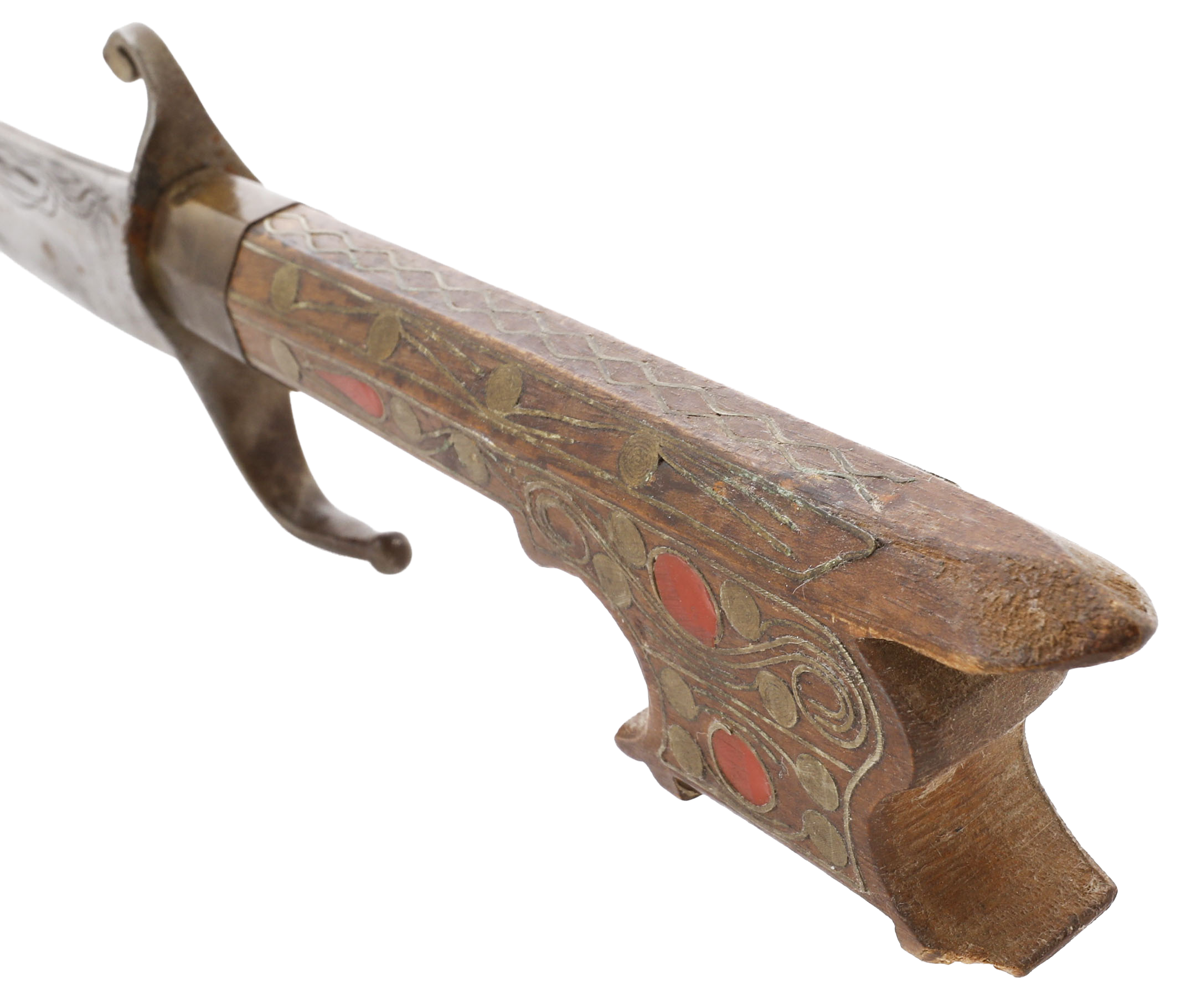 Late 19th early 20th century, the period of French and Spanish colonization (protectorates) and Ottoman influence. 9” curved, tool finished wedge section blade. Each side with a lenticular band over repeated Islamic crescents. Recurved iron guard. Wood hilt and scabbard with white metal wire work and red pigment inlays. Small chip to the pommel. The inlay complete. Faceted brass base ferrule to the grip. Quite crisp with minor staining to the tool finished blade.