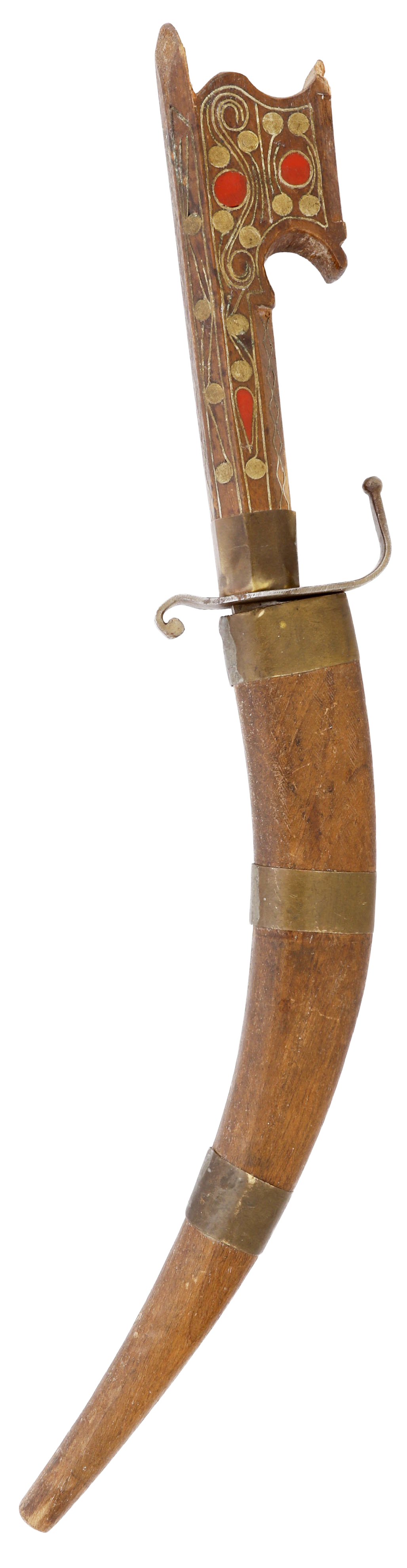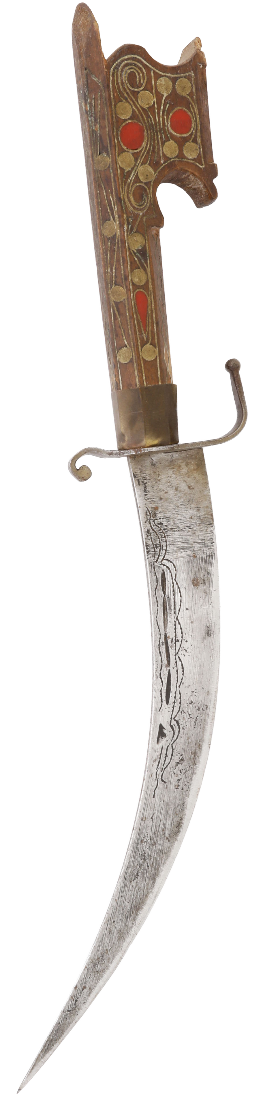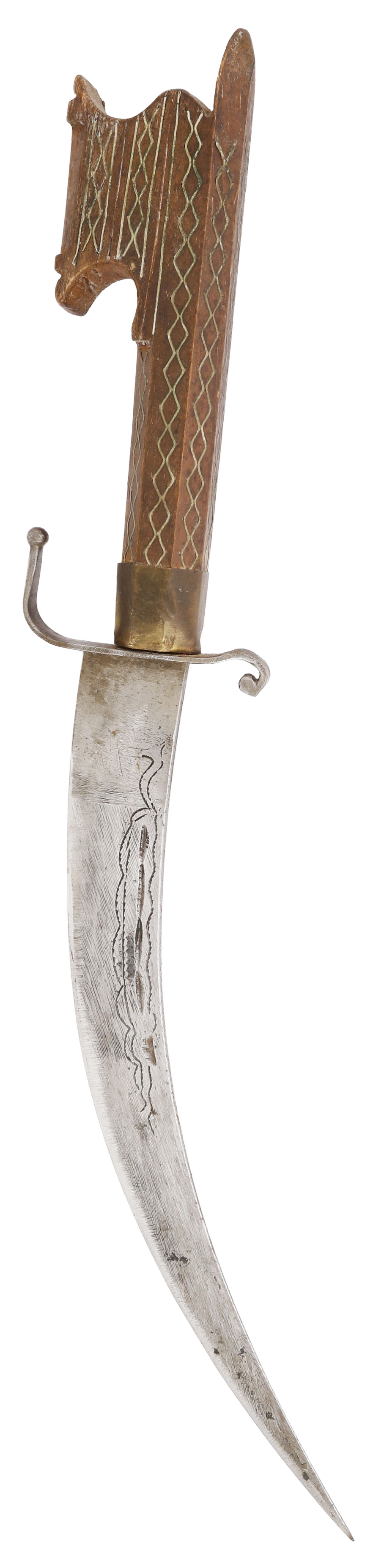 Late 19th early 20th century, the period of French and Spanish colonization (protectorates) and Ottoman influence. 9” curved, tool finished wedge section blade. Each side with a lenticular band over repeated Islamic crescents. Recurved iron guard. Wood hilt and scabbard with white metal wire work and red pigment inlays. Small chip to the pommel. The inlay complete. Faceted brass base ferrule to the grip. Quite crisp with minor staining to the tool finished blade.