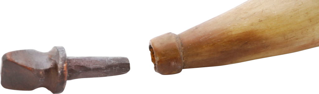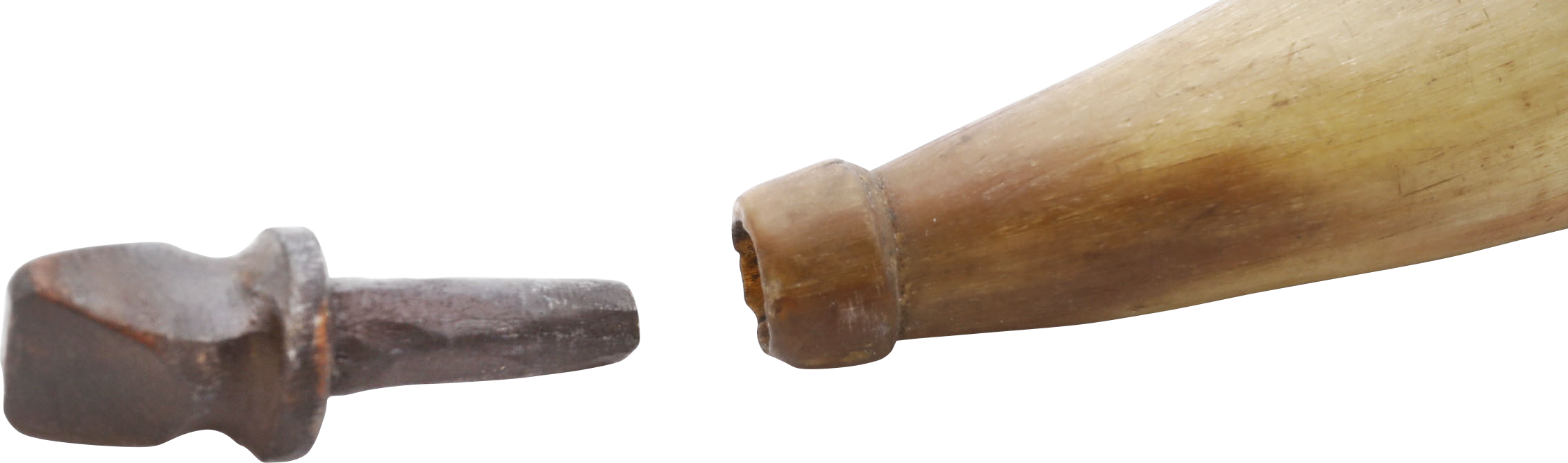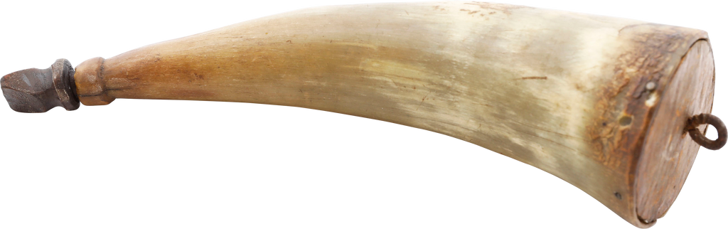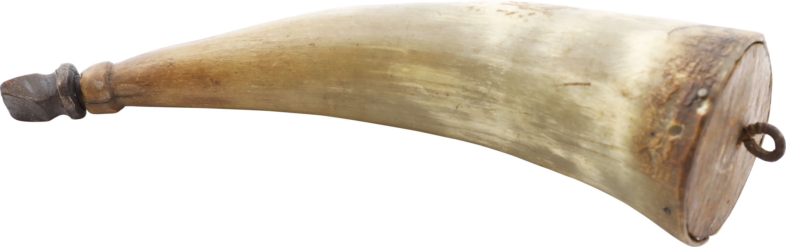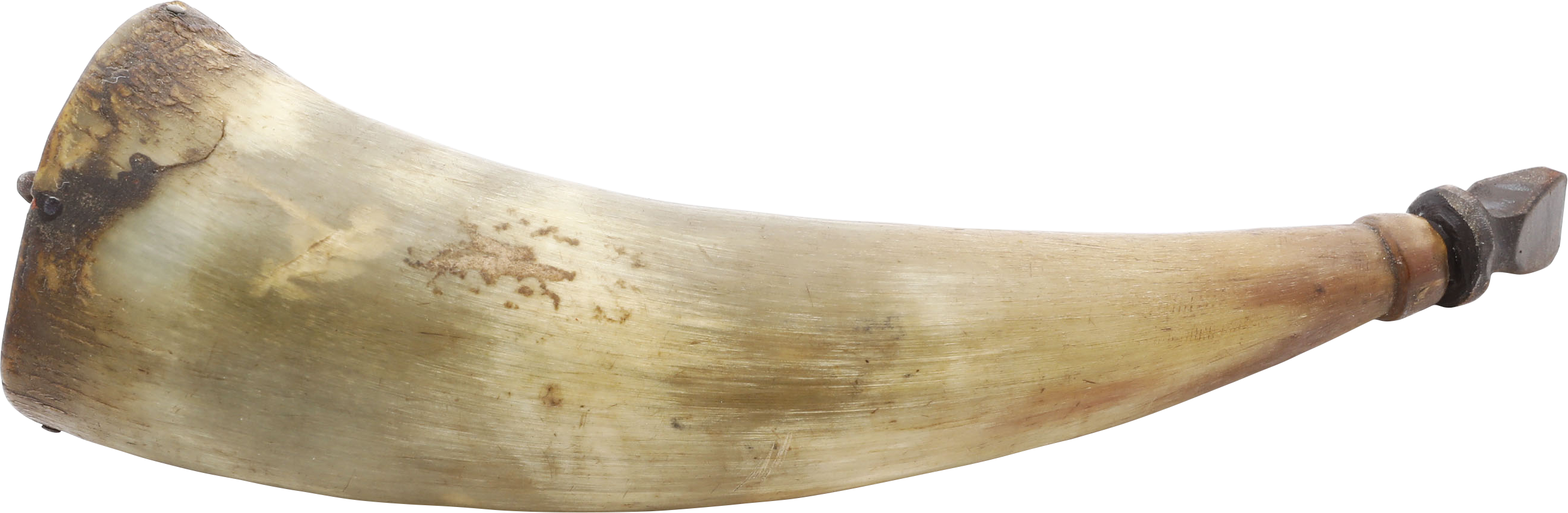 American C.1770, as used with the Pennsylvania long rifles. 5 1/2” length, natural horn with  dark patina under light surface encrustation. Inset wood base with iron suspension loop. Wood stopper. See Collector’s Illustrated Encyclopedia of the American Revolution, Neumann,  p.152 #19. Great age character.
