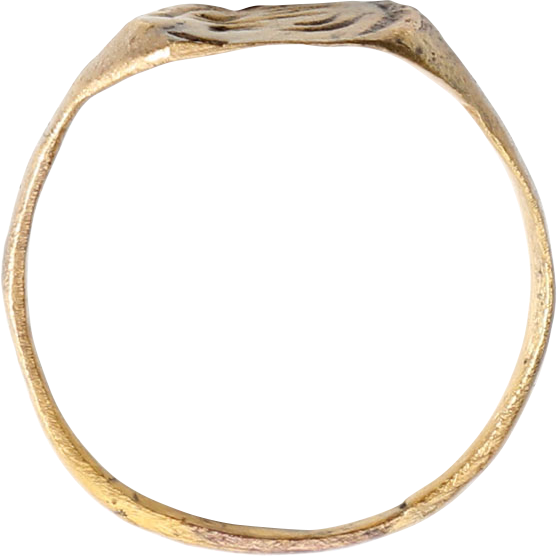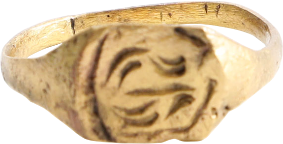 Gilt bronze, size 9 with 2.1mm rounded face band flaring to the shoulders. Lozenge shaped bezel with bordered central figure, perhaps a crab. It also has elements found on the Zoroastrian fire altar rings. See Ancient Rings, Pollio, p.80. Professionally refurbished with the 24karat gold surface restored. Gift boxed with certificate of authenticity.