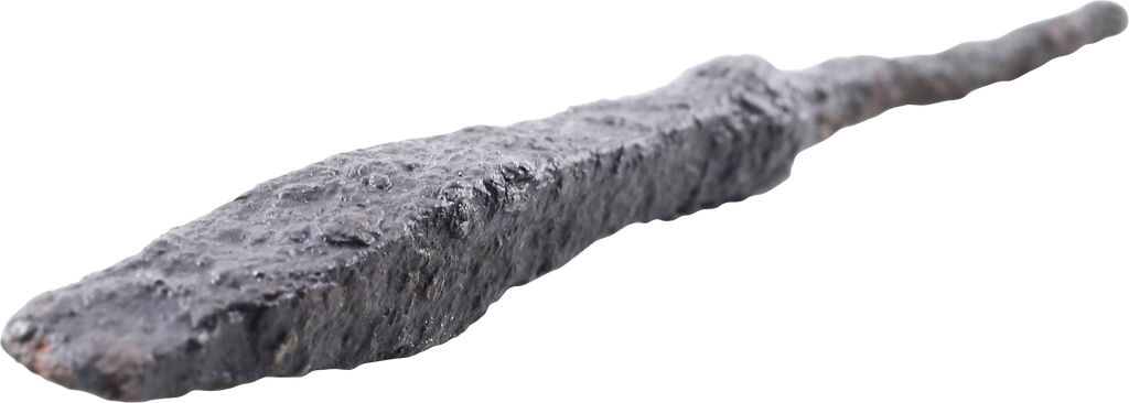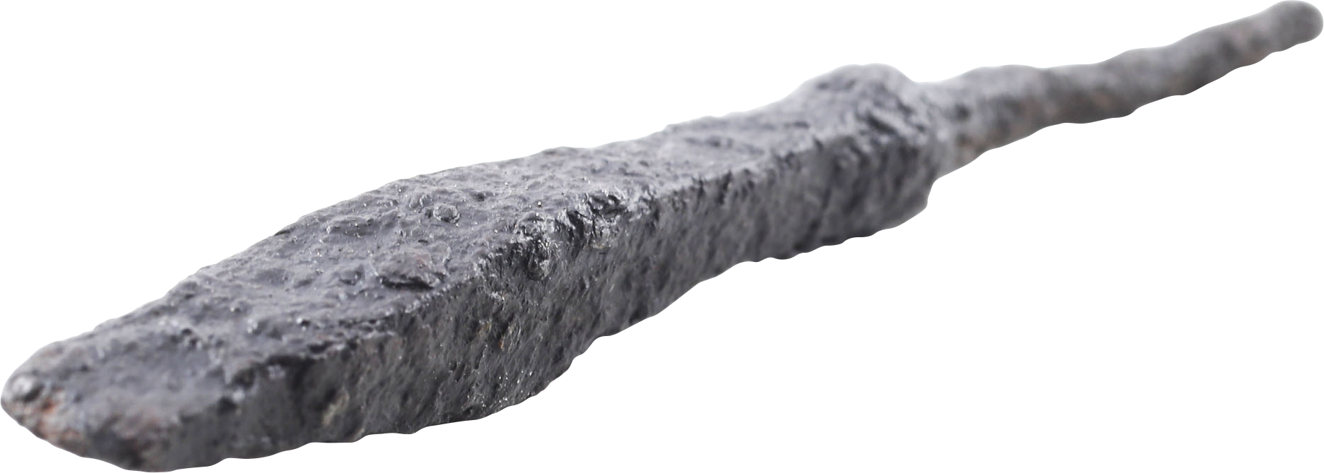 Rare variation. Forged iron, of swelled medial, square section, chisel point form. 3” (2.96”) length with triple veins, thickened armor piercing point, and tapered tang. While, these chisel point arrowheads are encountered occasionally, no conclusive explanation for them has been offered. Stable excavated condition.