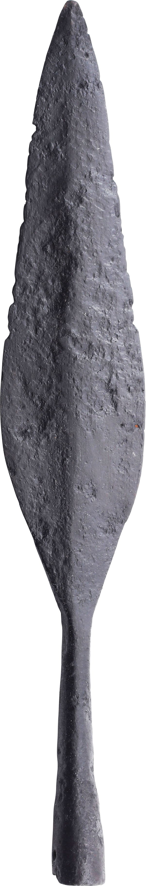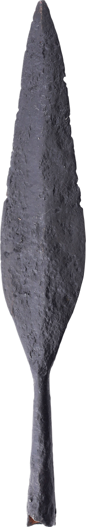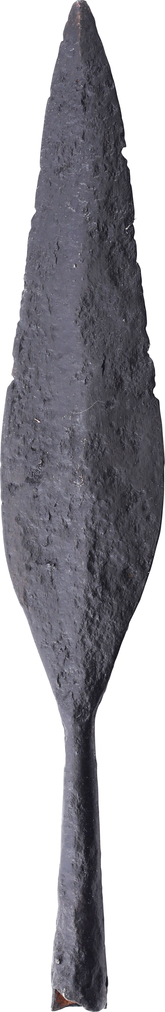 The Imperial Period. Forged iron, 6 3/8” length with well formed conical socket which extends through the tip as a medial. The leaf shaped cutting planes extending to both sides. Well preserved with minimal edge loss. Good excavated condition. These hand lances were thrown in the intermediate battle, before the melee, and largely lost.