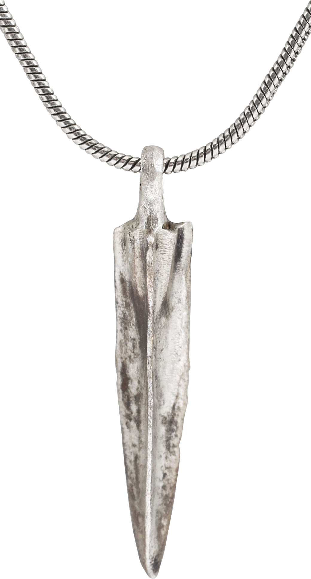 The time of Christ. Bronze just under 1” (0.95”) long of elongated triangular section pyramidal form with flat sides and conical seat for the shaft. One side with an adhesive release hole as typical. Surface with light texture from burial. Professionally refurbished with a silver overlay and mounted on a modern sterling silver neck chain for contemporary wear. Excellent example.