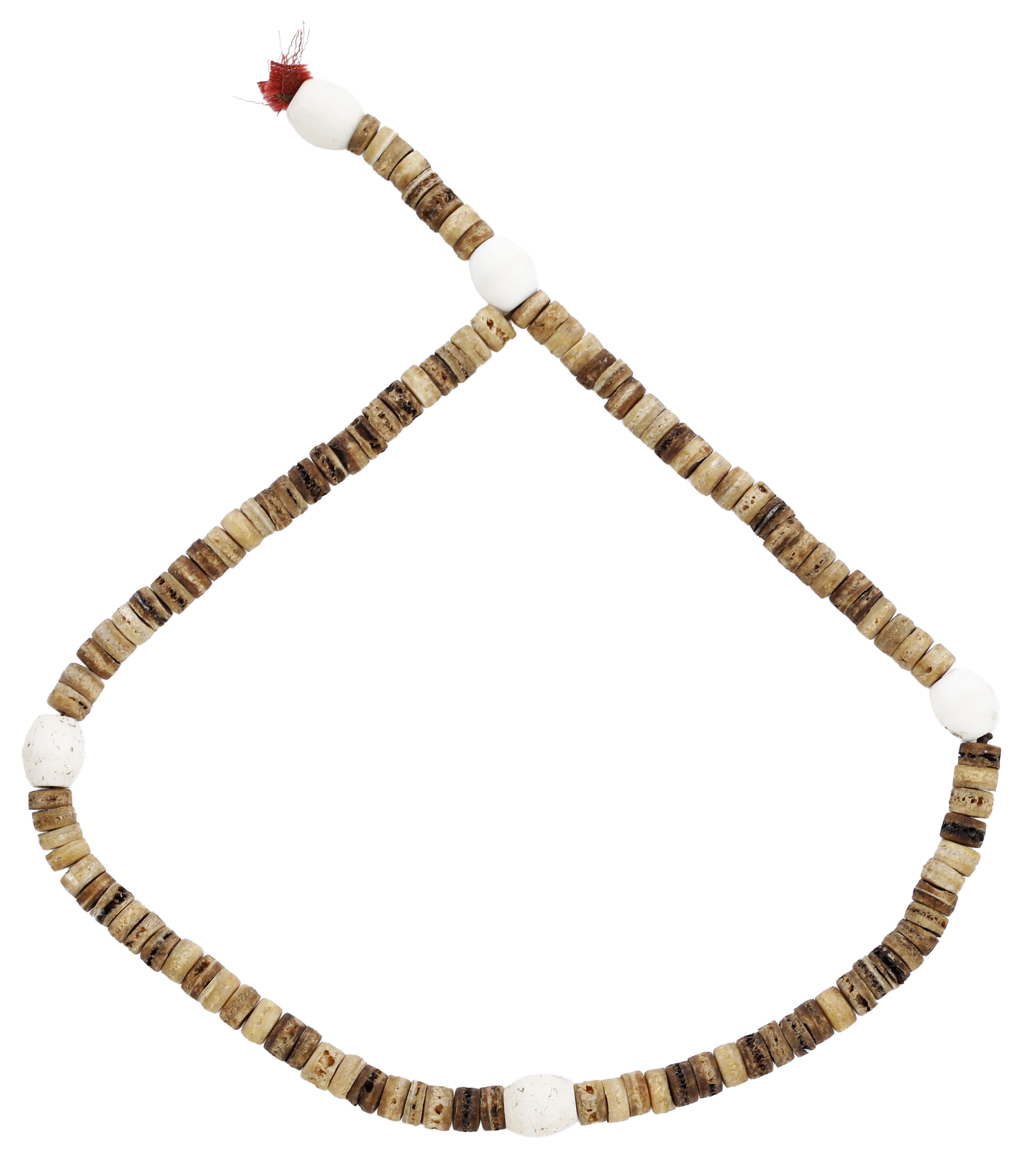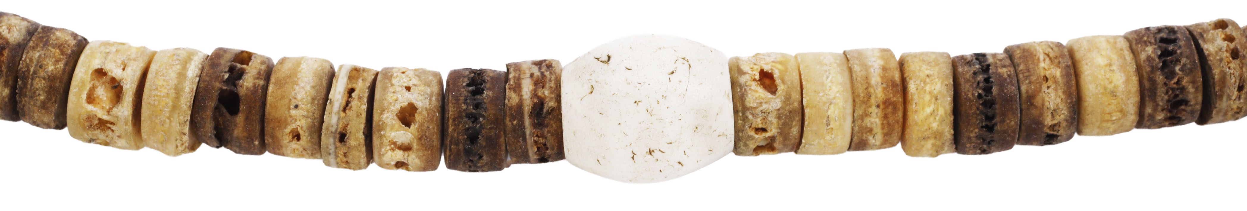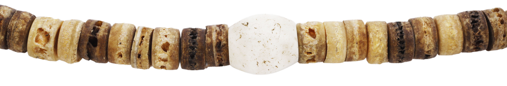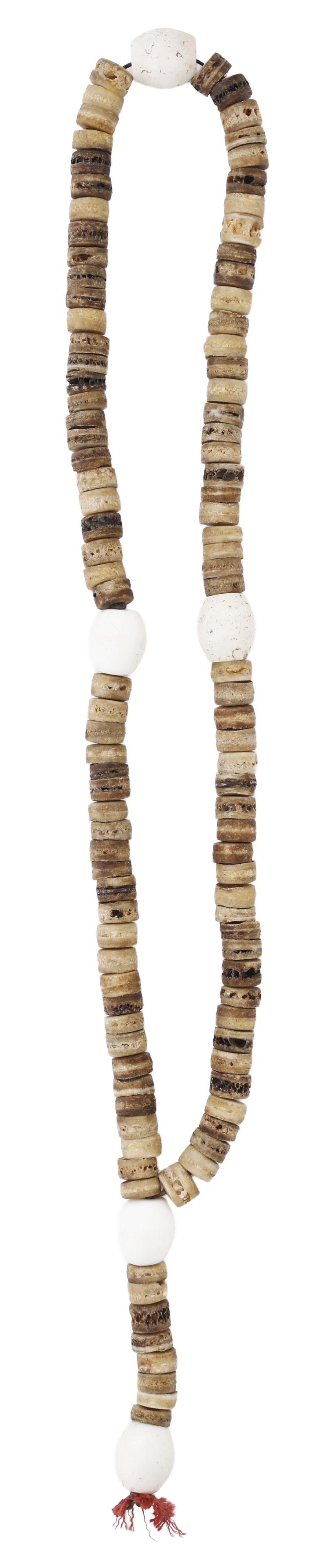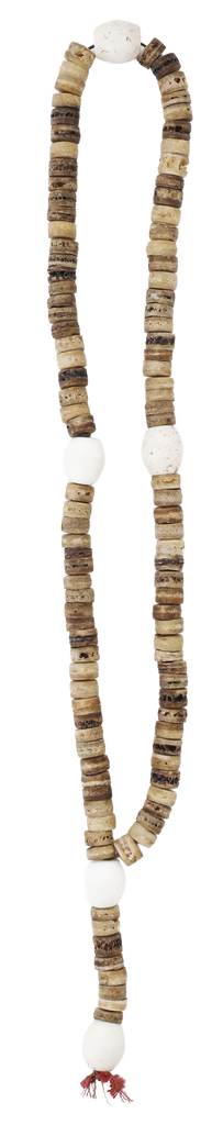 Antique to ancient. Lamist Buddhist. Complete strand consisting of 108 cylindrical disks made from snake vertebra divided into four ranks of 25 and a terminal of eight, by large white glass or stone beads. Complete, with expected wear form use.