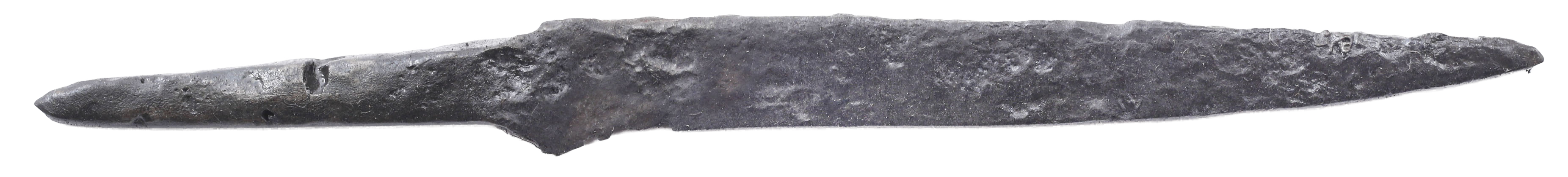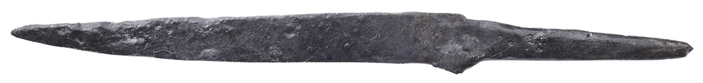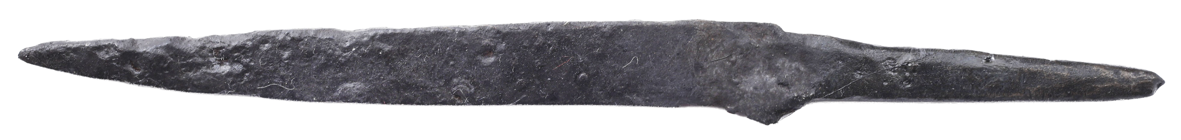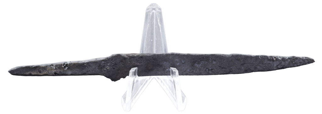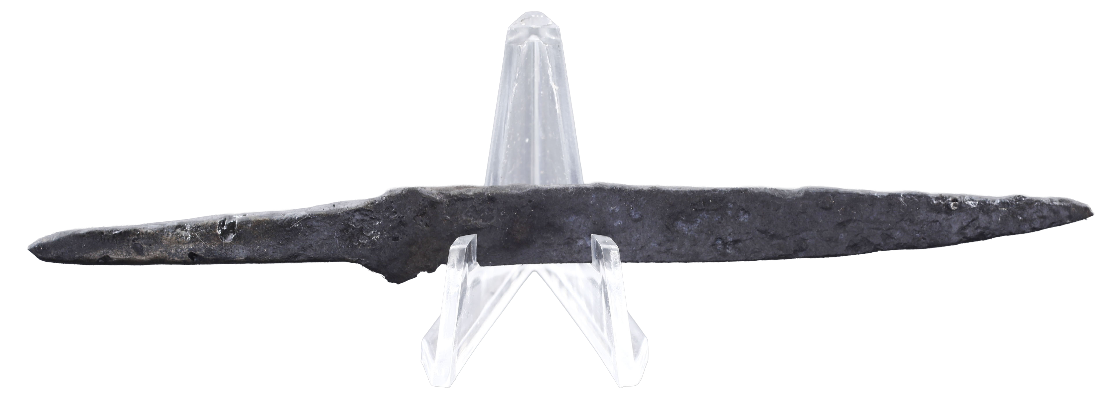 Forged iron, 4 3/4” (4.79”)” length with triangular section sharply tapering blade designed for slashing and thrusting in hand to hand combat. Originally mounted with a wood or antler grip and no guard, its size and light weight gave it an advantage over the heavier scramasax. Because of Vikings’ dependence on them, their weapons were imbued with spiritual significance. They were buried with their owners as part of the funerary process. Excavated and professionally conserved with Plexiglas display easel and Certificate of Authenticity.