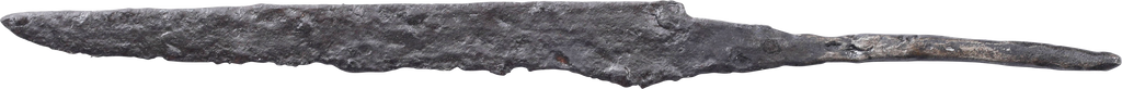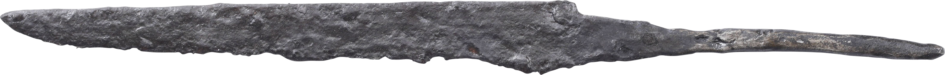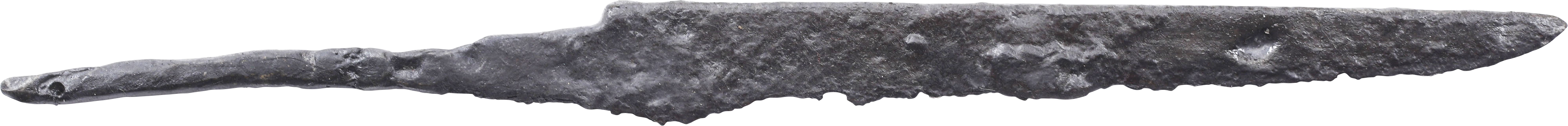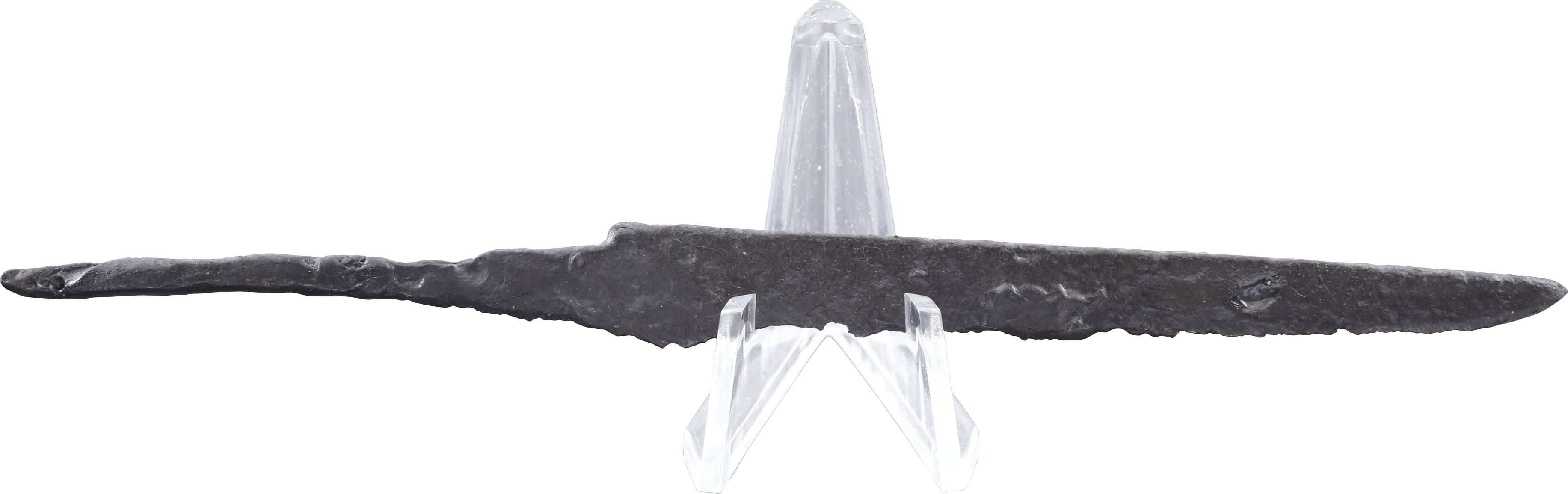 Forged iron, 5 3/8 (5.39”) length with wedge section sharply tapering blade designed for slashing and thrusting in hand to hand combat. Originally mounted with a wood or antler grip and no guard, its size and light weight gave it an advantage over the heavier scramasax. Because of Vikings’ dependence on them, their weapons were imbued with spiritual significance. They were buried with their owners as part of the funerary process. Excavated and professionally conserved with Plexiglas display easel and Certificate of Authenticity.