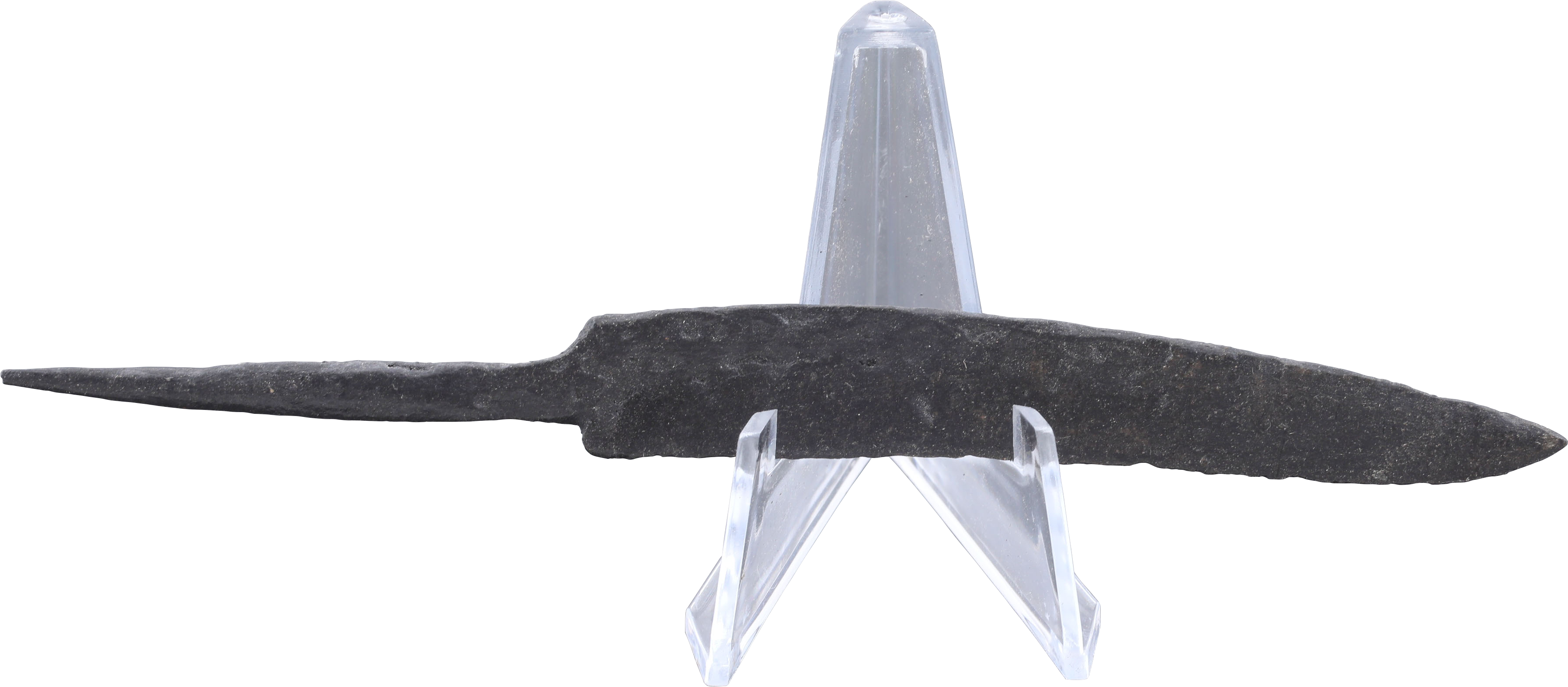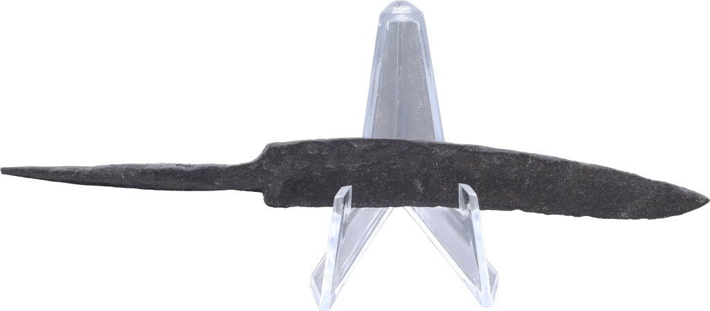 Just under 6 1/8” (6.10”) total length. Wedge section blade for slashing with a slightly dropped curved back. Whittle tang, to secure it to the wood, bone, or antler grip, now perished. (See Leather Working Reverend and Inhabitat for similar examples with original grips). Stable oxidation with a good profile, as typical for water finds. These side or pouch knives were among the most treasured possessions for Vikings, rather than the large seax with which they were buried. They likely had spiritual significance to the owner during his life. A fine weapon, suitable for throat slashing as well as organ depth thrusting attacks. Excavated and professionally conserved with Plexiglas display easel and Certificate of Authenticity.
