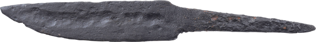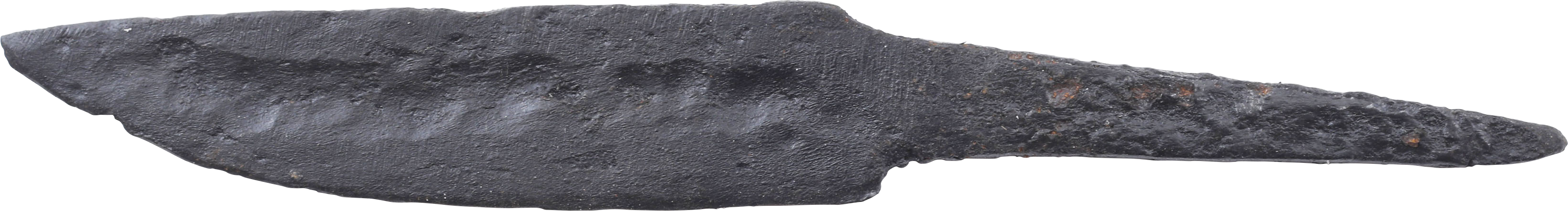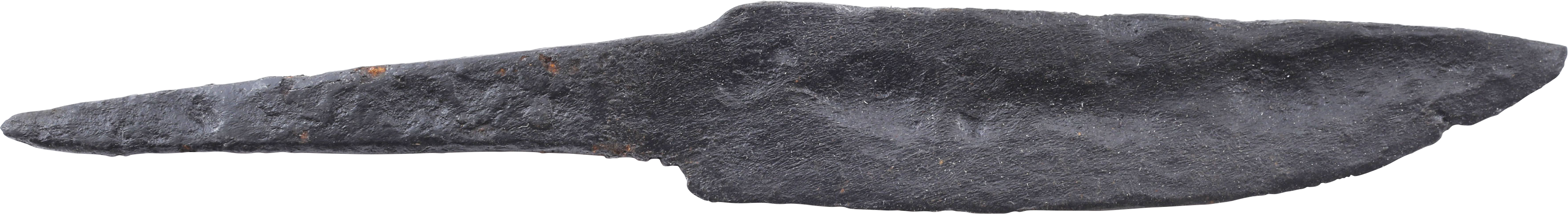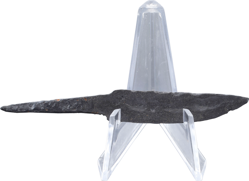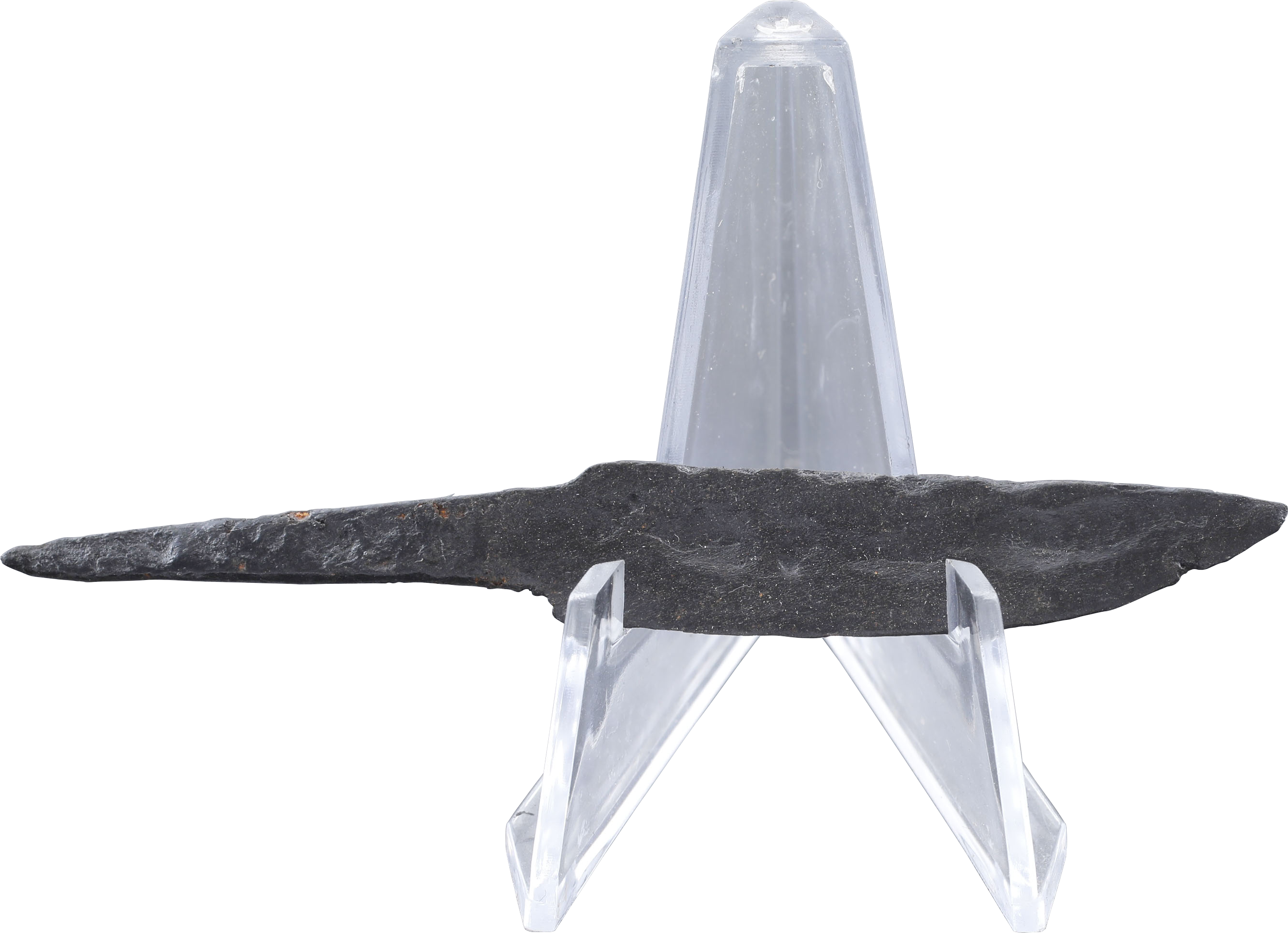Cambridgeshire England. About 3 5/8” (3.66”) total length. Slender wedge section blade for slashing in the scramseax style for thrusting. Whittle tang, to secure it to the wood, bone, or antler grip, now perished. (See Leather Working Reverend and Inhabitat for similar examples with original grips). Stable oxidation with a good profile, as typical for water, finds. These side or pouch knives were among the most treasured possessions for Vikings, rather than the large seax with which they were buried. They likely had spiritual significance to the owner during his life. A fine weapon, suitable for throat slashing as well as organ depth thrusting attacks. Excavated and professionally conserved with Plexiglas display easel and Certificate of Authenticity. Fine form.