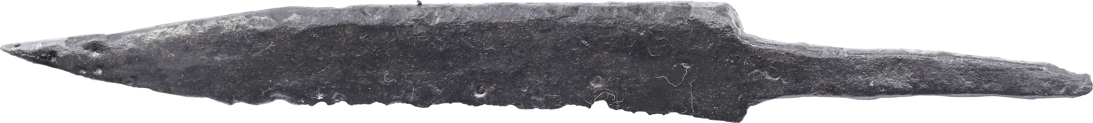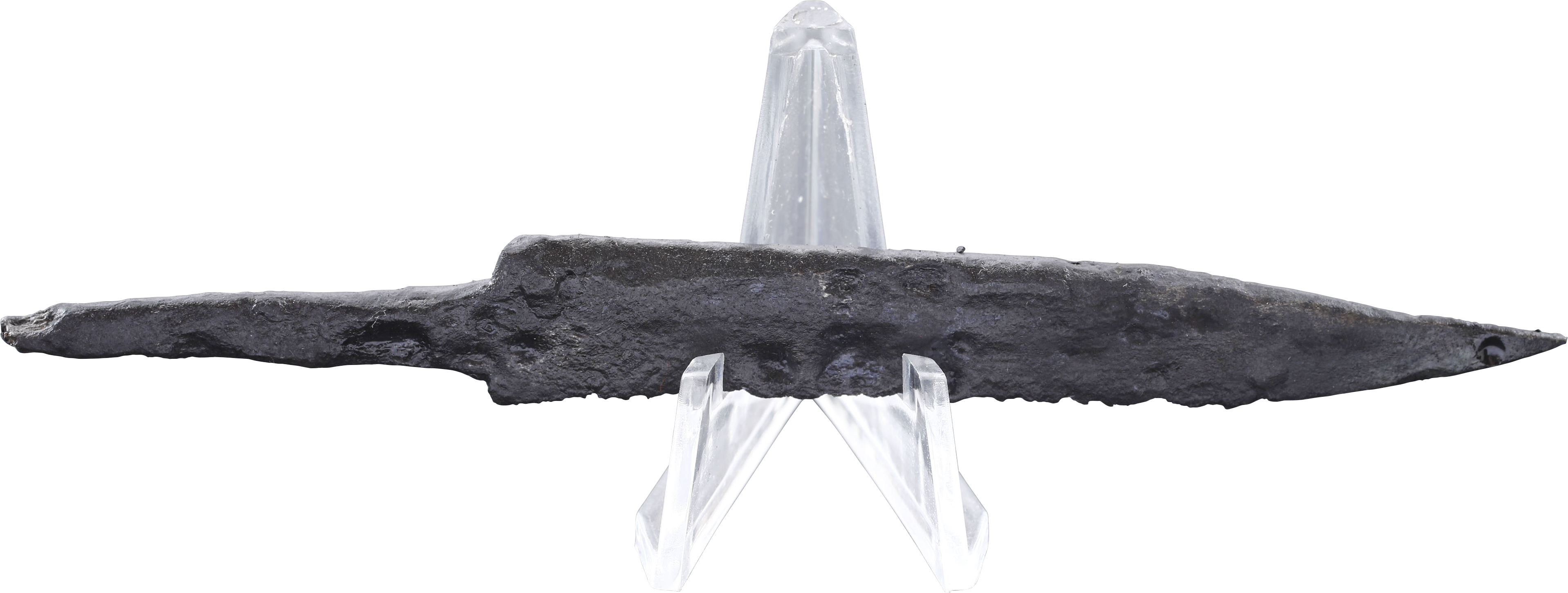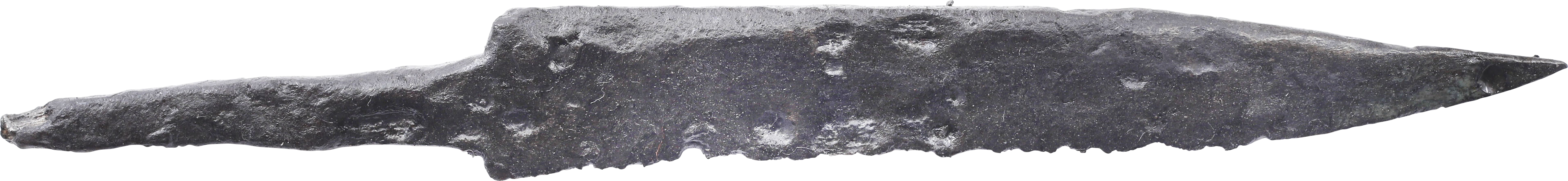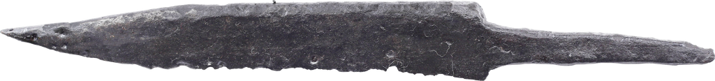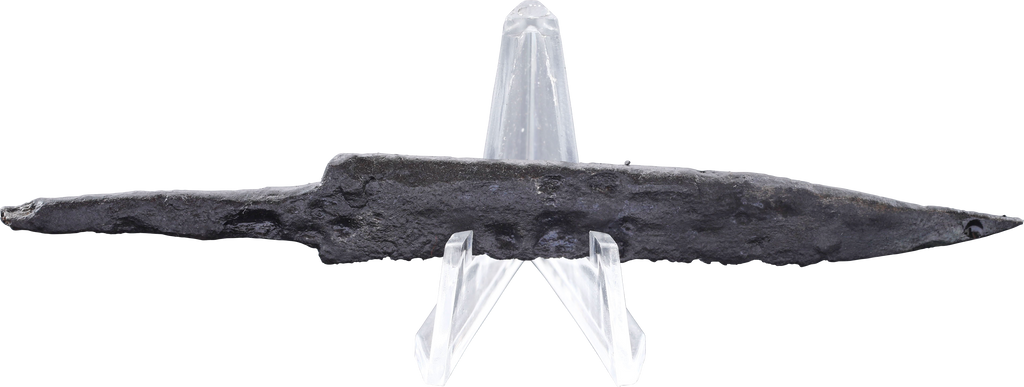 Just under 4 1/2” (4.49”) total length. Wedge section blade for slashing with a distinctly dropped point in the scramseax style for thrusting. Whittle tang, to secure it to the wood, bone, or antler grip, now perished. (See Leather Working Reverend and Inhabitat for similar examples with original grips). Stable oxidation with a good profile, as typical for water finds. These side or pouch knives were among the most treasured possessions for Vikings, rather than the large seax with which they were buried. They likely had spiritual significance to the owner during his life. A fine weapon, suitable for throat slashing as well as organ depth thrusting attacks. Excavated and professionally conserved with Plexiglas display easel and Certificate of Authenticity.