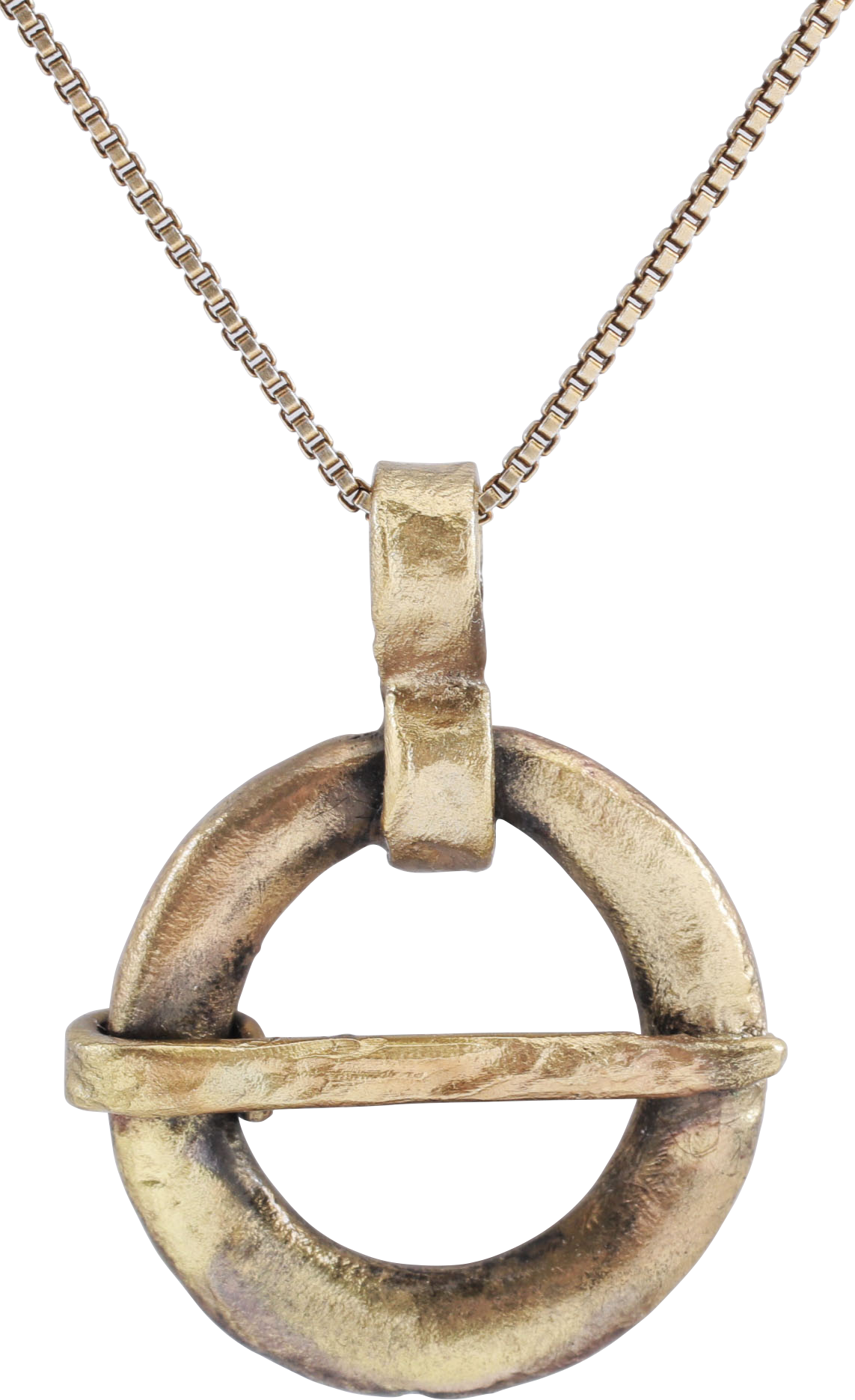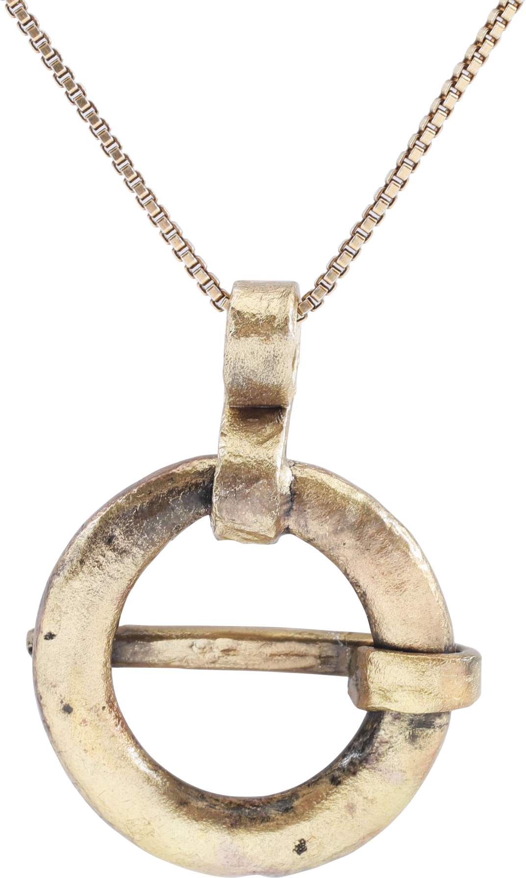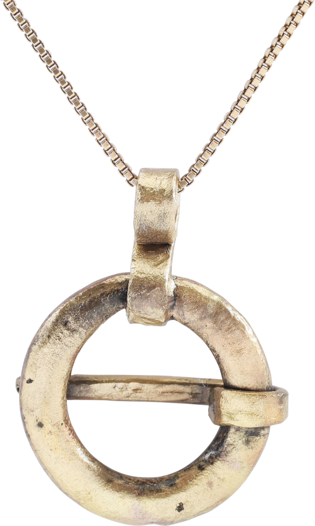 Gilt bronze, worn in numbers on the surface of the jerkin, to provide a measure of protection against sword cuts and, in fact, were a form of armor. See current Public Television programming for documentation of these in action. As protectors, they also held spiritual significance for the warrior. Petite example with circular section, over 3/4” (0.77”) diameter with slender cross pin. The surface textured and worn from burial. Professionally refurbished with the 24karat gold overlay restored, on an 18” gilt Sterling silver neck chain for contemporary wear. Jewelry gift boxed with a certificate of authenticity. Delicate form.