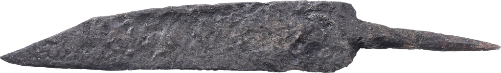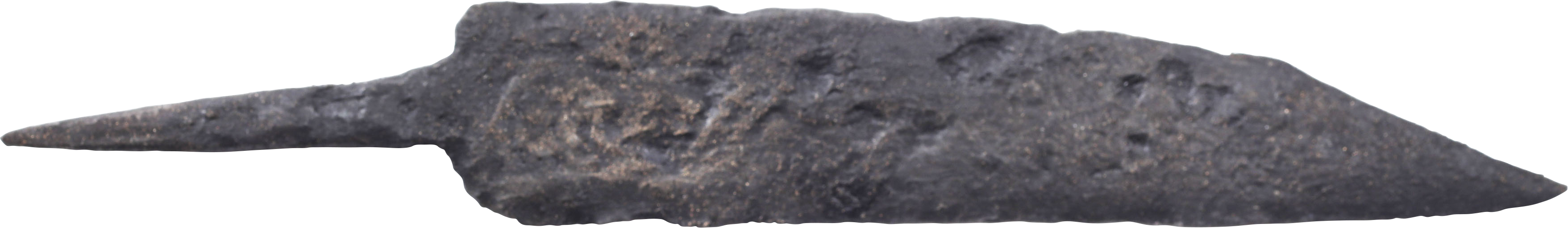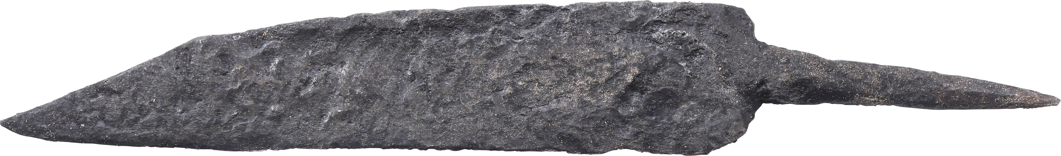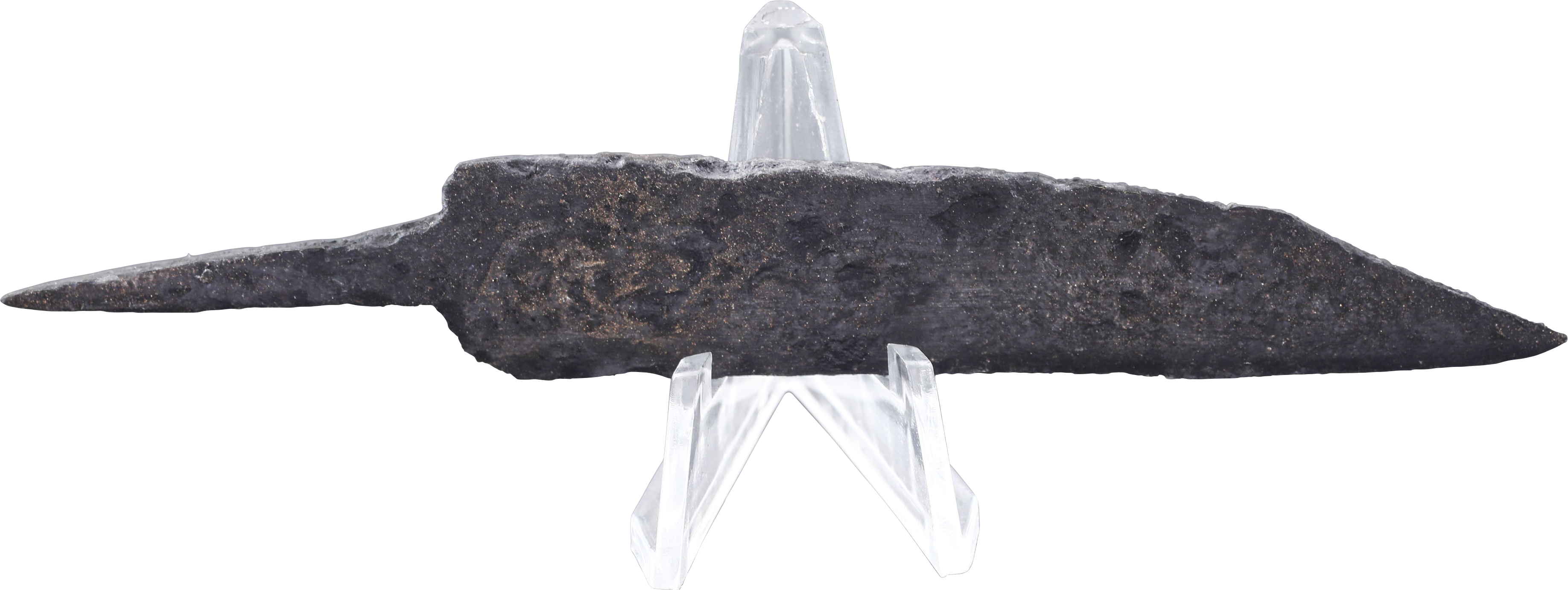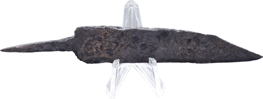 Just over 4 ½” (4.58”) length. Classic form with dropped point and near straight back. Tapered tang for mounting to a grip without a guard. This example is distinguished by the thinness of the blade, which confirms that it is not a work knife but a weapon. It is made for the single purpose of delivering a slashing wound. A working knife or multipurpose knife would be minimal, twice this thickness. This is a thousand-year-old Viking throat-slashing weapon. Professionally refurbished with Plexiglas display mount and certificate of authenticity.