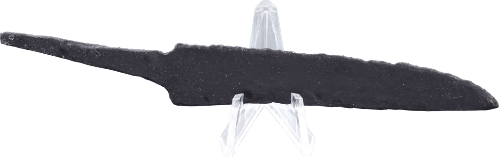 Just under 5 1/2” (5.42”) total length. Thin fighting section blade for Whittle tang, to secure it to the wood, bone, or antler grip, now perished. See Leather Working Reverend and Inhabitat for similar examples with original grips. Stable oxidation with a good profile, as typical for water finds. These side or pouch knives were among the most treasured possessions for Vikings, rather than the large seax with which they were buried. They likely had spiritual significance to the owner during his life. A fine weapon, suitable for throat slashing as well as organ depth thrusting attacks. Excavated and professionally conserved with Plexiglas display easel and Certificate of Authenticity.