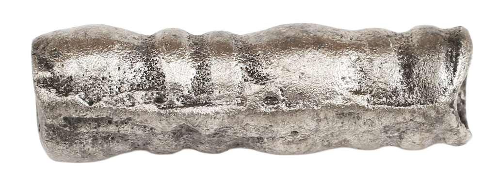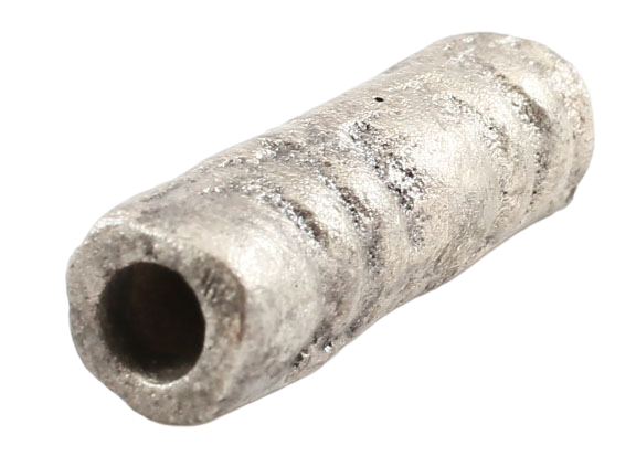 Compound bead form specific to Vikings, with double balusters flanked by banding. Cast with seams evident both sides. Originally silvered with the silver now restored. Surface textured from burial. 1 1/4” length from an elaborate pectoral/necklace display. Beads were valued more than gold to Vikings and they produced them as well as pillaged and ransomed for them. In the 10th century, they went to Indonesia specifically to procure a ransom of their legendary miniature beads. A fine centerpiece for modern jewelry creation.