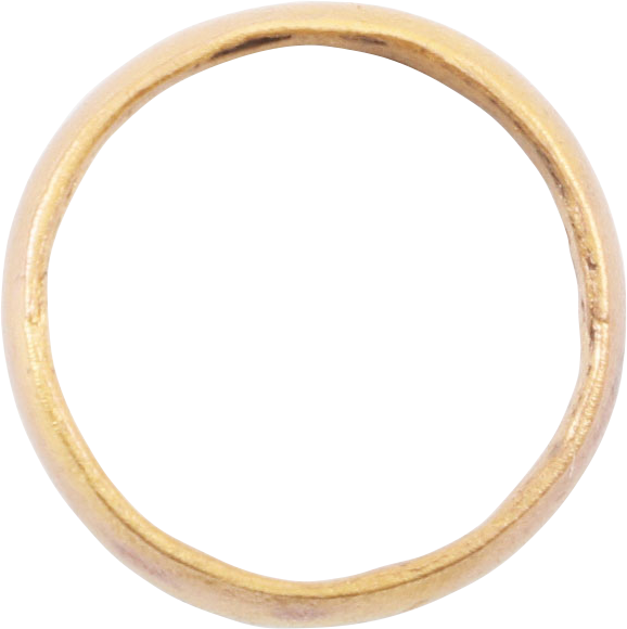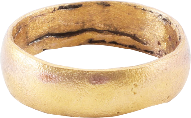 Gilt bronze, made by the interior core casting method and never finished. Low rounded face. 5.9mm width, size 8 1/4. Cast with a central core to distribute the metal and heat. The core was then laboriously removed by hand, but that removal was never completed here and significant remnants of the core remain. Professionally refurbished with the 24karat gold surface restored. Surface textured from burial. Jewelry gift boxed with a certificate of authenticity.