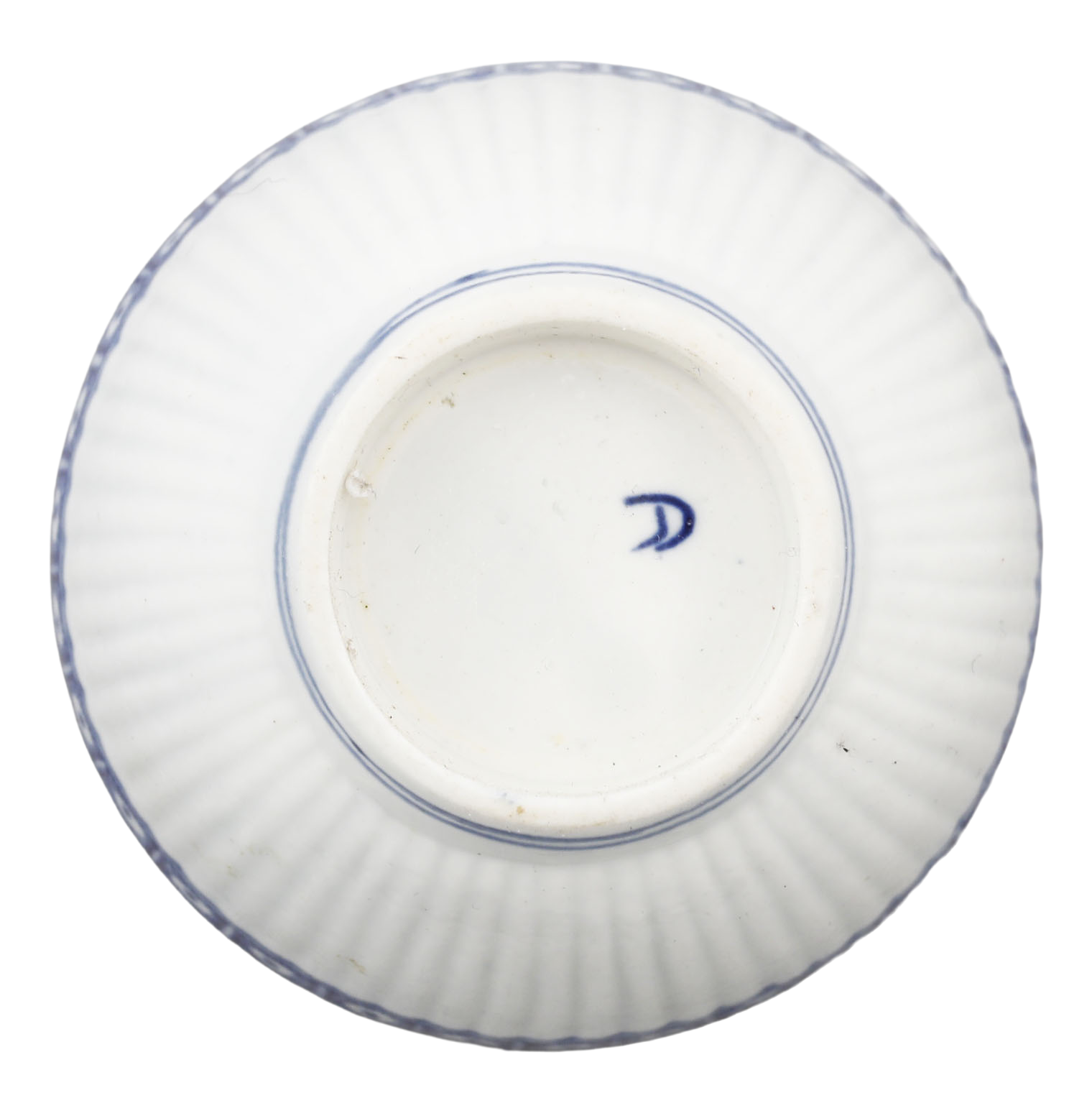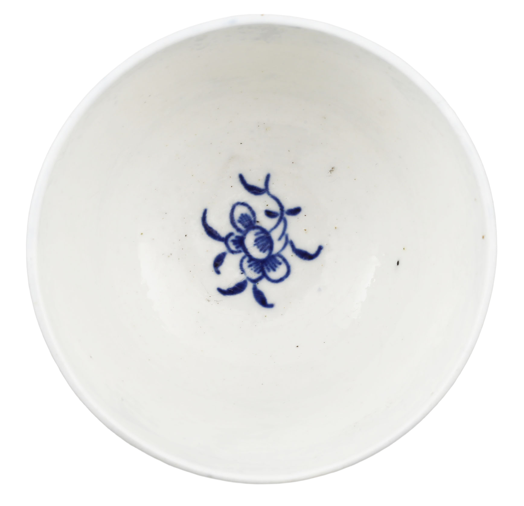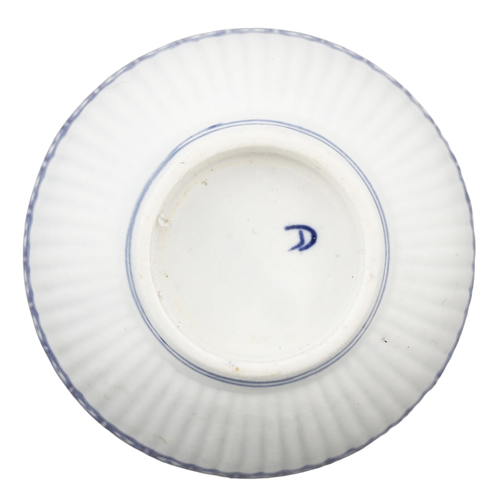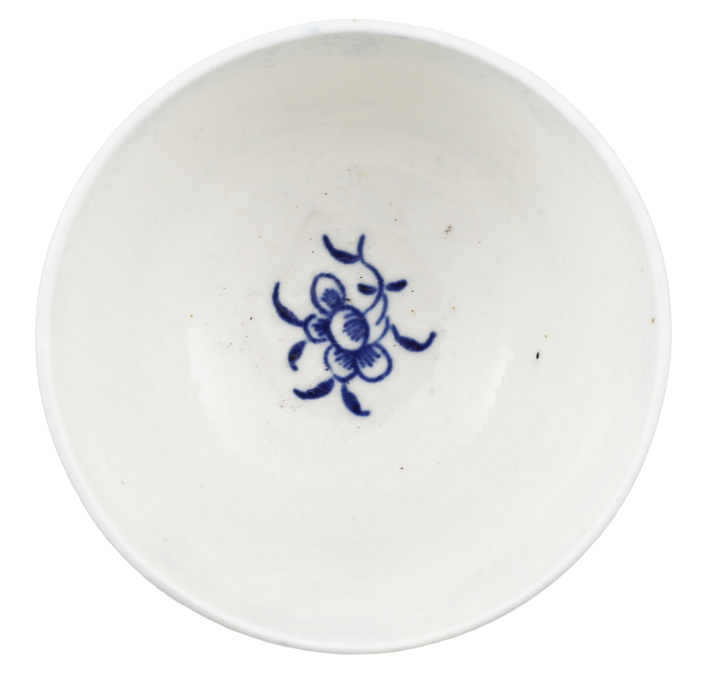 First Period (Dr Wall Period) 2 5/8” diameter, blue on white. With shanked body. A flower in the well. Blue barred crescent mark underglaze to the bottom. At the time, tea was very expensive and kept under lock and key. It was consumed as a luxury in small quantities served in these diminutive bowls or cups. Excellent.