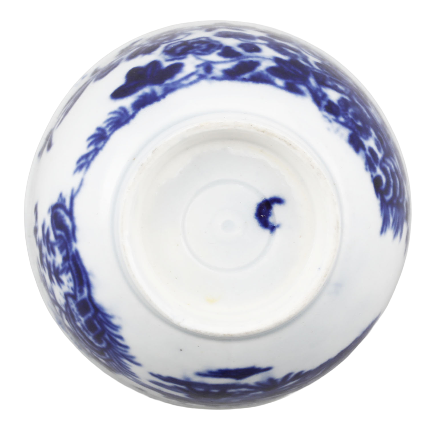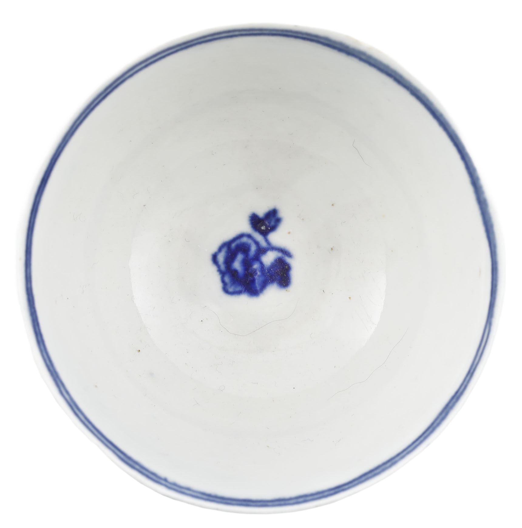 First Period (Dr Wall Period) 2 5/8” diameter, blue on white decorated with the “fence pattern”. Blue crescent mark underglaze to the bottom. At the time, tea was very expensive and kept under lock and key. It was consumed as a luxury in small quantities served in these diminutive bowls or cups. Excellent.