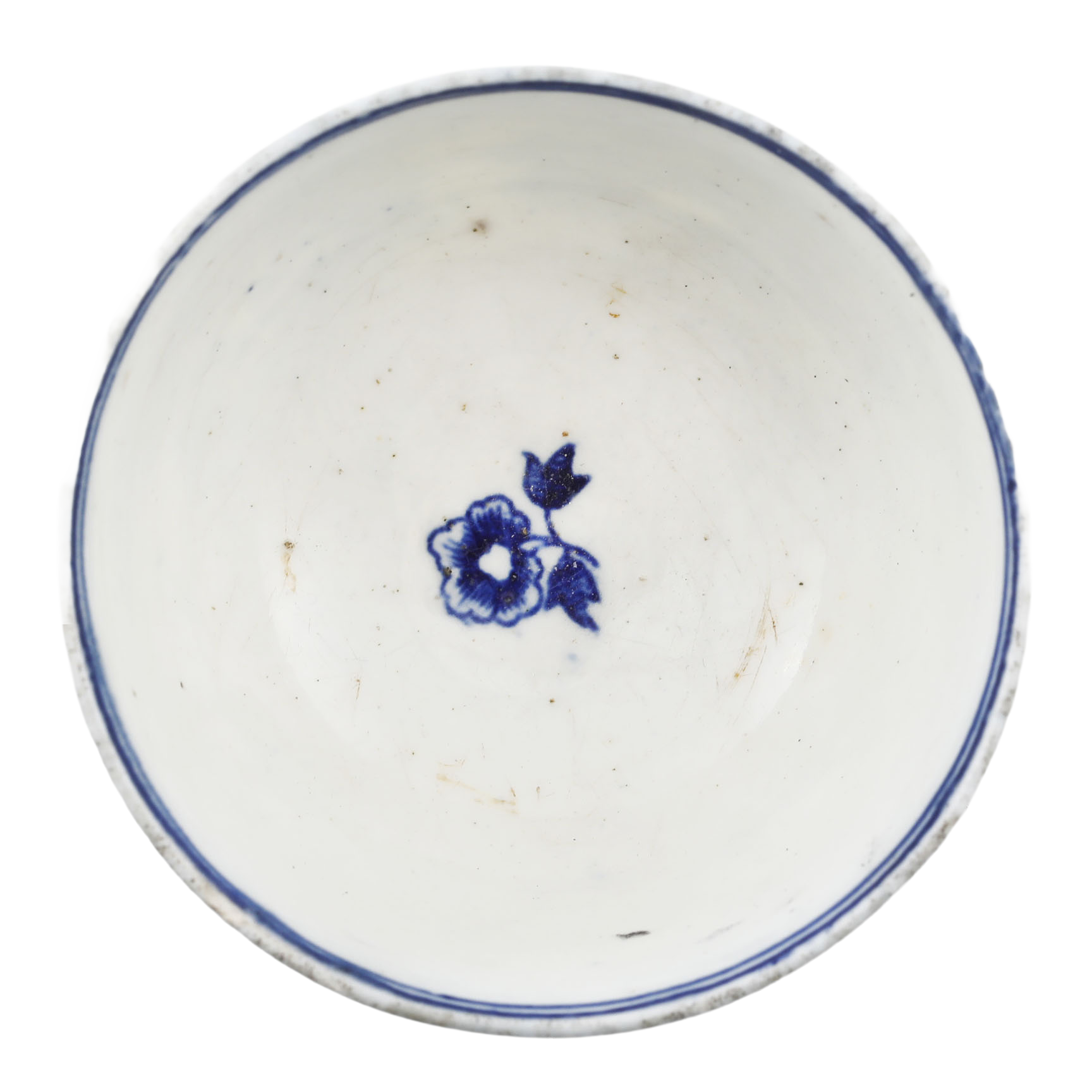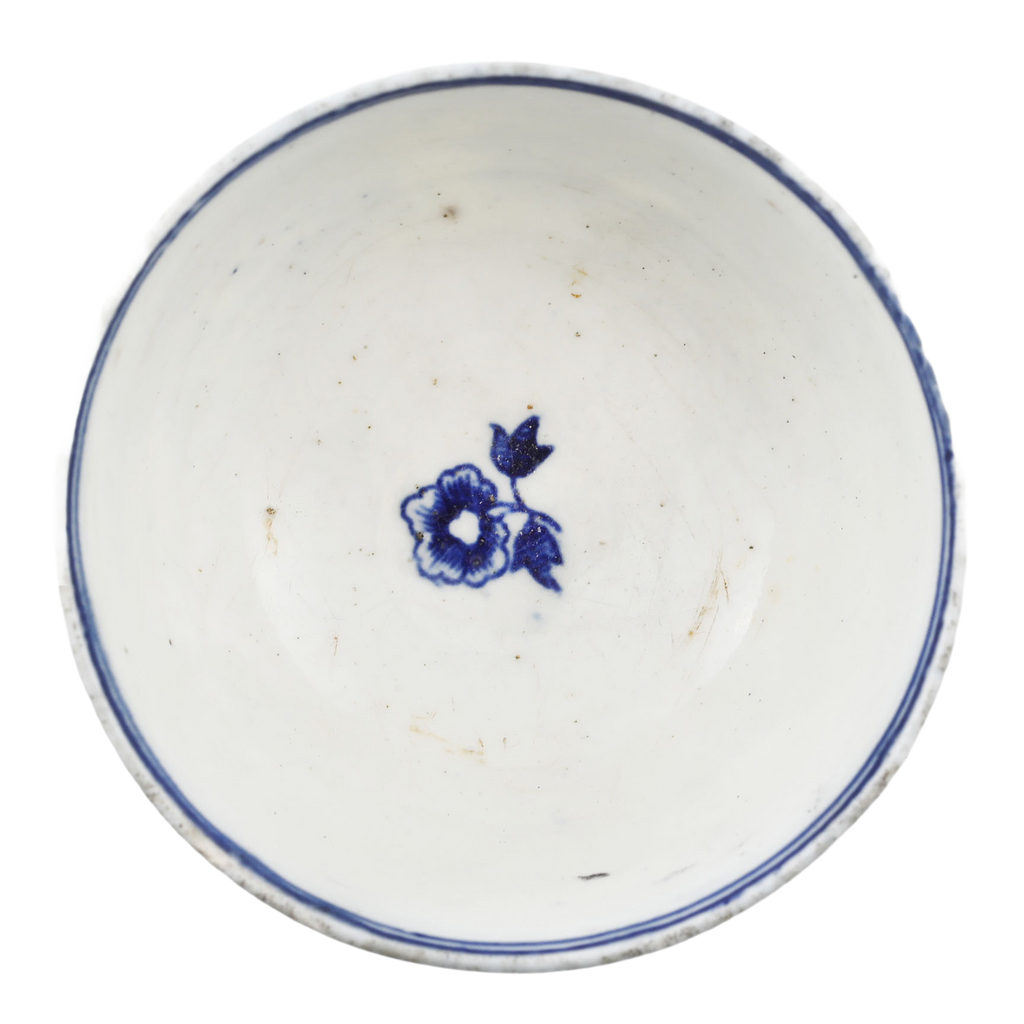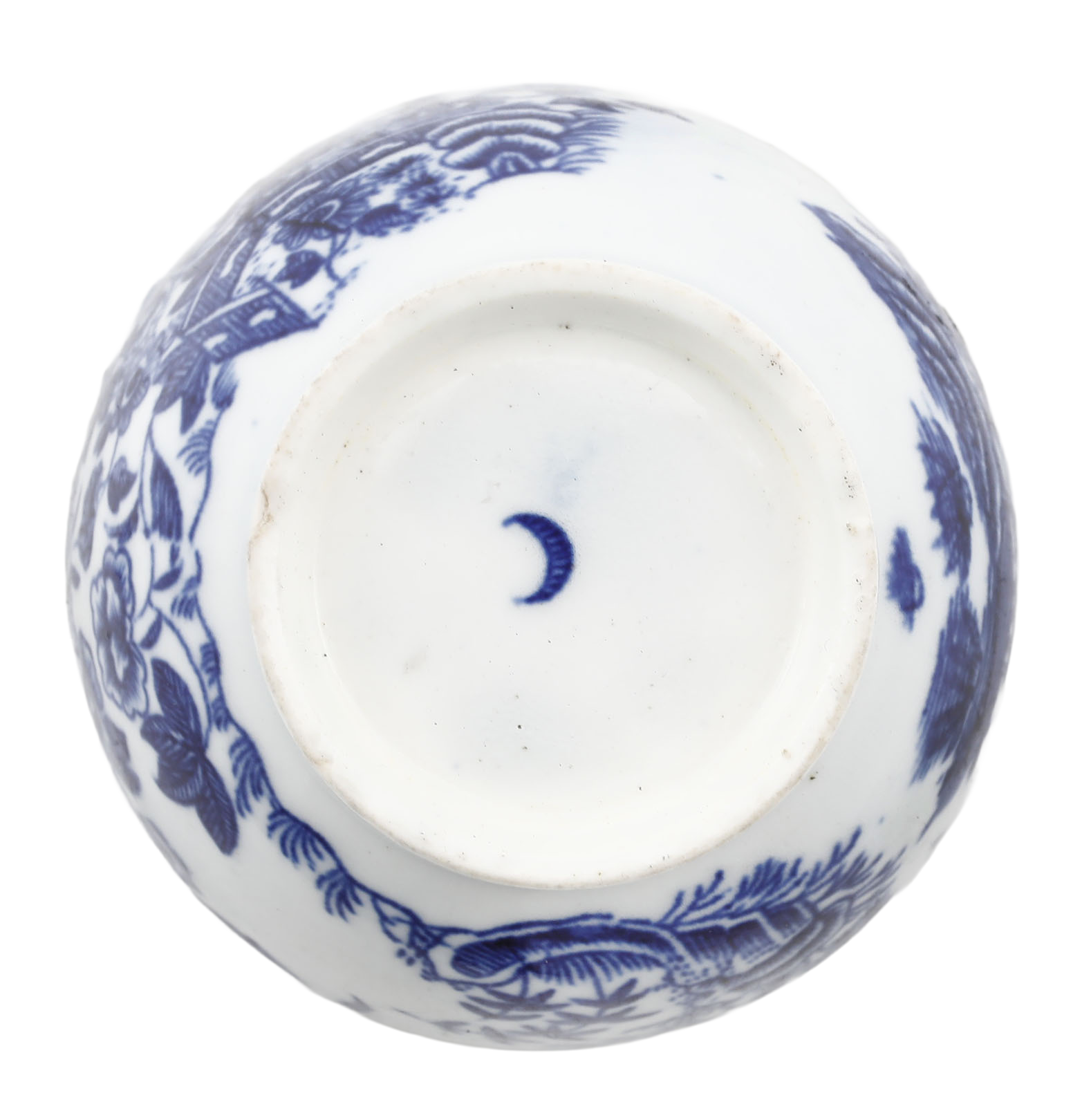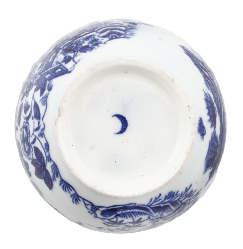 First Period (Dr Wall Period) 2 5/8” diameter, blue on white decorated with the “fence pattern”. Blue crescent mark underglaze to the bottom. At the time, tea was very expensive and kept under lock and key. It was consumed as a luxury in small quantities served in these diminutive bowls or cups. Tiny flake to the foot otherwise excellent.