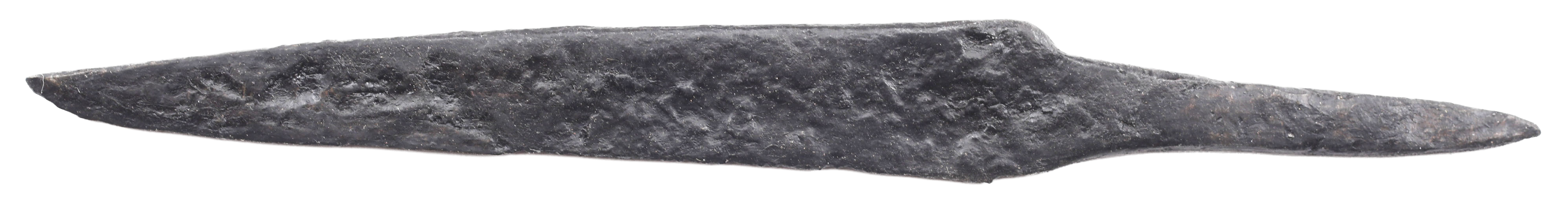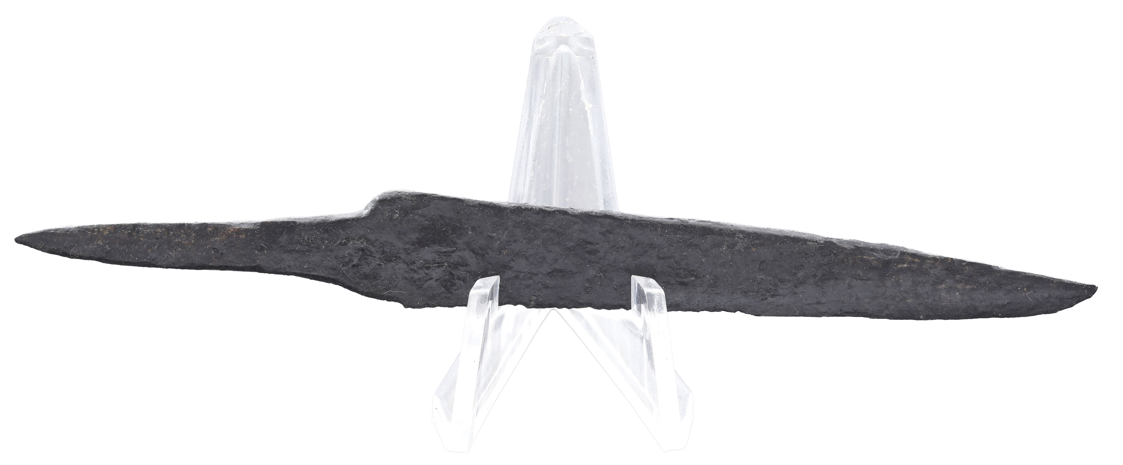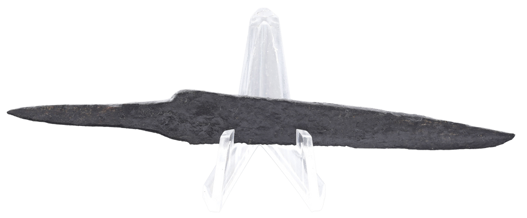 Just under 4 ¼” (4.21”) total length. Broad wedge section blade with down straight back for slashing. Whittle tang, to secure it to the wood, bone, or antler grip, now perished. Isolated pockmarks oxidation mixed with some original surfaces as typical for water finds. These side or pouch knives were among the most treasured possessions for Vikings and it was these, rather than the large seax with which they were buried. They likely had spiritual significance to the owner during his life. A fine weapon, suitable for throat slashing as well as organ depth thrusting attacks. (Leather Working Reverend and Inhabitat for similar examples with original grips). This example was recovered in Norway in the 19th century. Excavated and professionally conserved with Plexiglas display easel and certificate of authenticity.