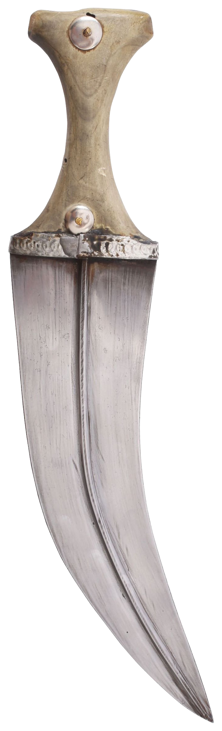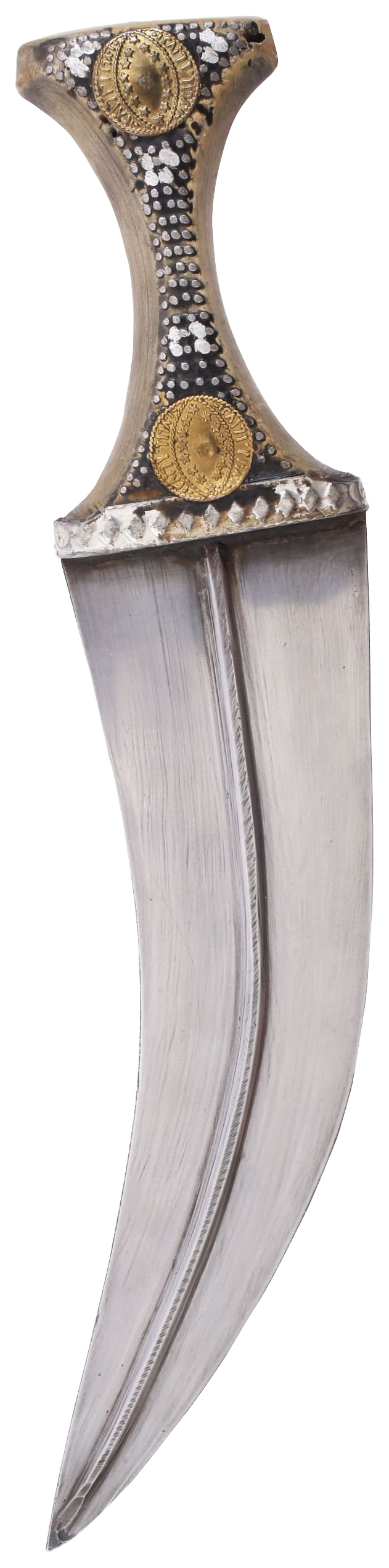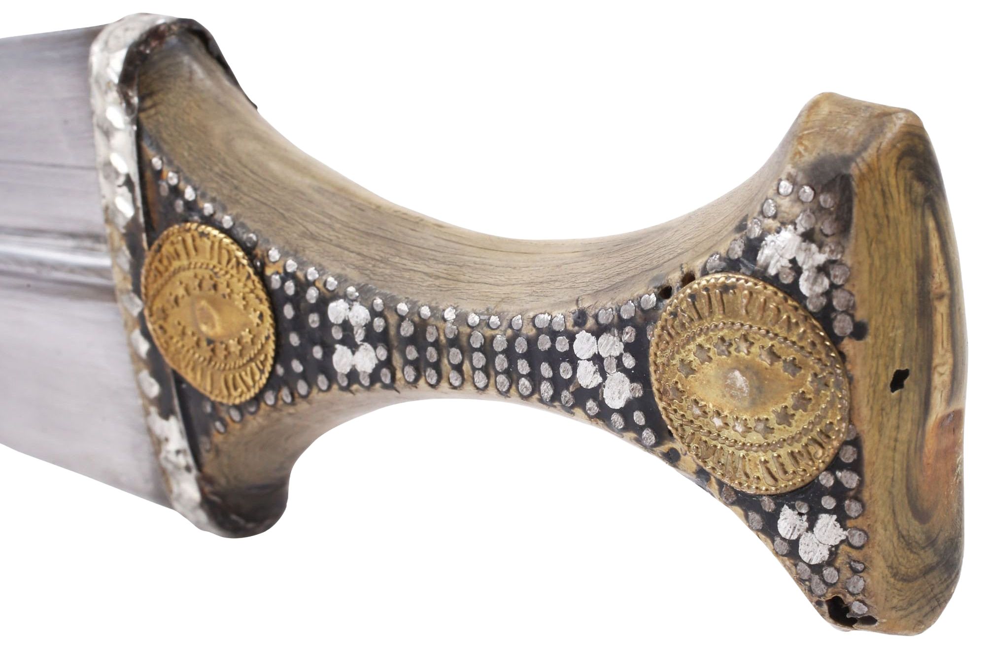One piece horn hilt decorated with white metal piques and pseudo gold coins. Embossed metal base band. Good quality 8 ¾” broad d.e. blade with high medial ridge. Blade bright with light tool finish as made.