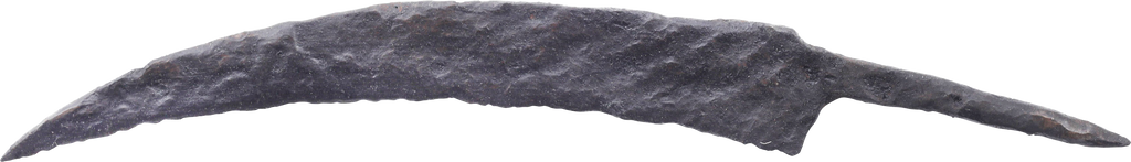 North Europe. Forged iron 5 3/4” length. The curved wedge section blade with squared base showing Roman influence. As with Vikings later, Celts preferred a small slashing knife. Increased size translates to a slower attack and with a moving target, decreased accuracy. This blade form derives from the overhand back slash capable of tearing a man’s throat to the spine but at the price of the loss of primary frontal protection. You had to get it right or do it clandestinely. Excavated and professionally conserved with Plexiglas display easel and certificate of authenticity.
