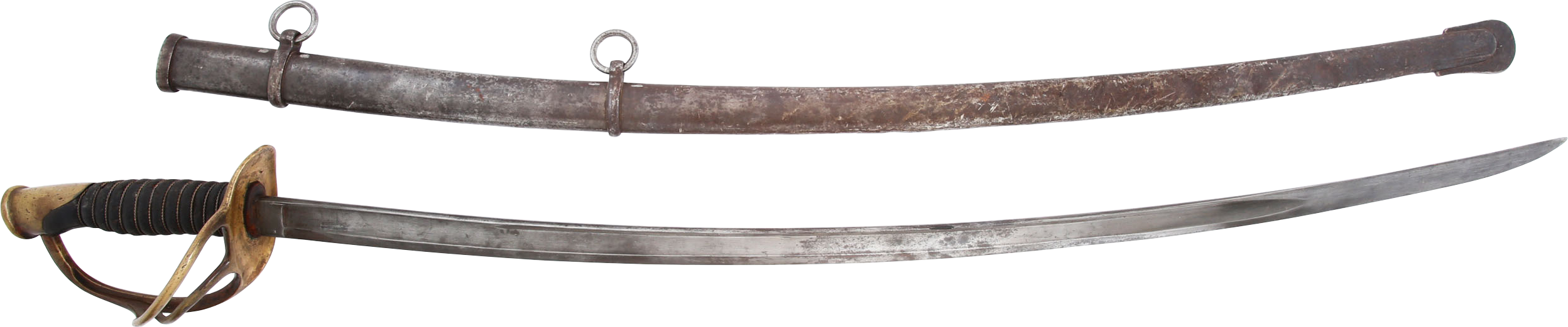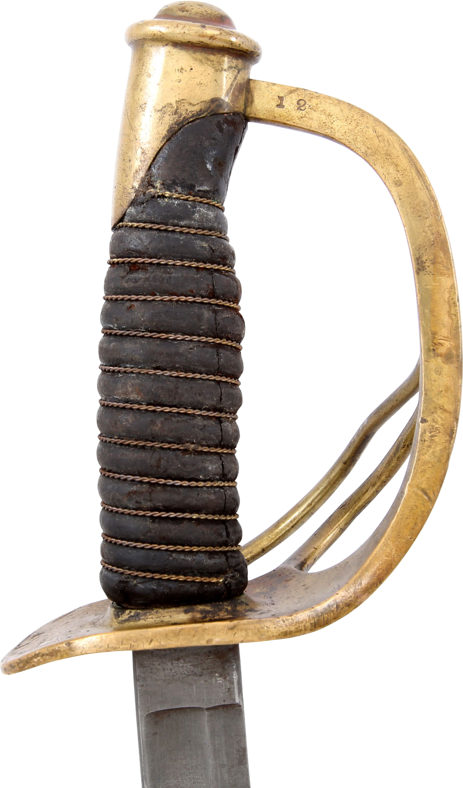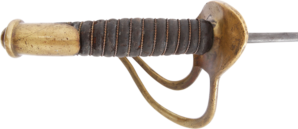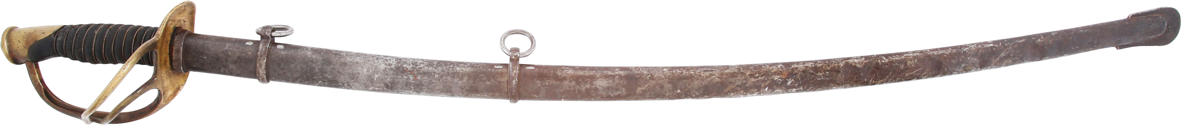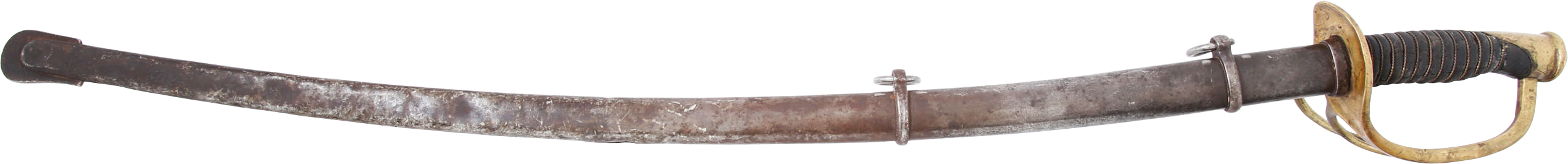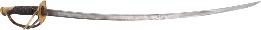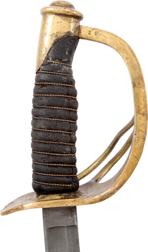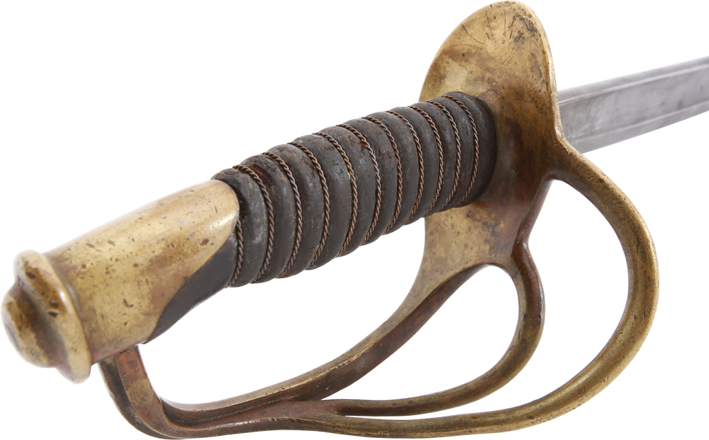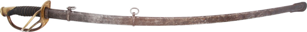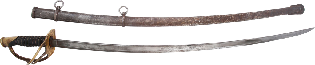 1860 pattern. This example was imported from one of the German manufacturers but with no identifying (maker’s) marks, a feature generally interpreted as indicating made for Confederate use. Those makers supplied the US government, state militias and, the Confederacy. To avoid jeopardizing Union contracts such swords, which were run through the blockades and sometimes intercepted, were produced without maker identification. Hilt with a stamped 12. Typical condition for the period. The grip drying and the blade crisp with smooth gray patina. Scabbard with good clean surface, the lower half with several shallow dents.