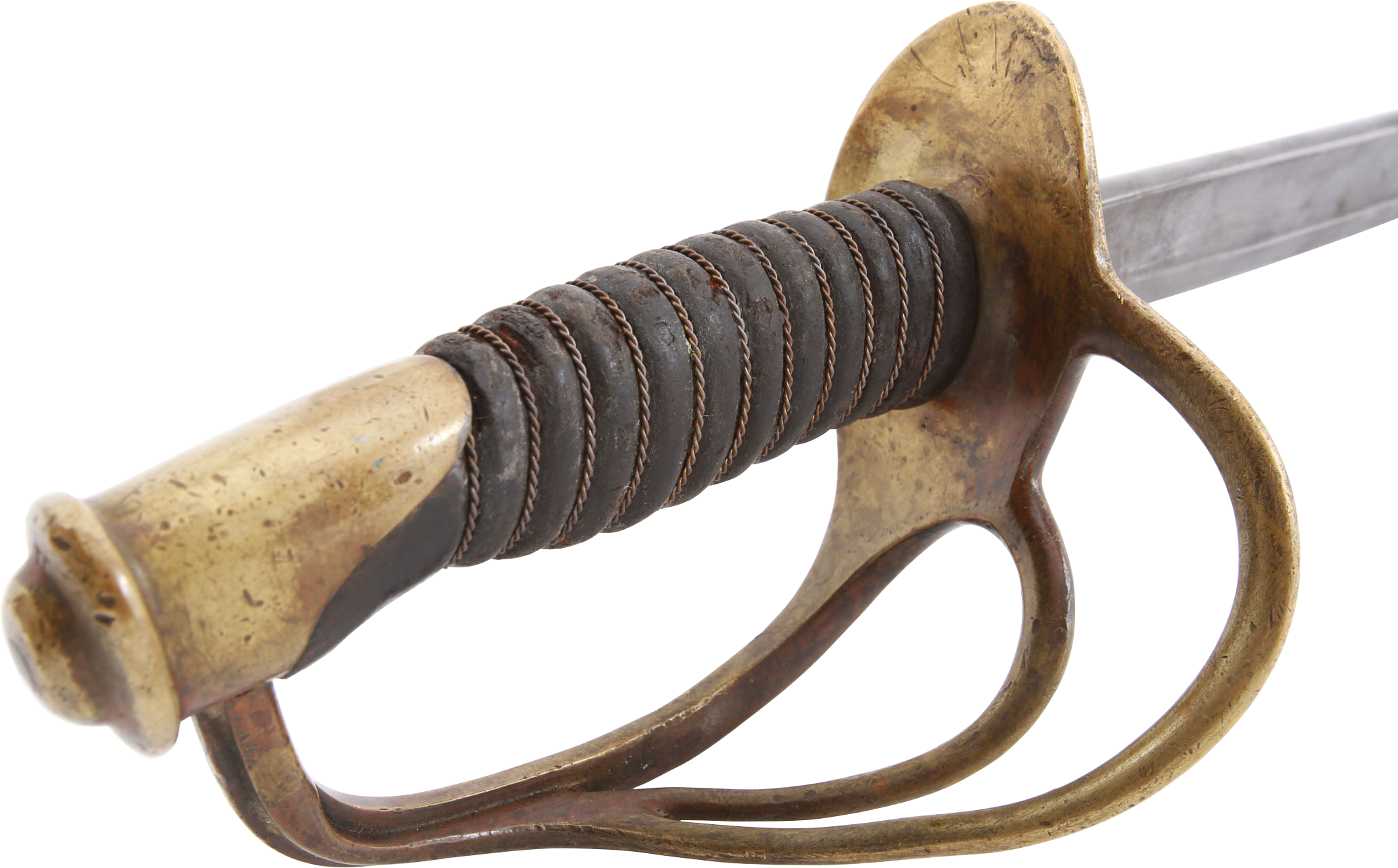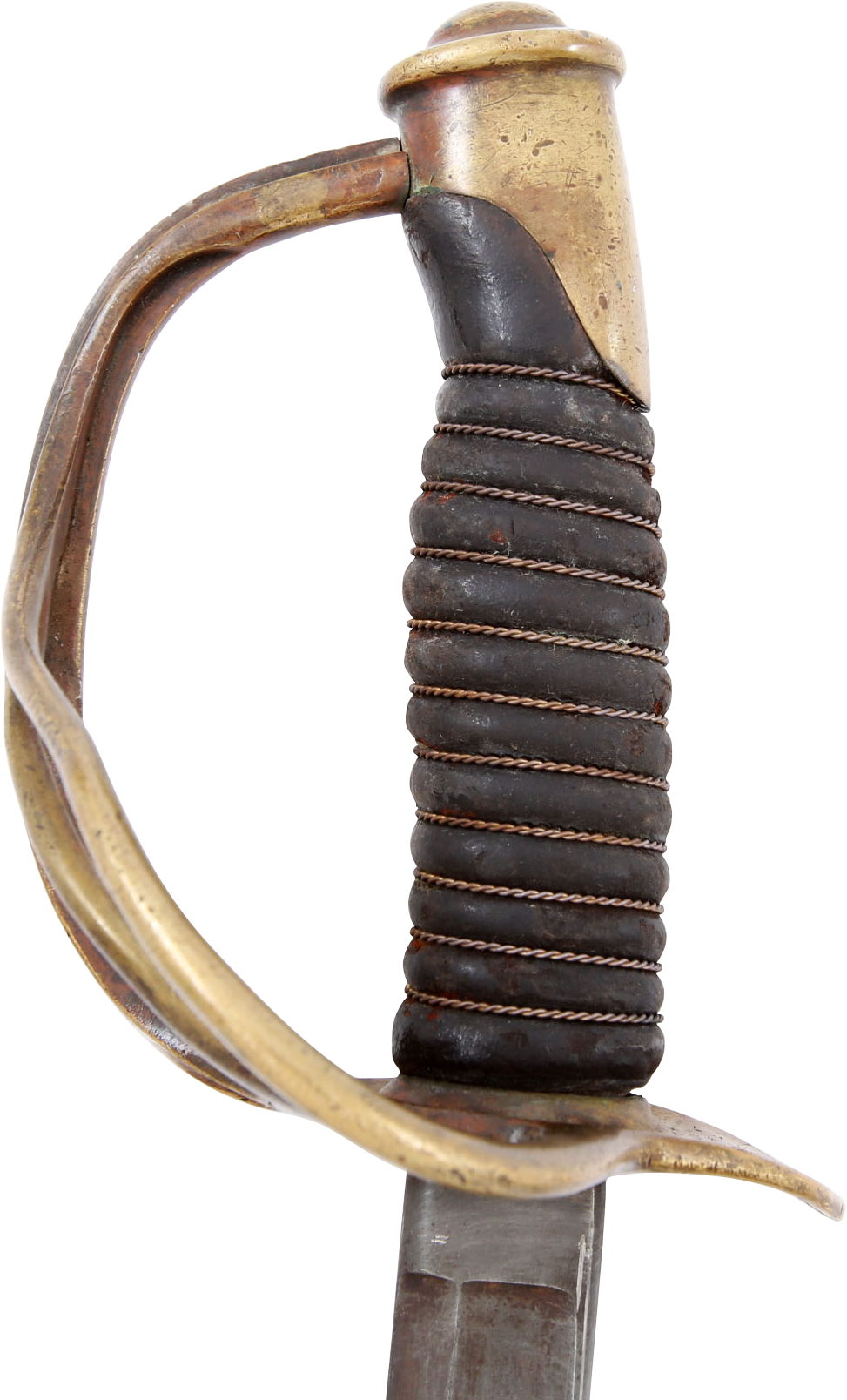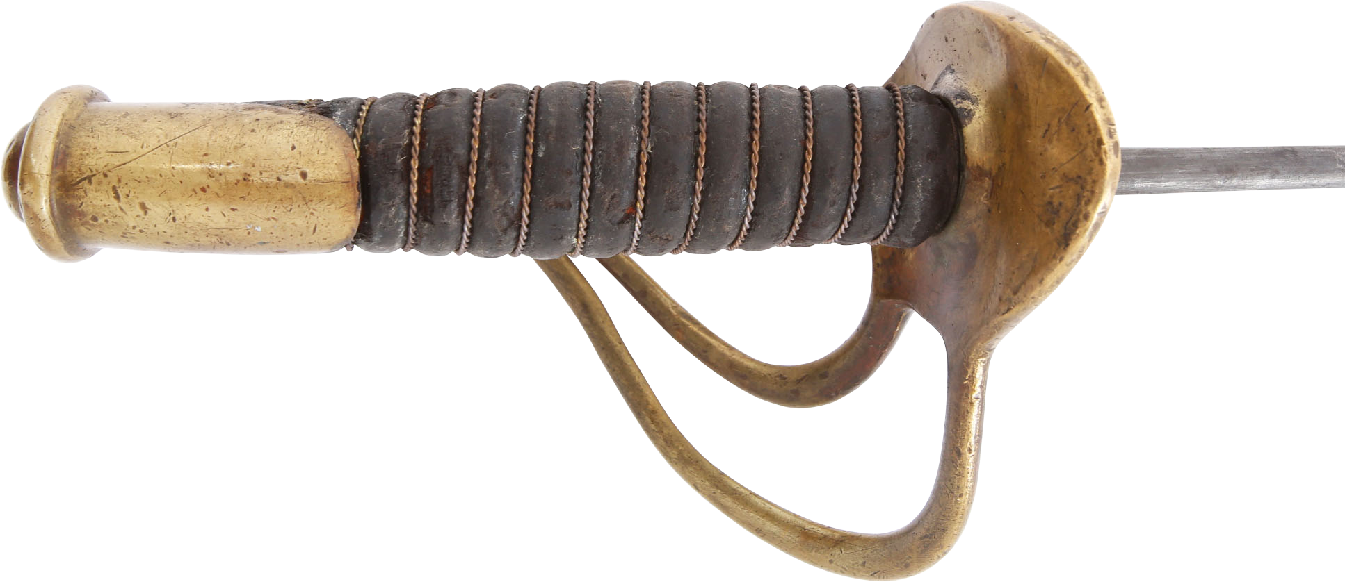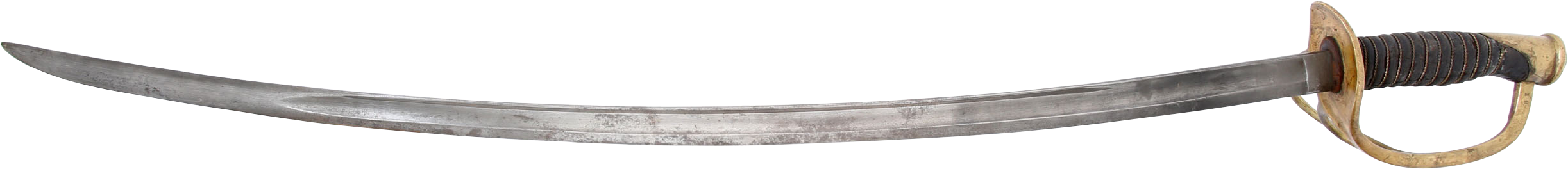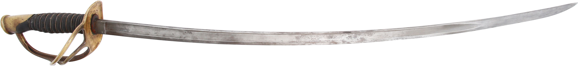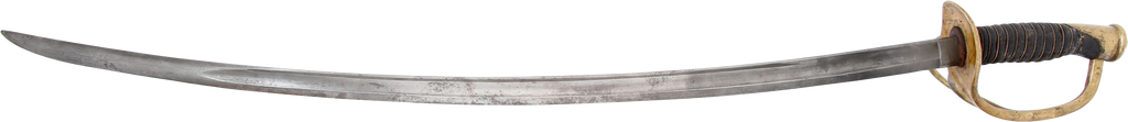 1860 pattern. This example was imported from one of the German manufacturers but with no identifying (maker’s) marks, a feature generally interpreted as indicating made for Confederate use. Those makers supplied the US government, state militias and, the Confederacy. To avoid jeopardizing Union contracts such swords, which were run through the blockades and sometimes intercepted, were produced without maker identification. Hilt with a stamped 12. Typical condition for the period. The grip drying and the blade crisp with smooth gray patina. Scabbard with good clean surface, the lower half with several shallow dents.