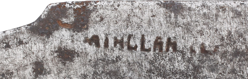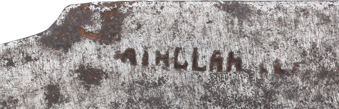Large, 14” opened. Elegant 6 ½” lock back blade with a dropped point, with maker’s mark MINGLAN to the left side. That mark references Paris maker (Edward) Mongin who produced knives of this type for the Spanish market. See Armas Blancas en Espana, p.126 for an example. This knife was made in Spain with the mark for the benefit of marginally literate buyers. Horn grip scales with brass star pivot mounts. Sound and tight with minor surface degradation to the horn as expected.