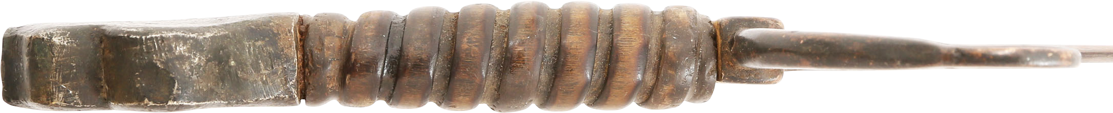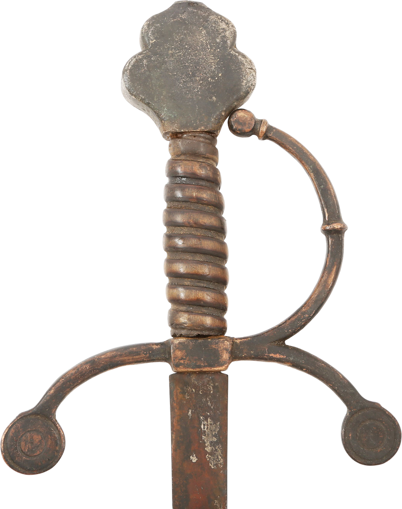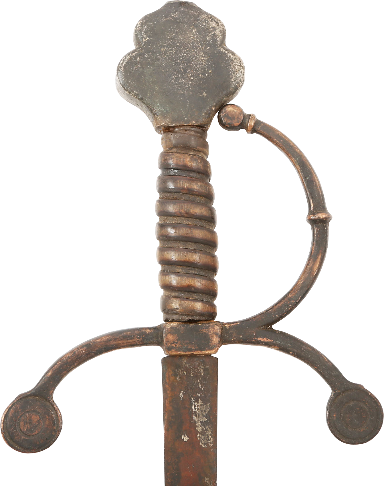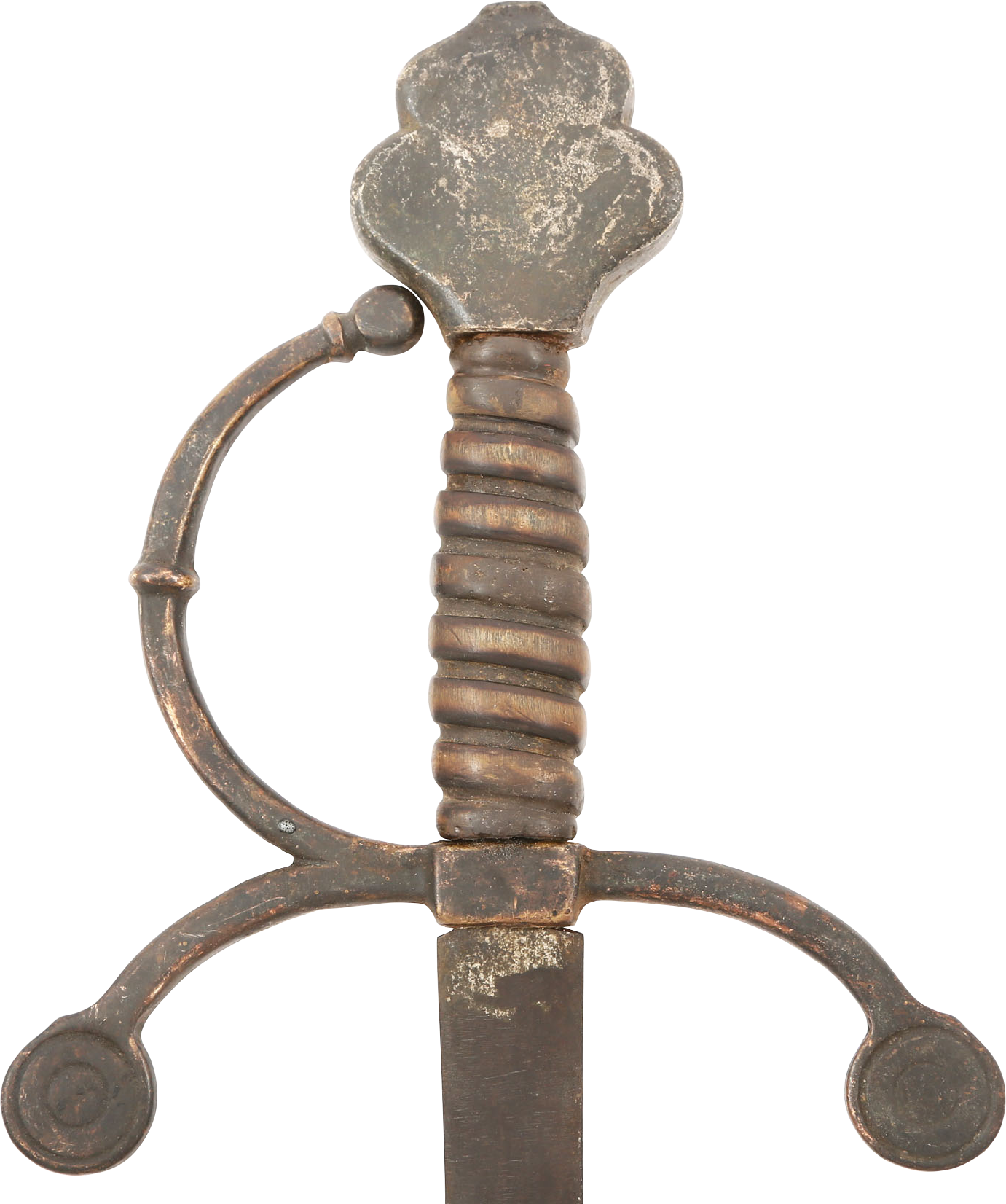 Bronze hilt of falchion form with spirally fluted horn grip. 29 5/8” straight double-edged blade. Blade shows brown surface patina with remnants of old plating. Sound, tight and showing genuine ageing.