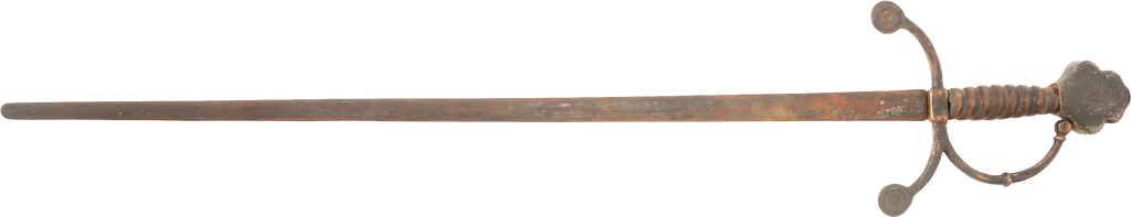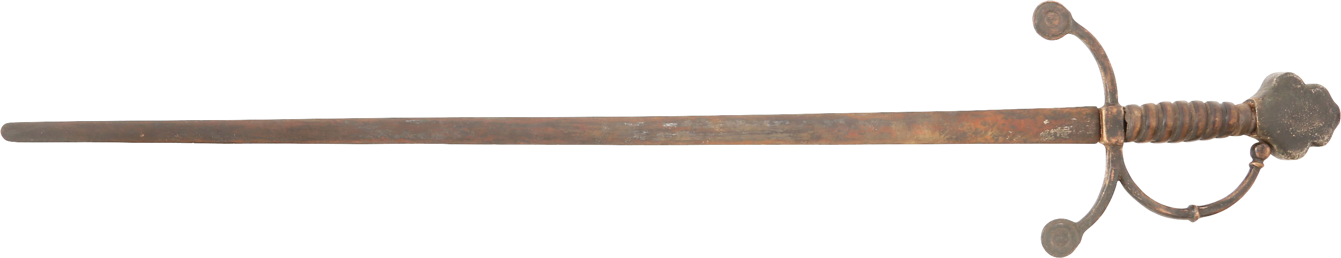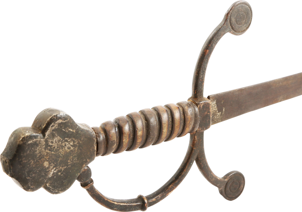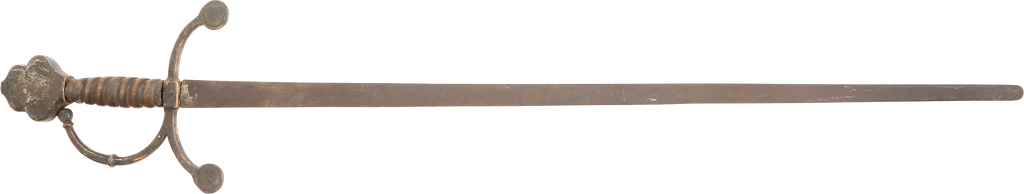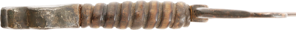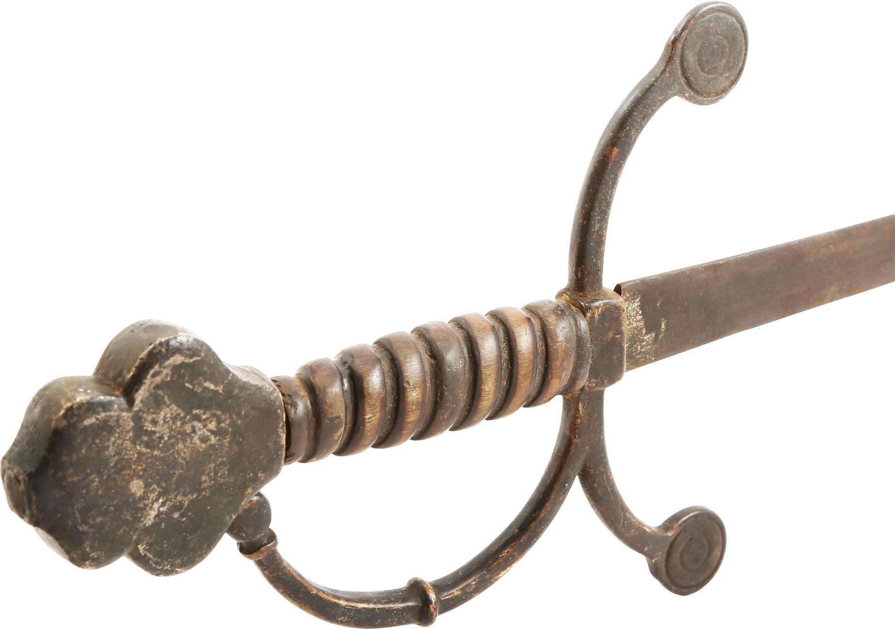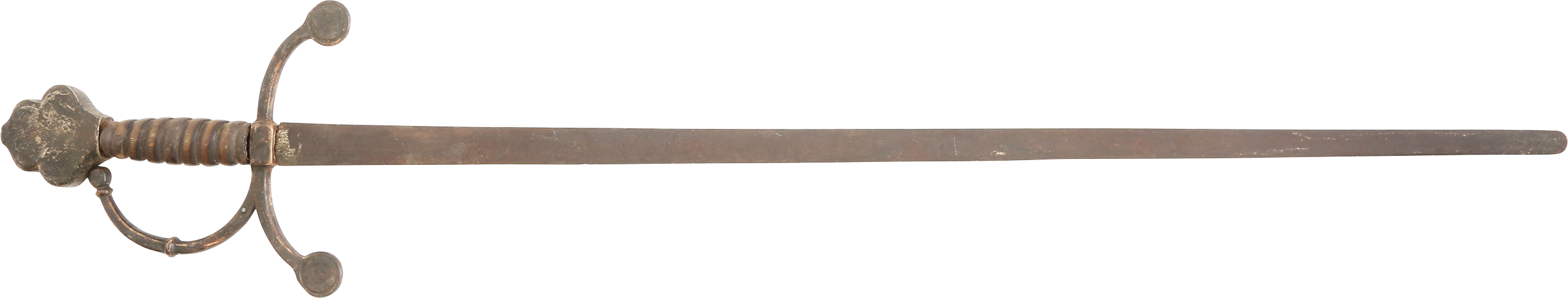 Bronze hilt of falchion form with spirally fluted horn grip. 29 5/8” straight double-edged blade. Blade shows brown surface patina with remnants of old plating. Sound, tight and showing genuine ageing.